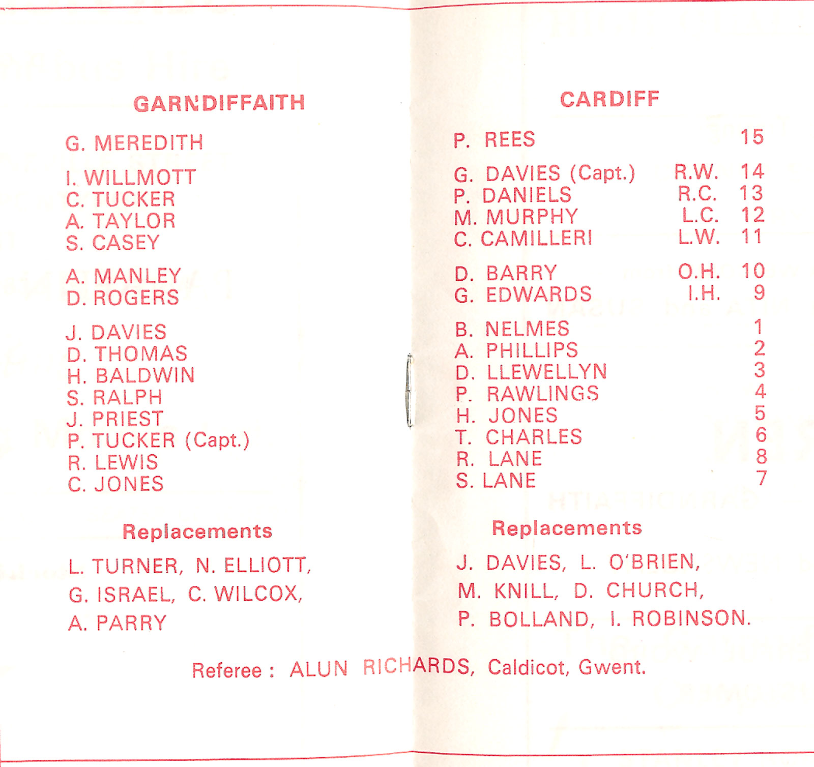 ABERCYNON - ABERAVON - ABERTILLERY - BARGOED - BEDWAS - BLAINA - BONYMAEN - BRIDGEND - CAERPHILLY - CARDIFF - CROSS KEYS - CUP FINALS & SEMI-FINALS - DUNVANT - EBBW VALE - FELINFOEL - GLAMORGAN WANDERERS - LLANDOVERY - LLANELLI - LLANHARAN - MAESTEG - MERTHYR - NEATH - NEWBRIDGE - NEWPORT - OSPREYS - PENARTH - PONTYPOOL - PONTYPRIDD - RESOLVEN - RUMNEY - SOUTH WALES POLICE - ST PETERS - SWANSEA - TENBY - TREDEGAR - TREORCHY - UWIC - YSTRADGYNLAIS - WELSH COUNTIES & REGIONAL |