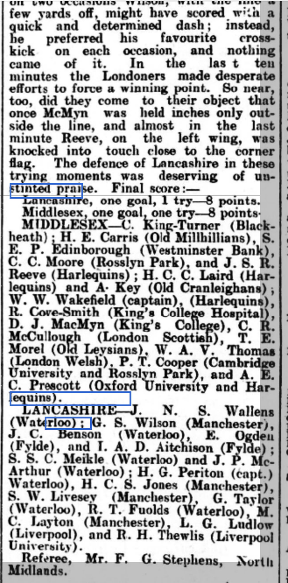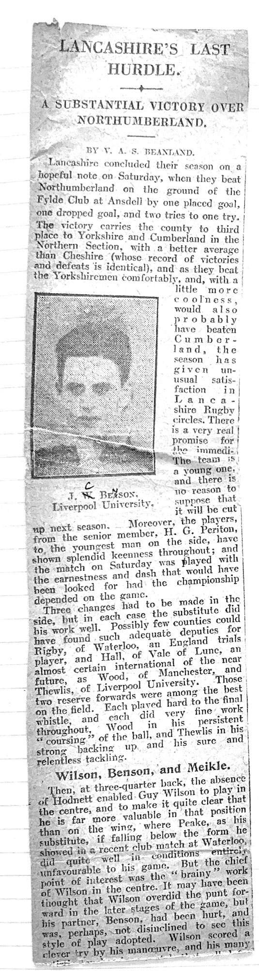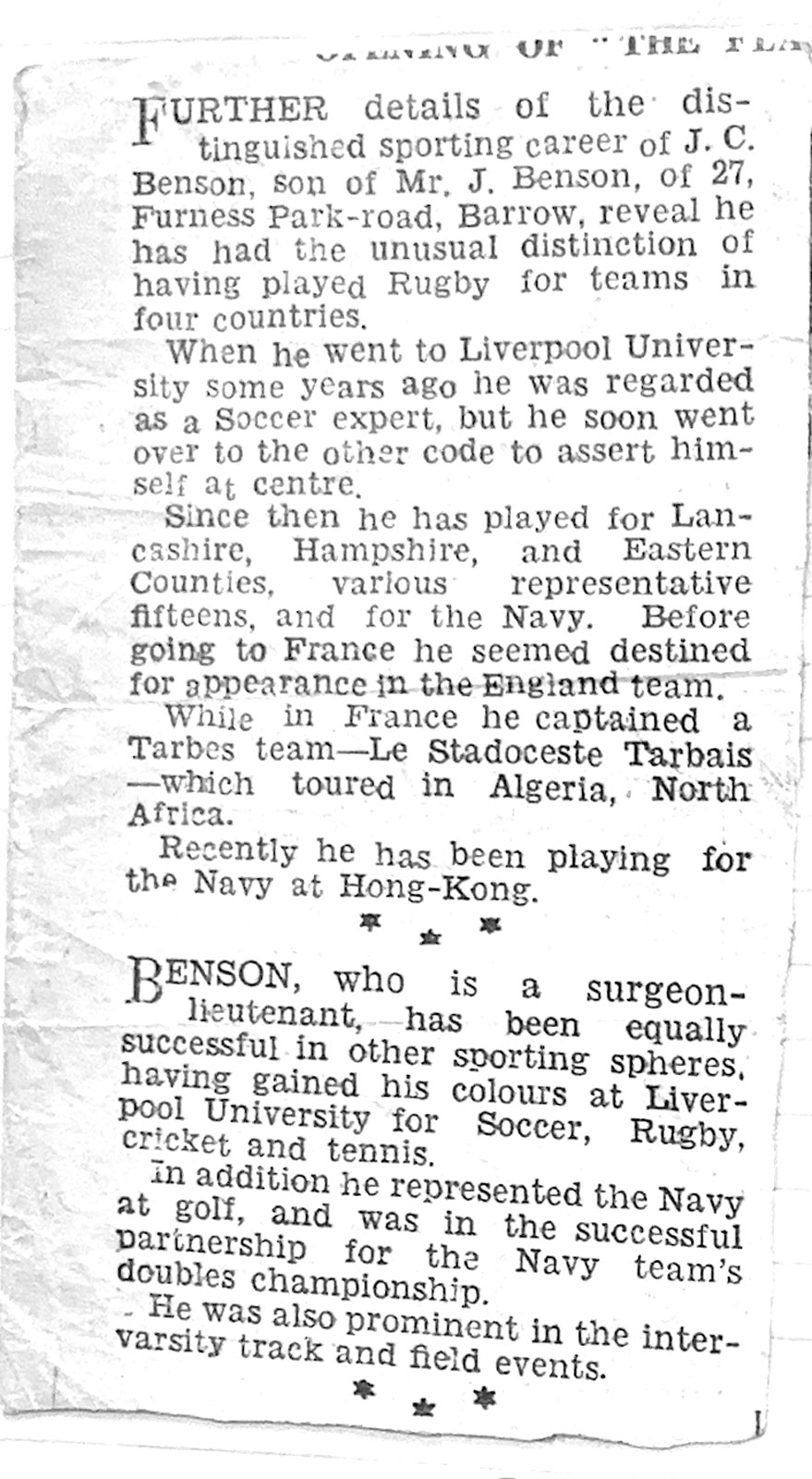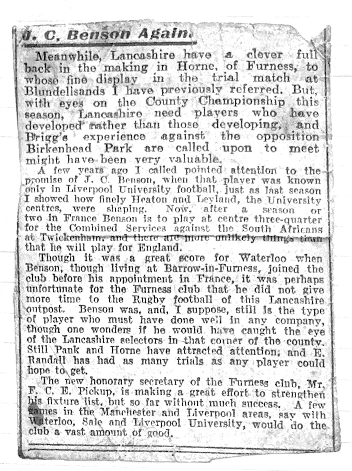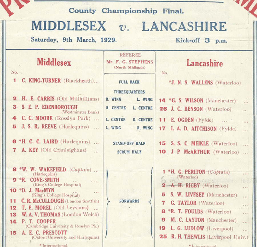 Middlesex v Lancashire - a report by the Yorkshire Post (11th March 1929) of the RU County Final at Twickenham on Saturday 9th March, 1929 between Middlesex and Lancashire which was tied 8-8. JC Benson laying off the ball to his winger who scored in the corner. Later that same year, Jack took up a post in Tarbes, France as the village/town Dentist. He developed the Tarbes Rugby team and took them on tour to North Africa as Captain. The re-play in Lancashire soon afterwards was won by Middlesex 9-8 with Benson scoring the only try for Lancashire. |