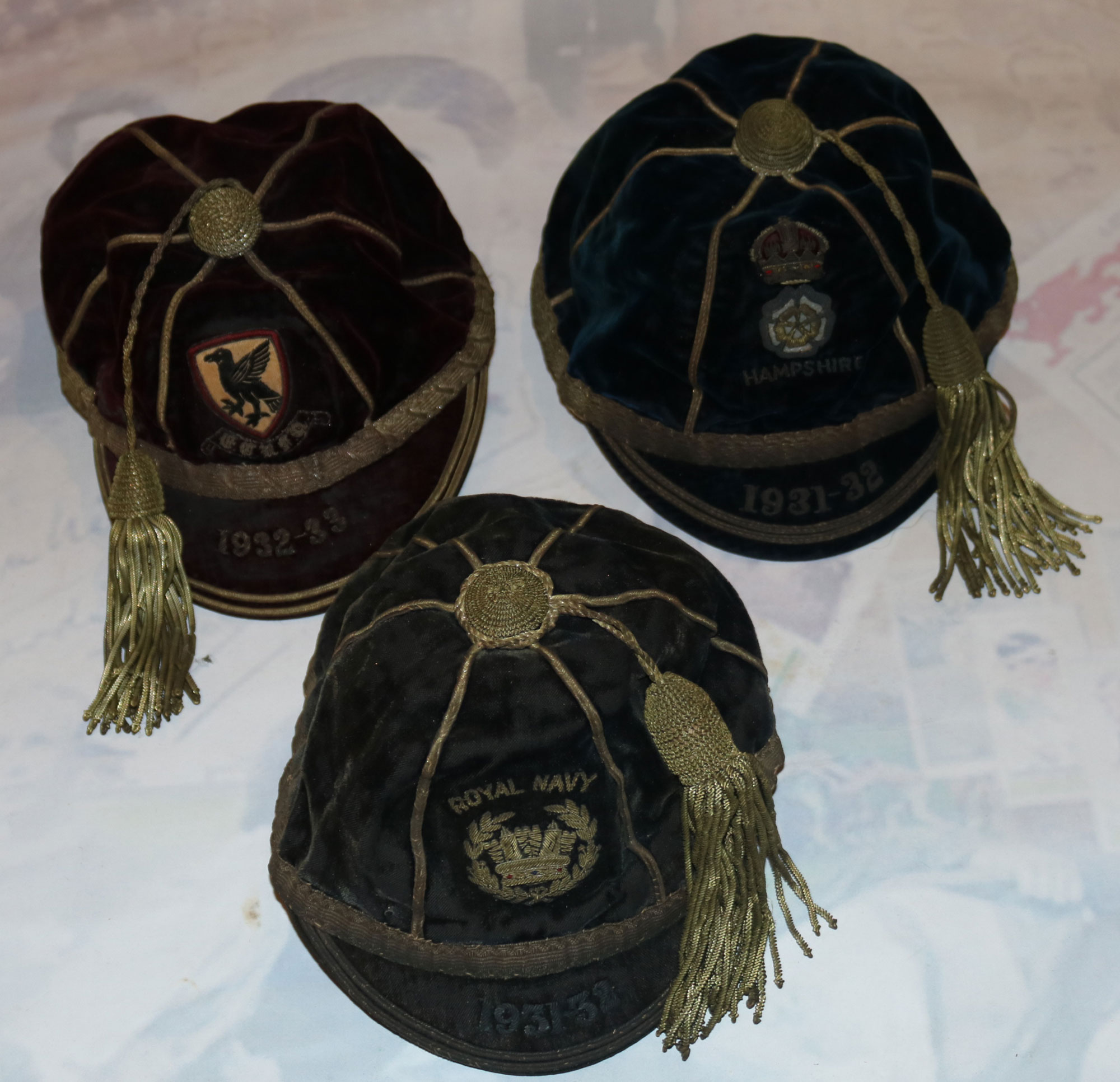 The honours cap collection of John Cowin Benson known as Jack or JC Benson. Hampshire, Eastern Counties and Royal Navy. More details........... |