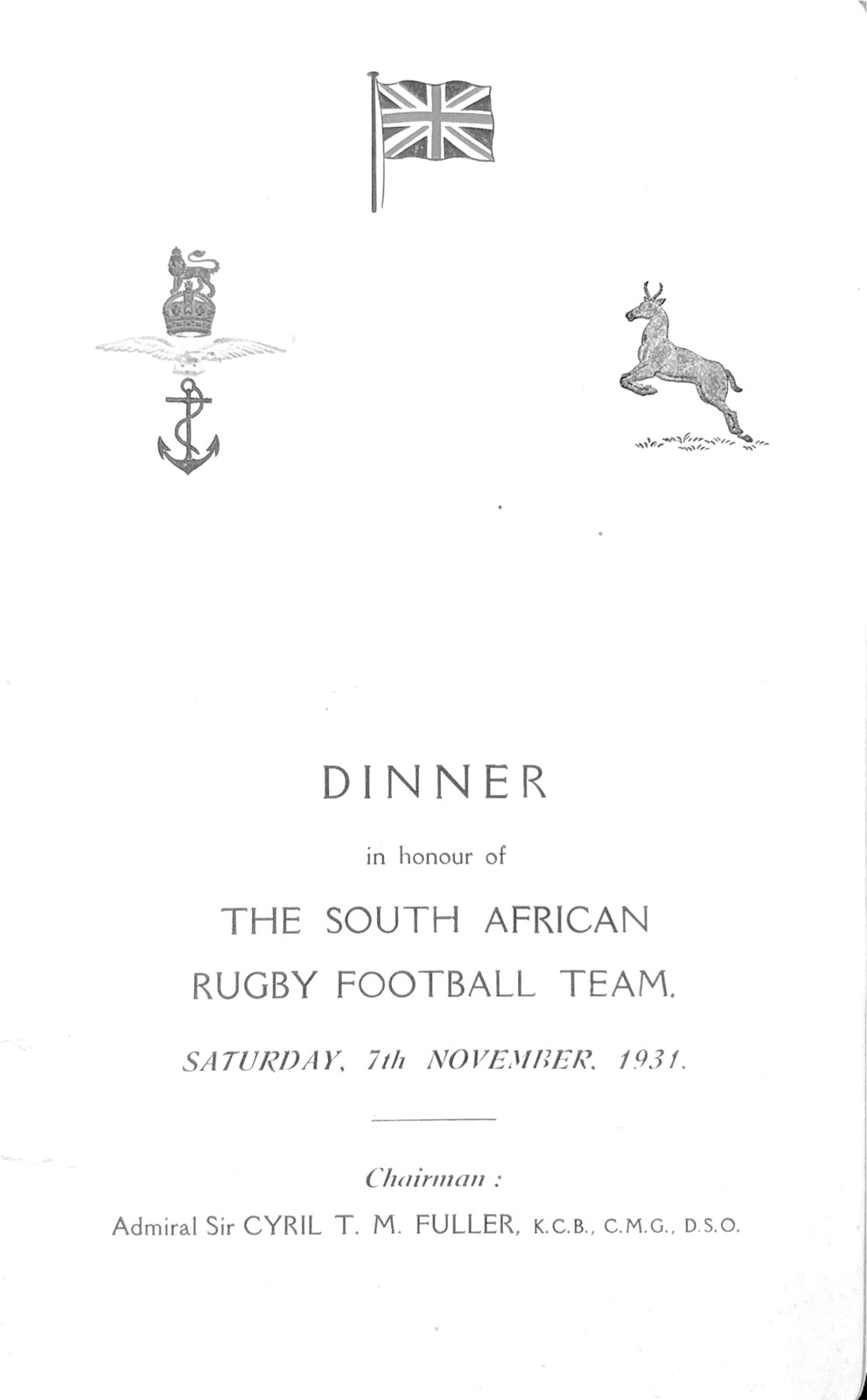 42 | dinner menu card for Combined Services against teh Springboks in 1931 |