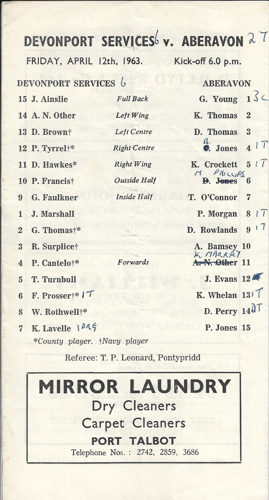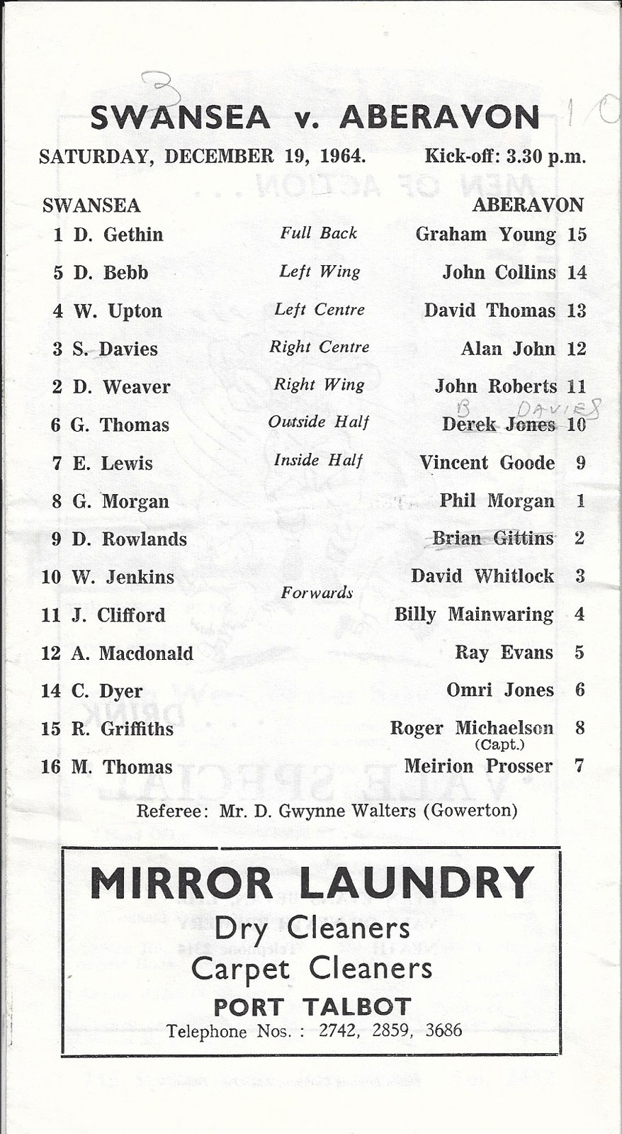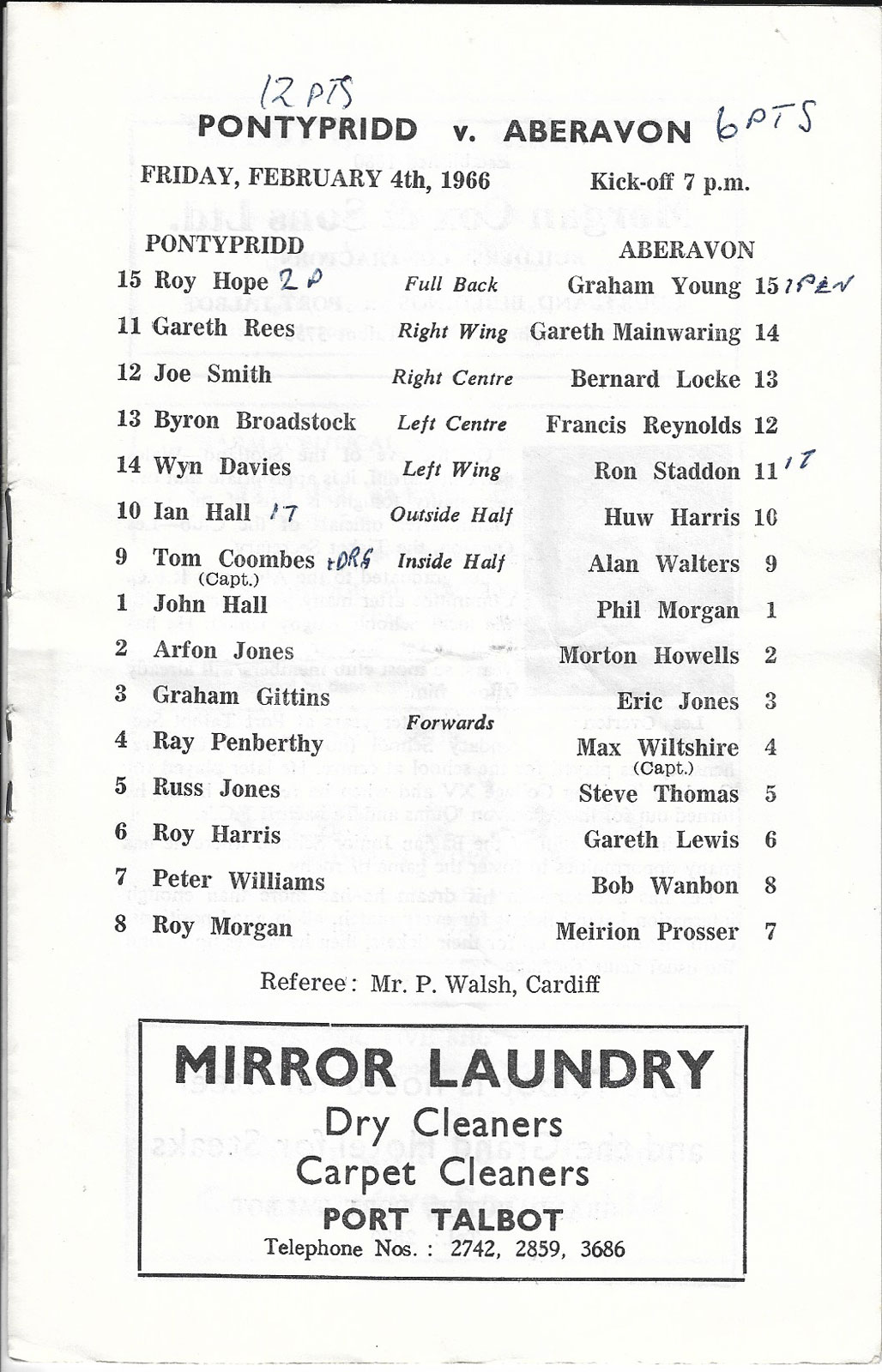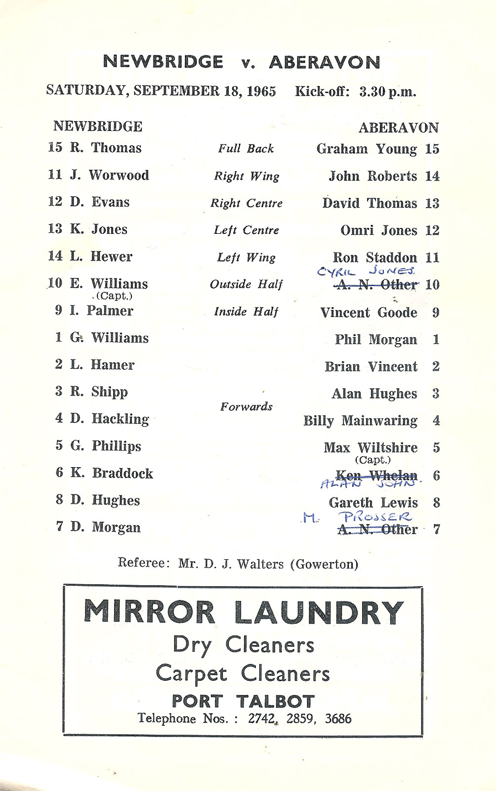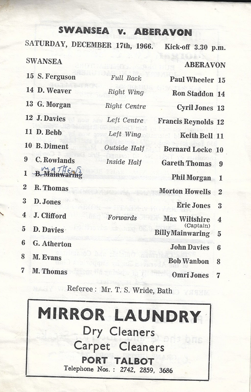 for Aberavon RFC away programmes please visit our other club programme pages......... Bath - Bridgend - Cardiff - Ebbw Vale - English Clubs - Gloucester - Irish Clubs - Irish Provincial - Llanelli & Scarlets - Maesteg - Neath - Newbridge - Newport - Pontypool - Pontypridd - Saracens - Scottish Club - Swansea - Welsh Clubs |