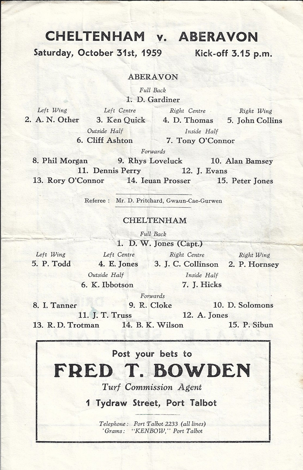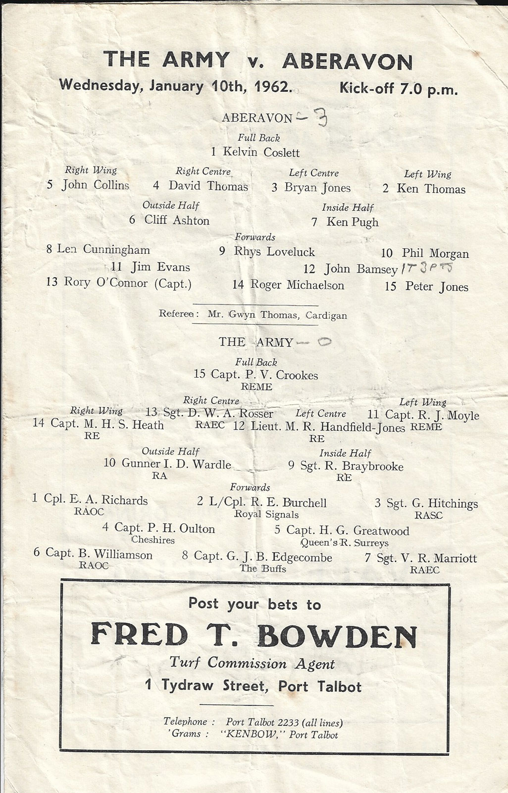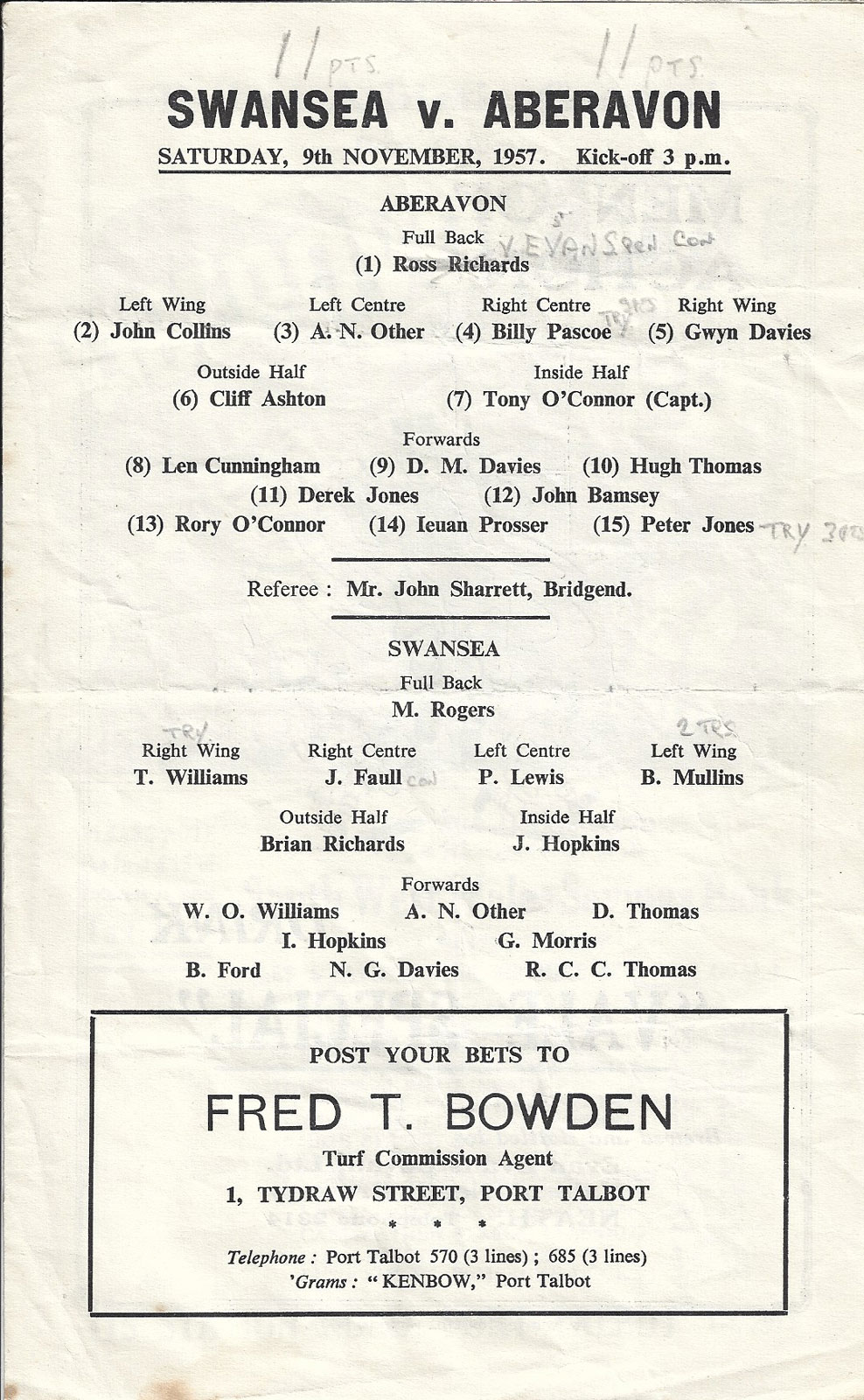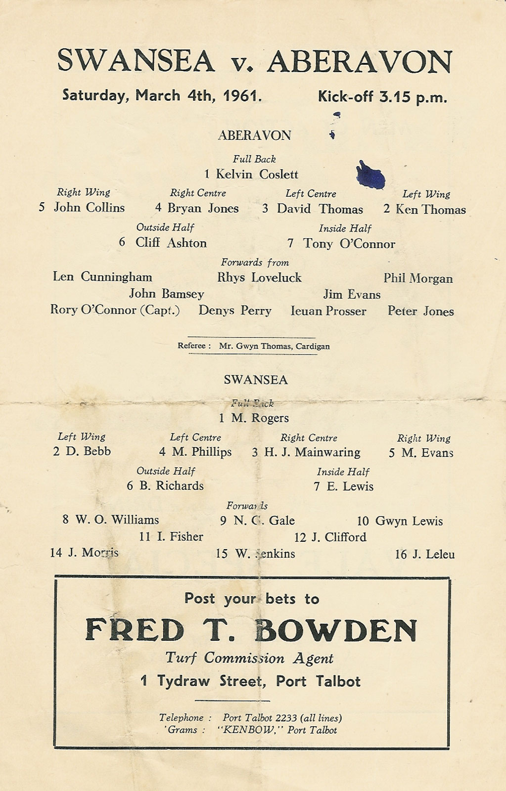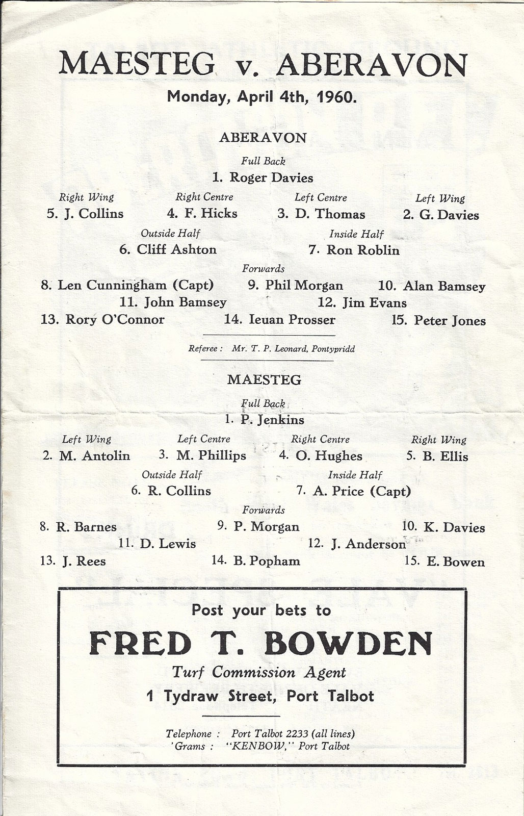 Aberavon v Neath | 28 Feb 1959 | Aberavon | 3-6 | good - folding creases, a little
