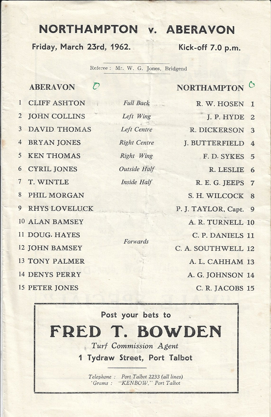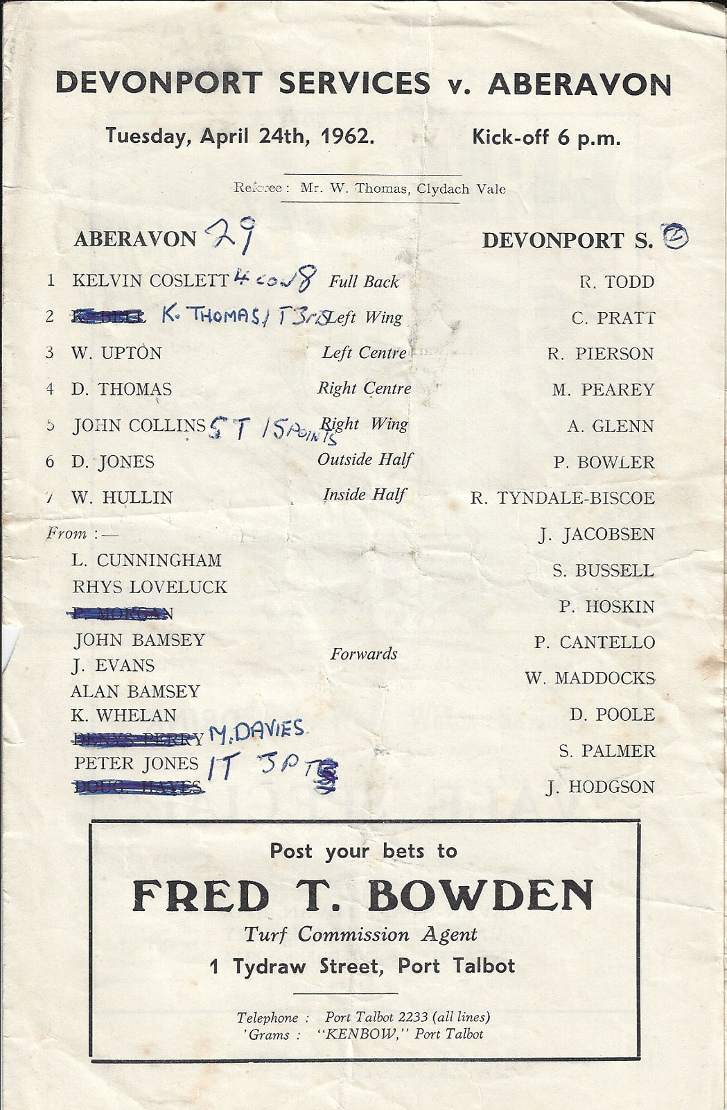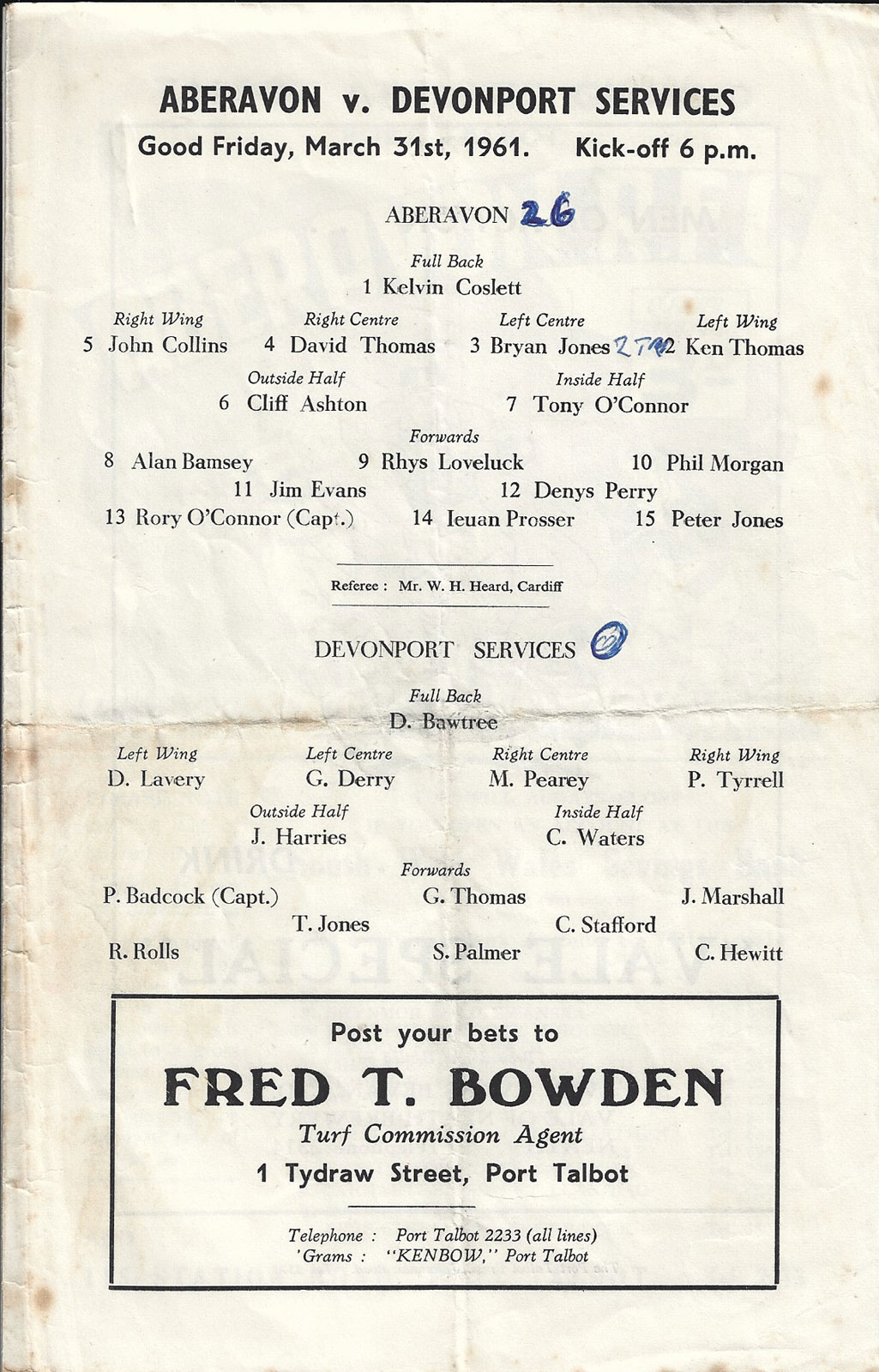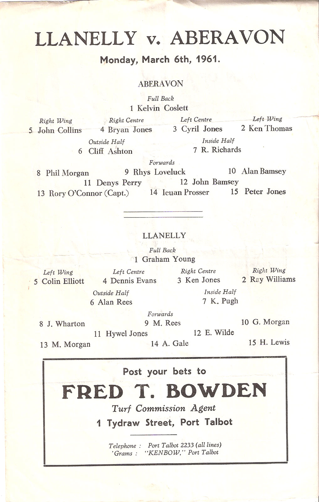 Aberavon v Neath | 28 Feb 1959 | Aberavon | 3-6 | good - folding creases, a little