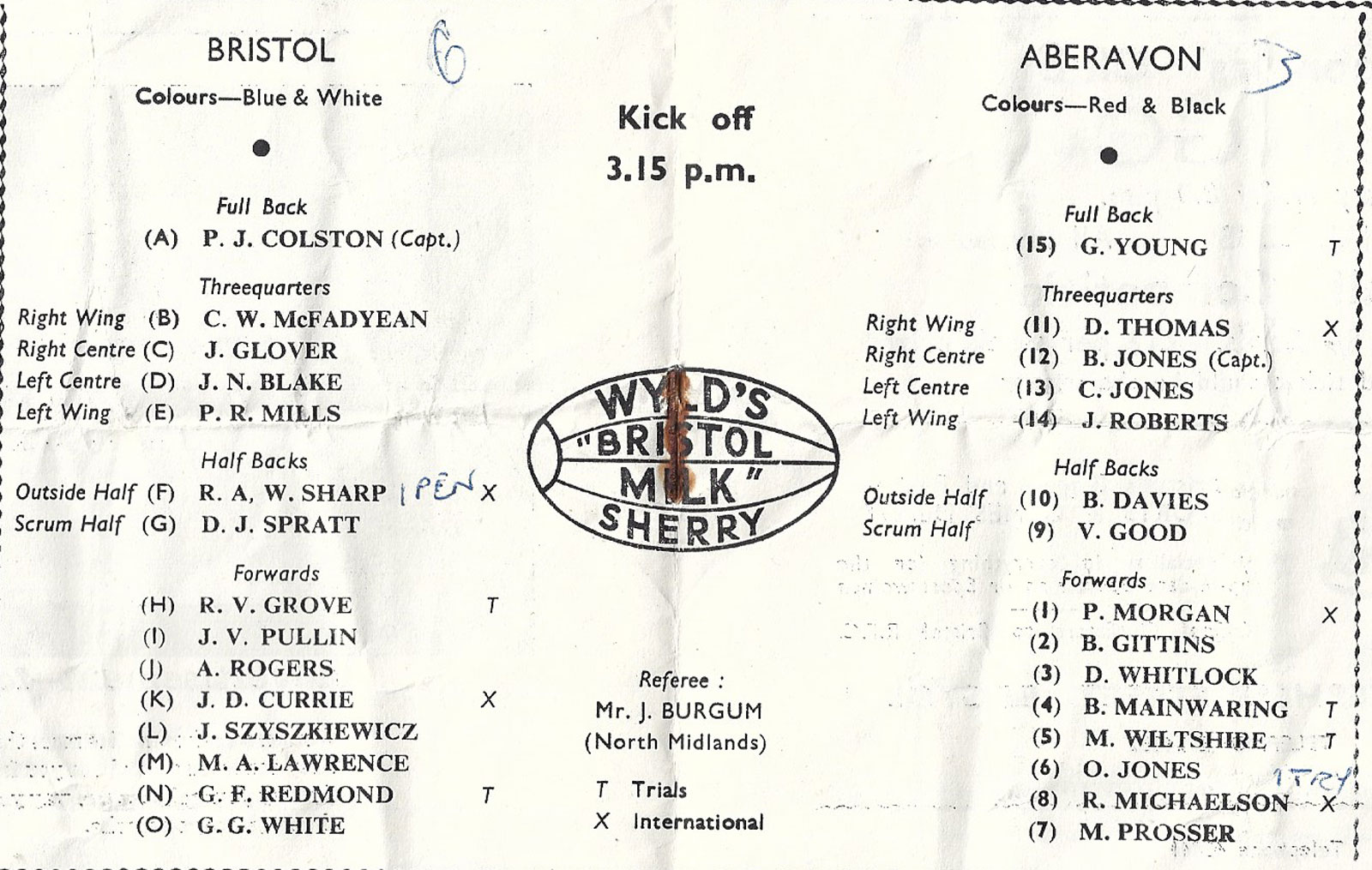 Bristol v Rex Willis's International XV | 8 Apr 1957 | Bristol | good - folding creases, slightly