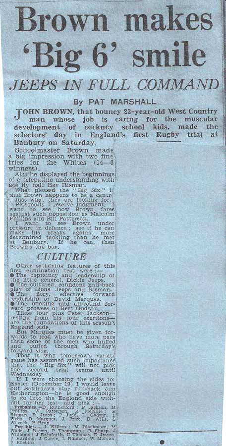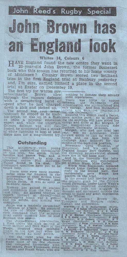 TEAMS PLAYED FOR AND REPRESENTATIVE HONOURS Somerset Schoolboys England Air Training Corps 1953 (v Wales at Neath) England Schools 1953 (v Wales at Cardiff, v France at Exeter)