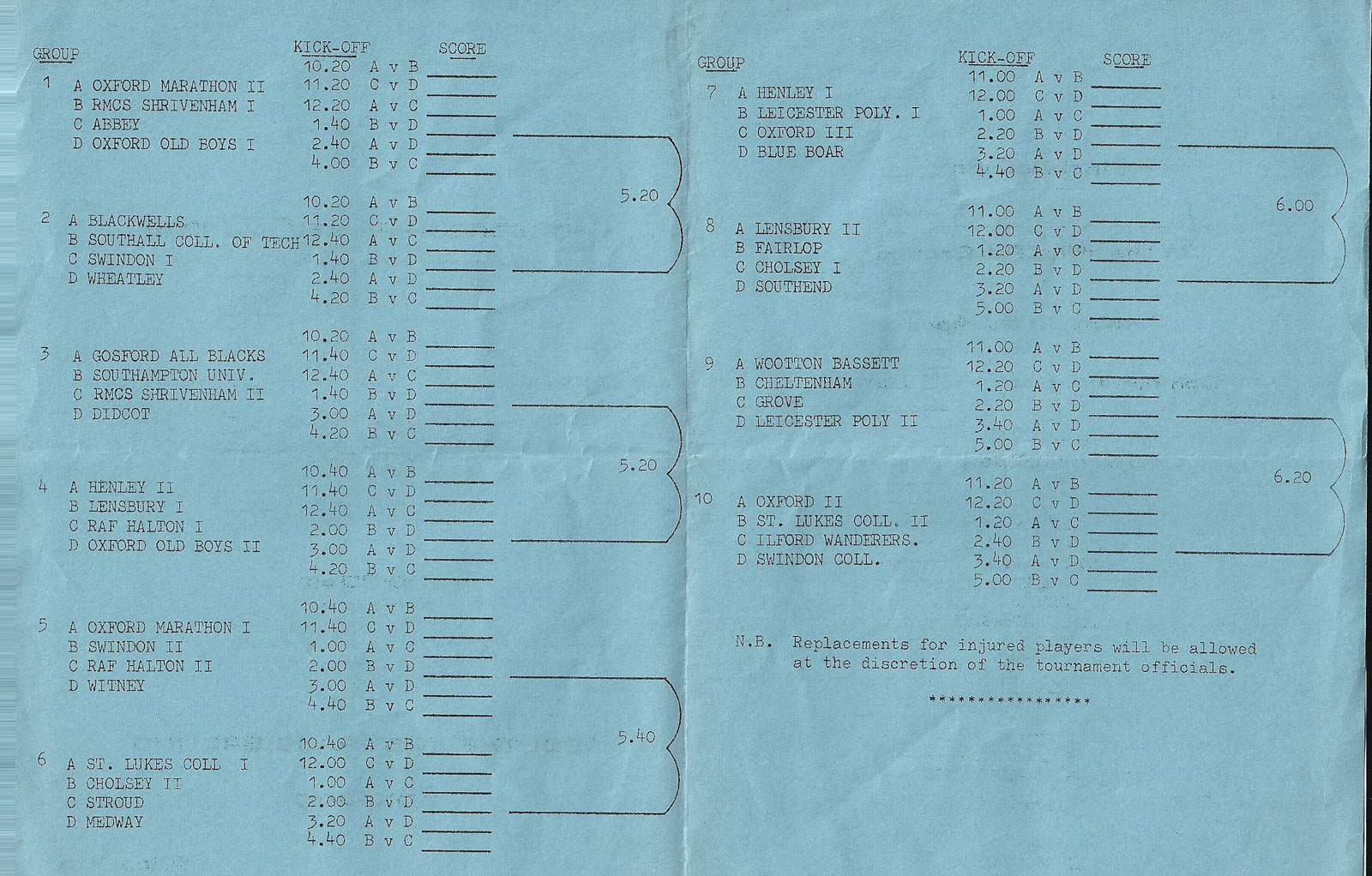 OXFORDSHIRE SEVENS - Preliminary Rounds - teams include Abbey, RAF Halton, Wheatley, Stroud and Oxford Old Boys. |