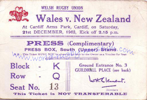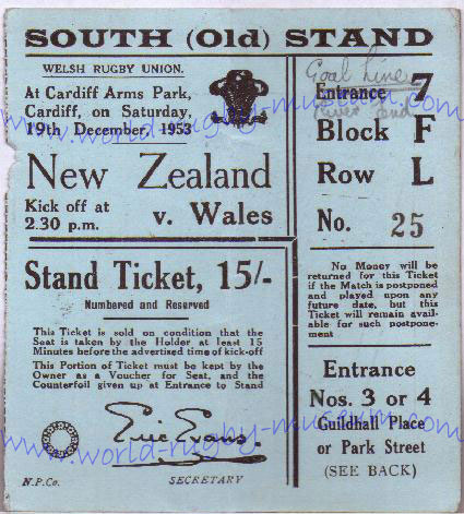 One of my everlasting memories of watching Welsh rugby in the 1970s is stepping off the train at Cardiff to the sound of "Any spare tickets, any spares". Cockney accents were the first you'd hear, ticket touts down for the day from London. Then walking down Westgate Street and on every corner there was also someone looking for or selling tickets, the tickets selling for the biggest prices were always sold outside the Angel Hotel. Then there would be the swappers, "East for a West", "A stand for two fields". The life of a rugby ticket is a strange one. As far as its value goes it is an up and down affair. Usually it is sold at the price marked on the ticket, if the ticket is for a big match that is a sell out then it can reach up to ten times its value on the black market. Once a game kicks off its virtually worthless and often dropped by spectators at the venue. Some tickets find their way into collections and the collectors market where the value can rise to sometimes exceed its original price. A strange life indeed Below is a selection of tickets for international and other matches through the ages. How many of these were sold on the black market I wonder ? For a closer view of each ticket please click on the image. |