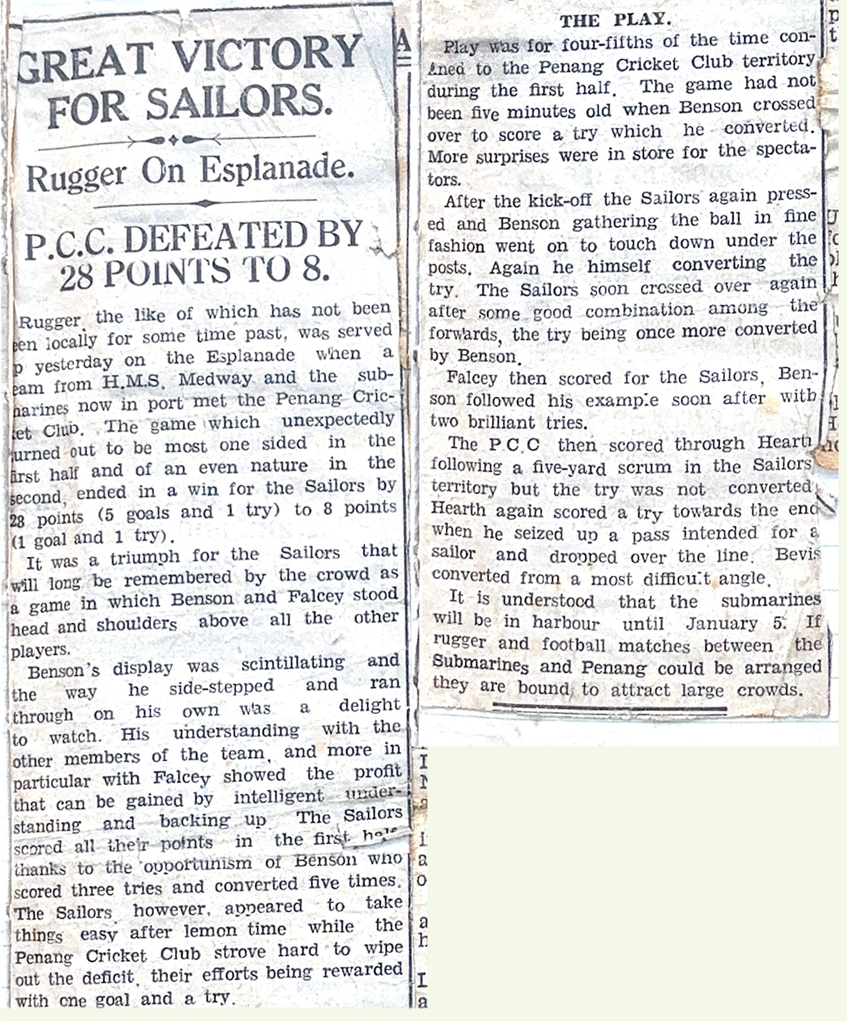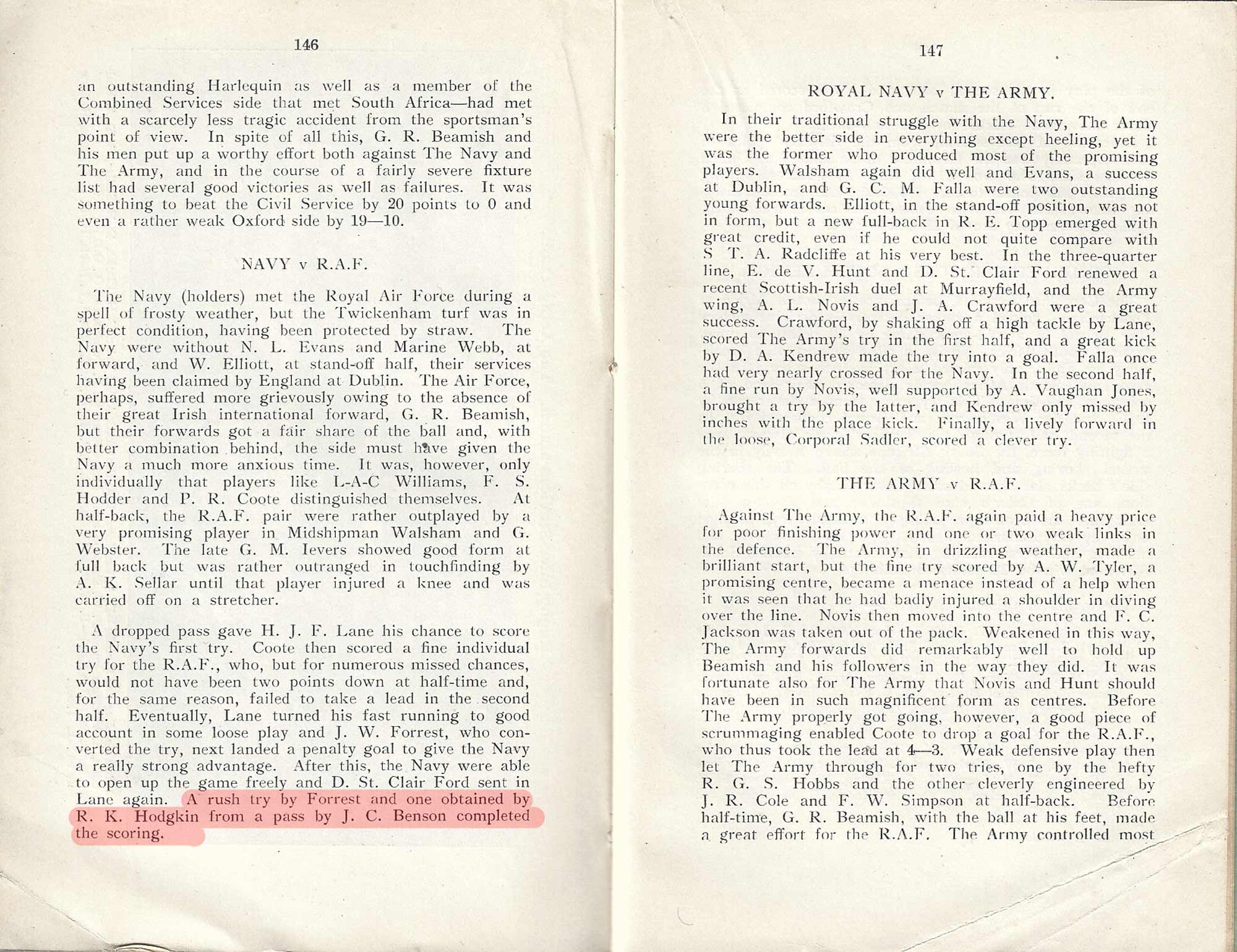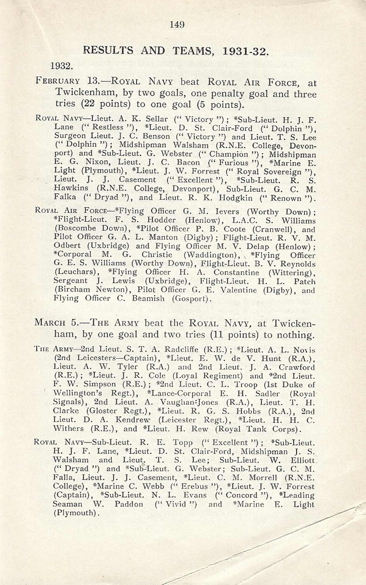 This publication contains information about the inter-services championship of 1931-32 and includes one mention of Jack in the match against the RAF at Twickenham where he completed a pass for R.K. Hodgkin to score a try. Going into the triangular tournament, the Royal Navy were defending champions, but lost their title to the Army. Jack is not shown as playing against the Army. |