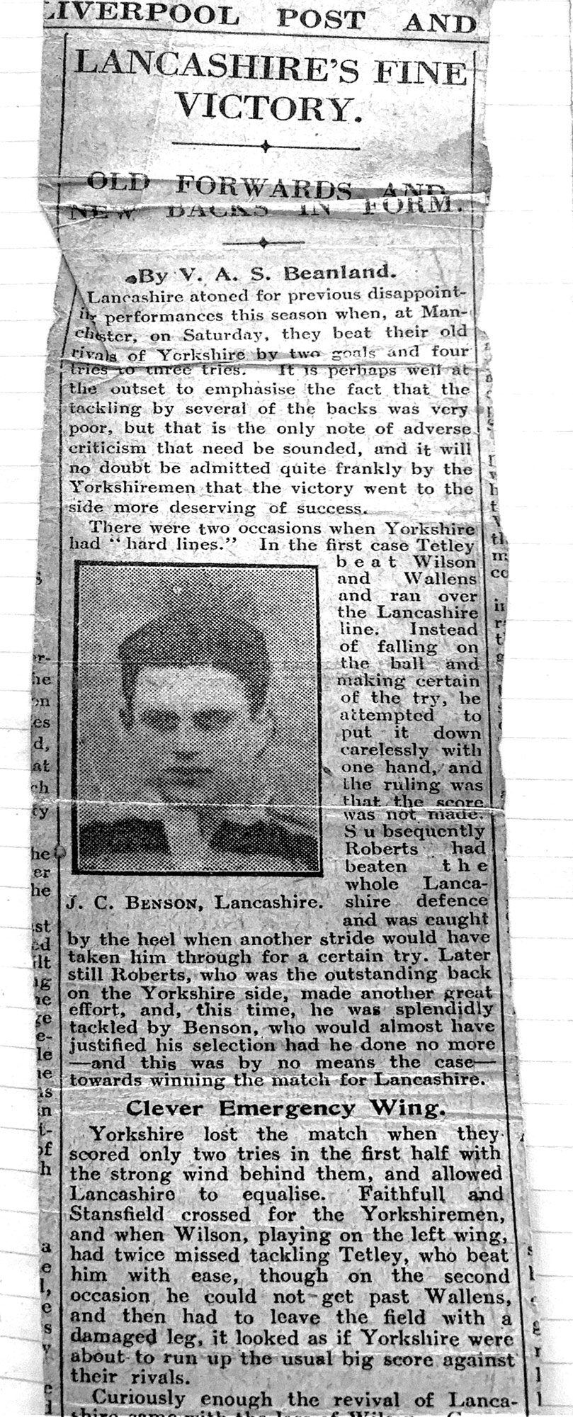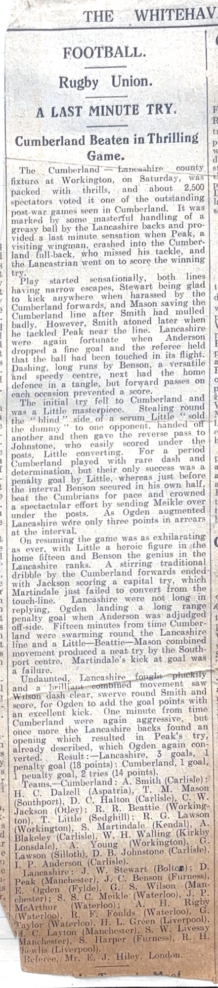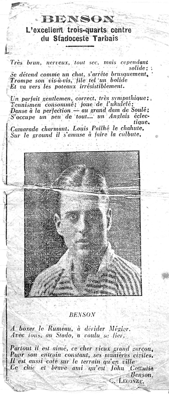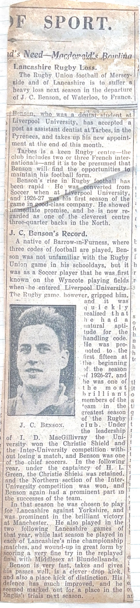 Middlesex v Lancashire - a report by the Yorkshire Post (11th March 1929) of the RU County Final at Twickenham on Saturday 9th March, 1929 between Middlesex and Lancashire which was tied 8-8. JC Benson laying off the ball to his winger who scored in the corner. Later that same year, Jack took up a post in Tarbes, France as the village/town Dentist. He developed the Tarbes Rugby team and took them on tour to North Africa as Captain. The re-play in Lancashire soon afterwards was won by Middlesex 9-8 with Benson scoring the only try for Lancashire. |