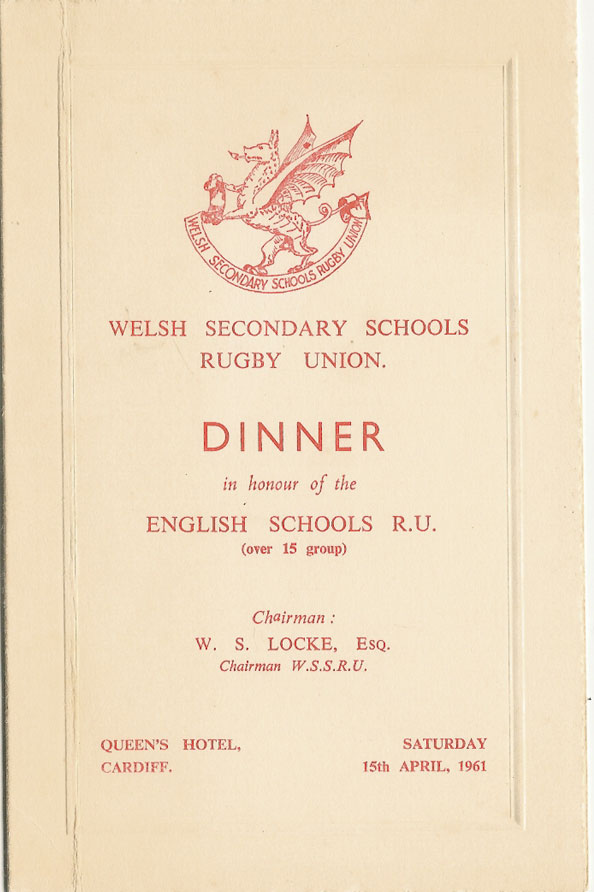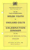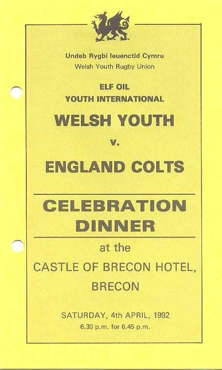16.jpg (24889 bytes) Wales Youth v England Colts 4 Apr 1992 dinner menu