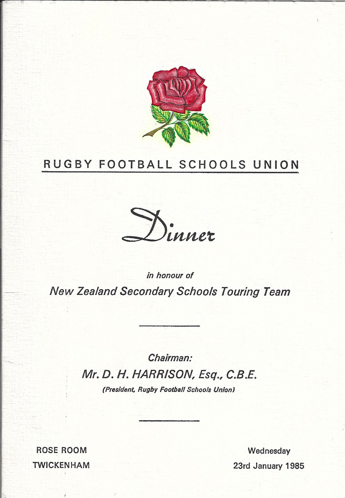 Rugby World Cup Sevens 1993 in Scotland - A dinner menu and guest list in honour of the International Rugby Football Board and Rugby World Cup Sevens Team Managers at Caledonian Hotel, Edinburgh on Thursday 15 April 1993.  Chairman - RG Charters (SRU President). 8 pages very good.