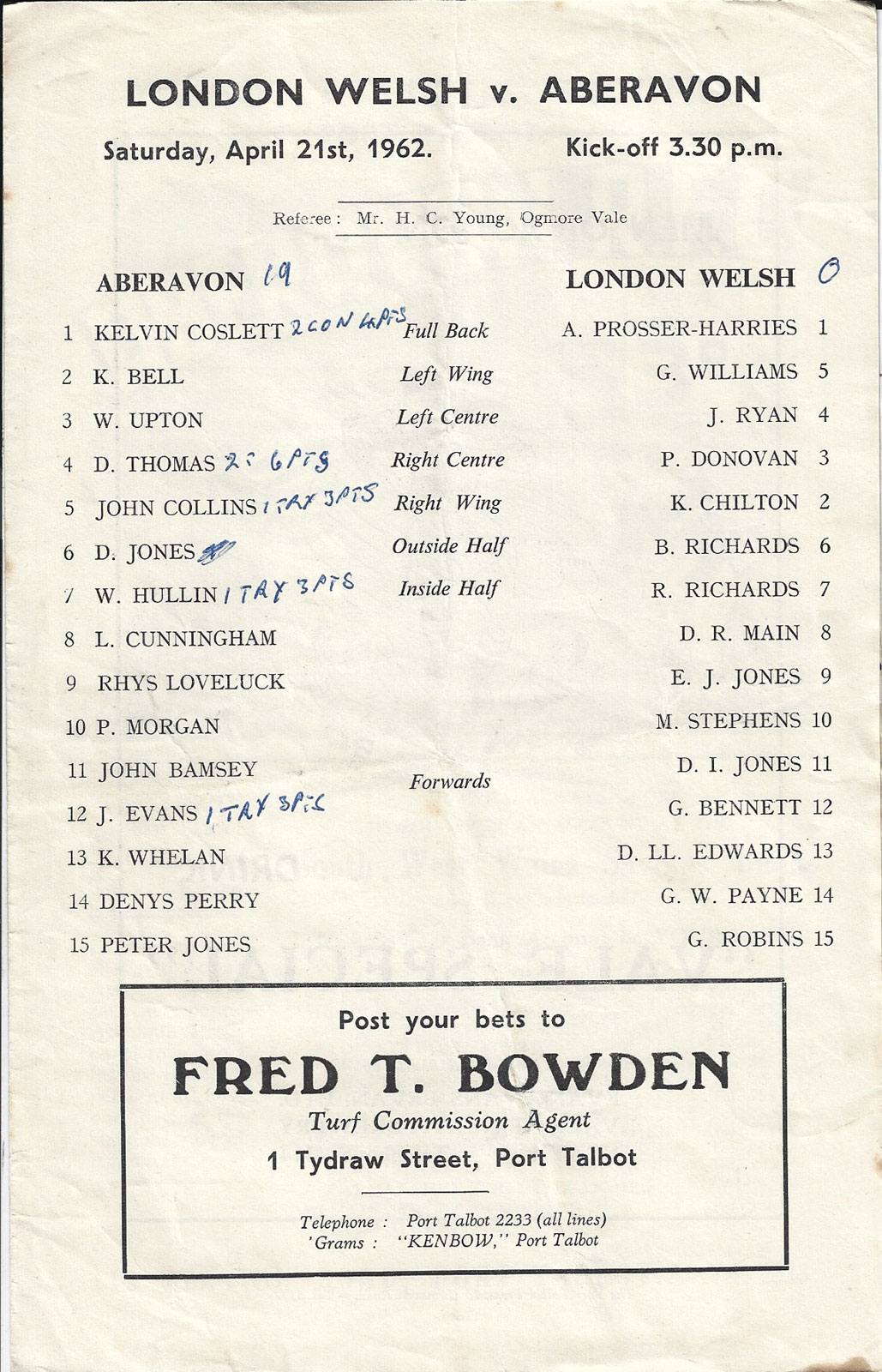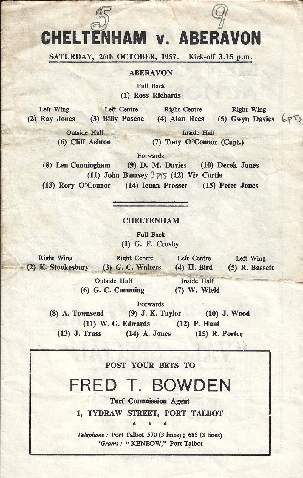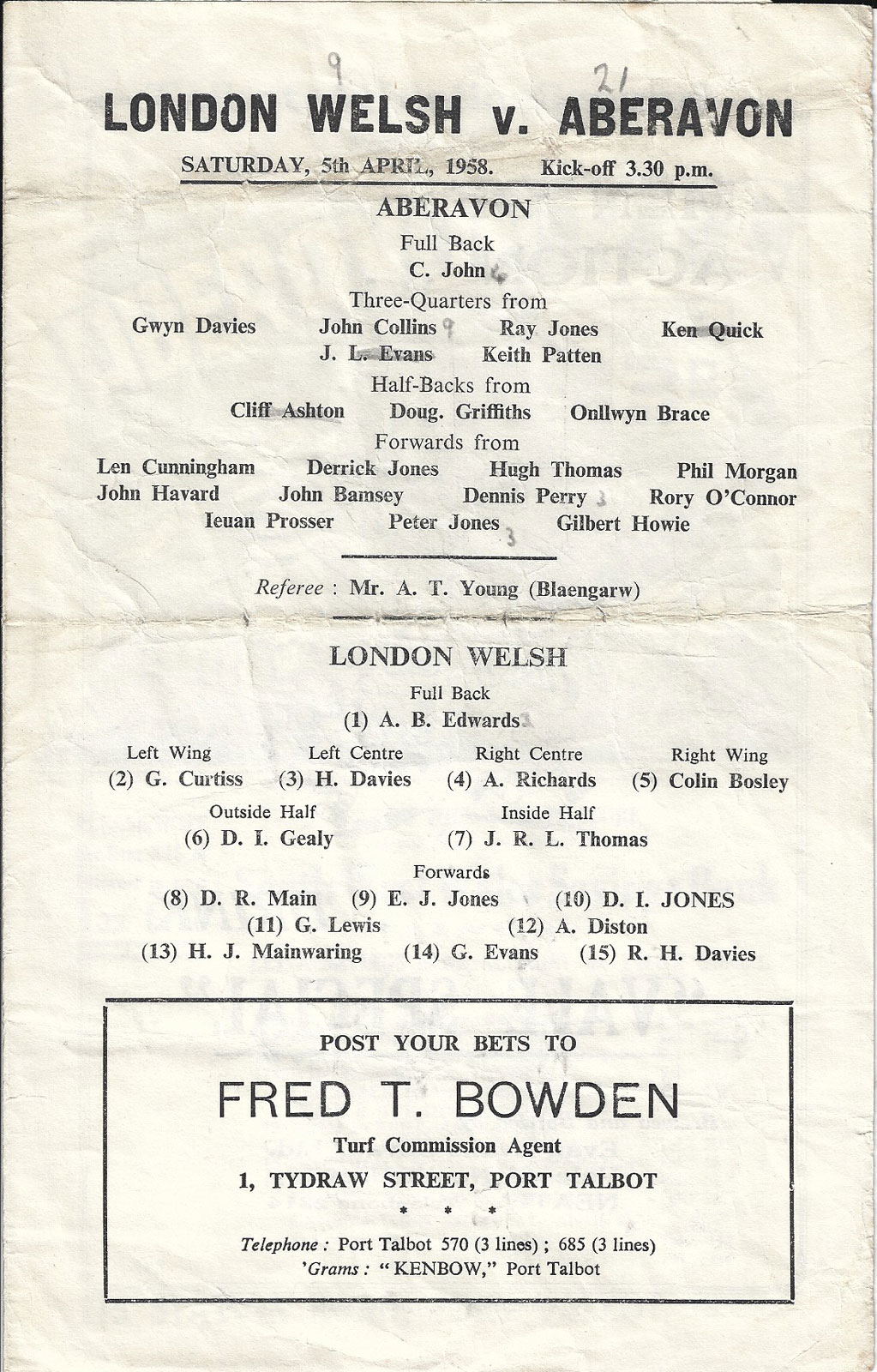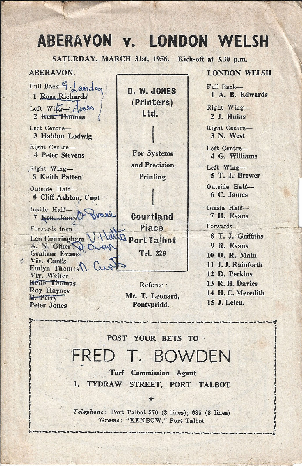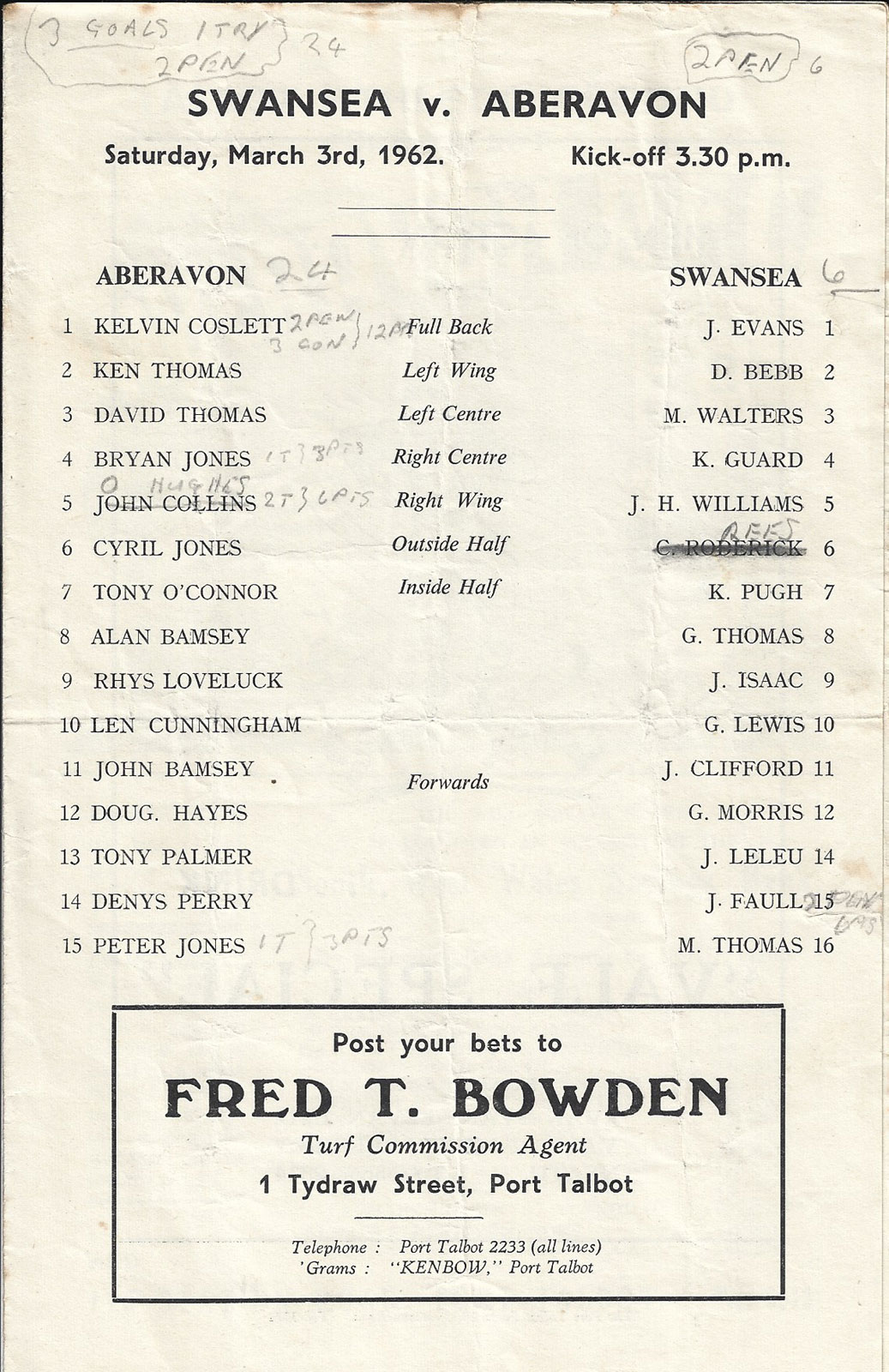 Aberavon v Neath | 28 Feb 1959 | Aberavon | 3-6 | good - folding creases, a little