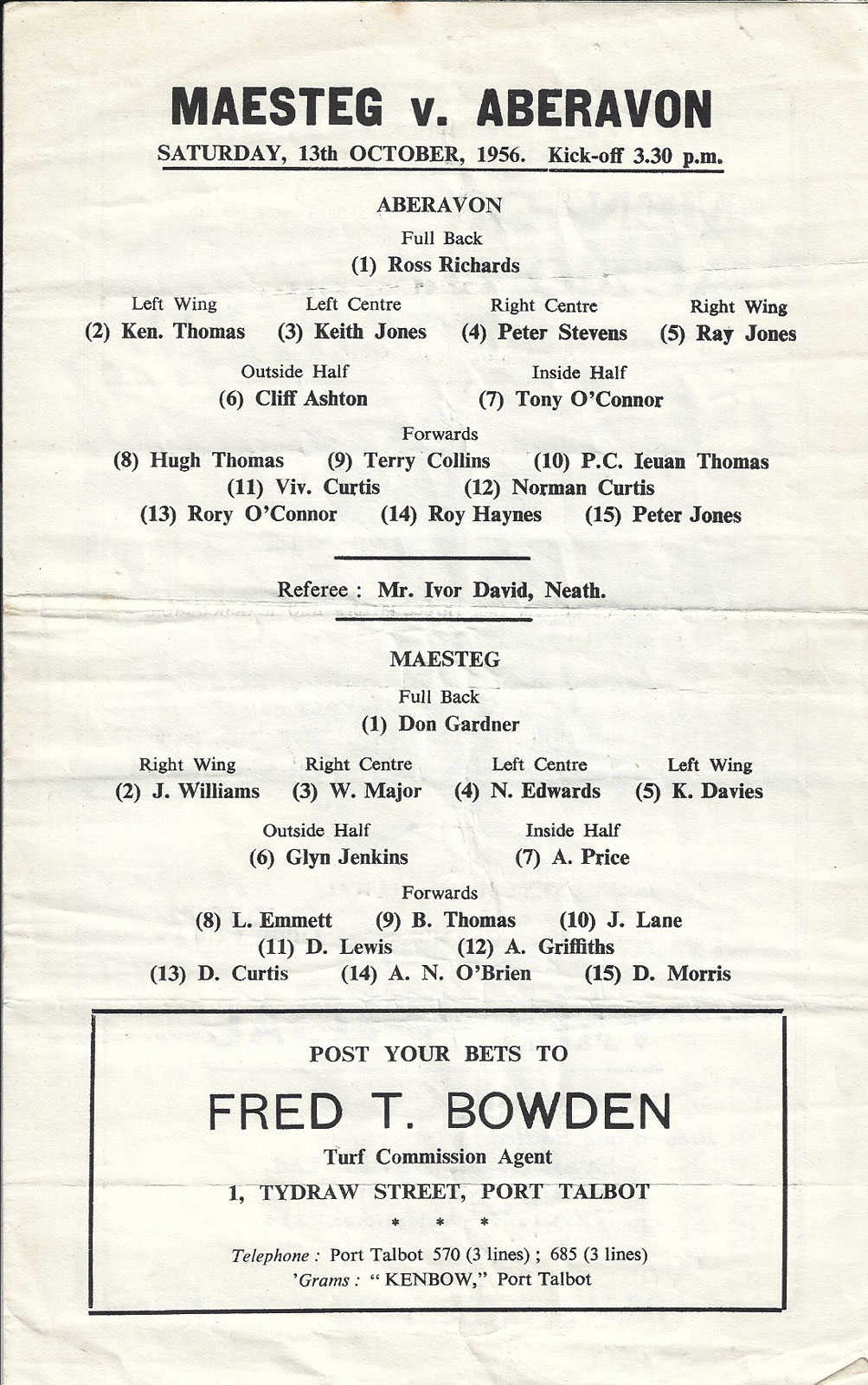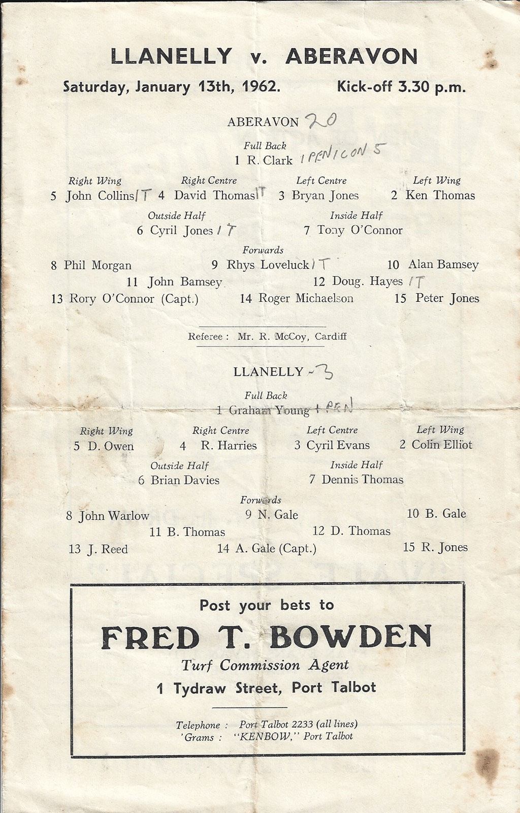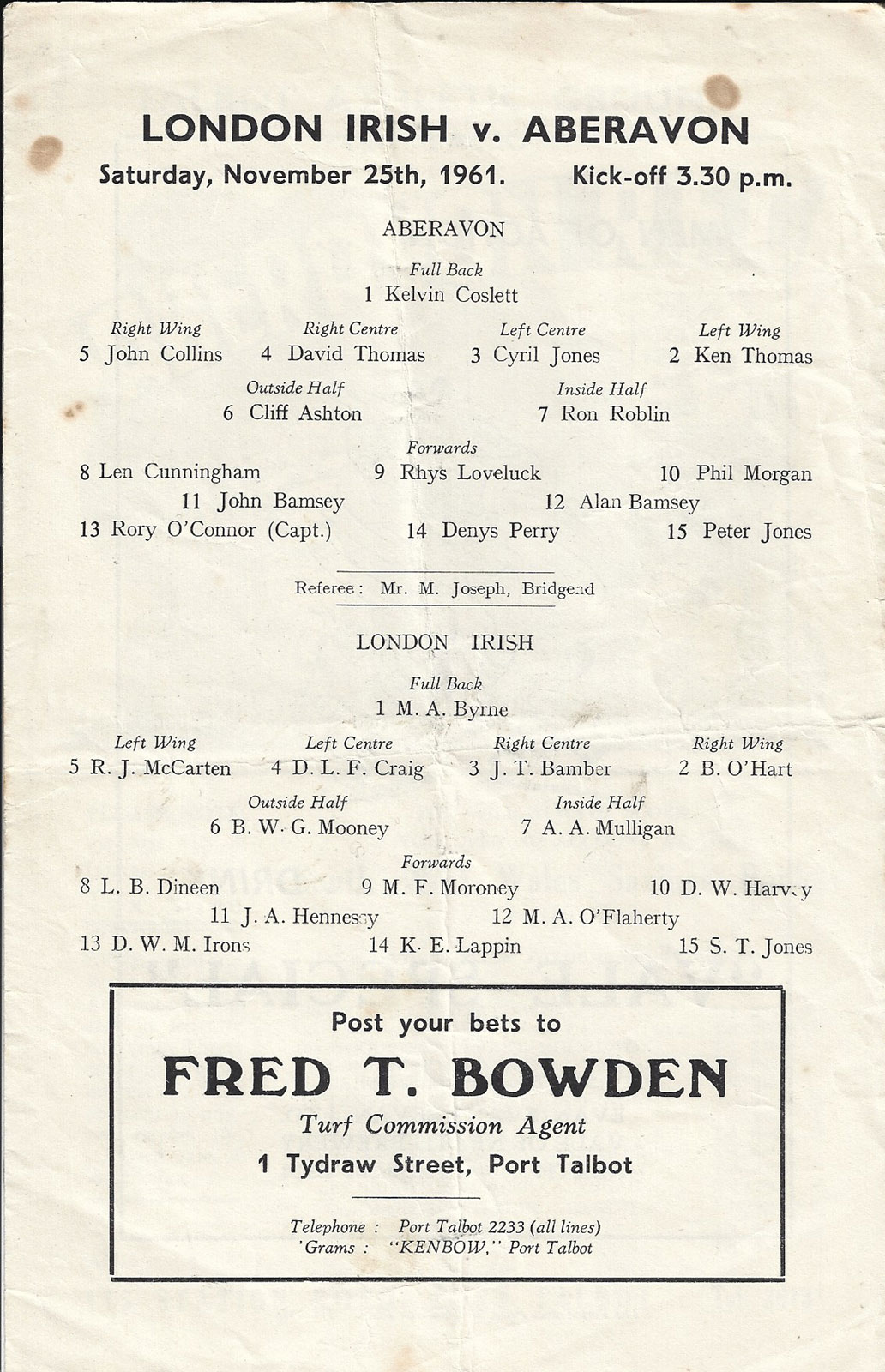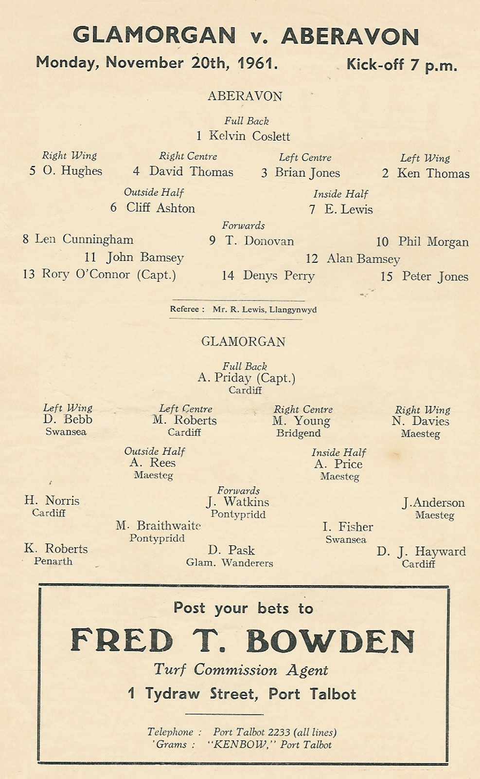 Aberavon v Neath | 28 Feb 1959 | Aberavon | 3-6 | good - folding creases, a little