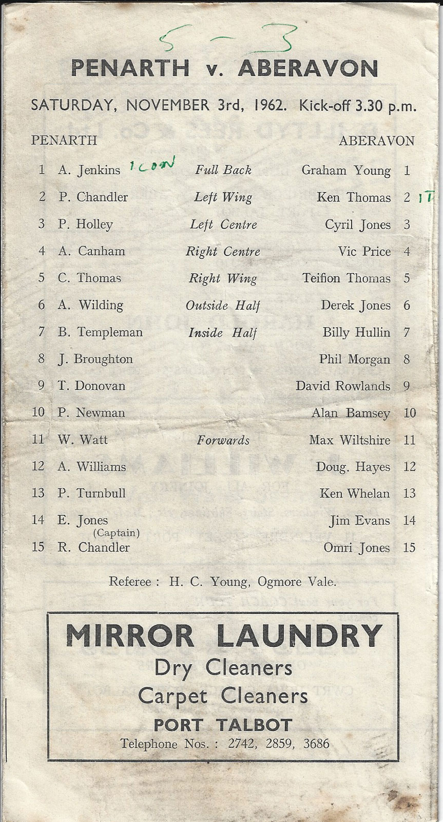Aberavon v Penarth | 2 Jan 1954 | Aberavon | fair - heavy folding creases Ref: B210-E-prcb-aav19540102pen - £6.00 |