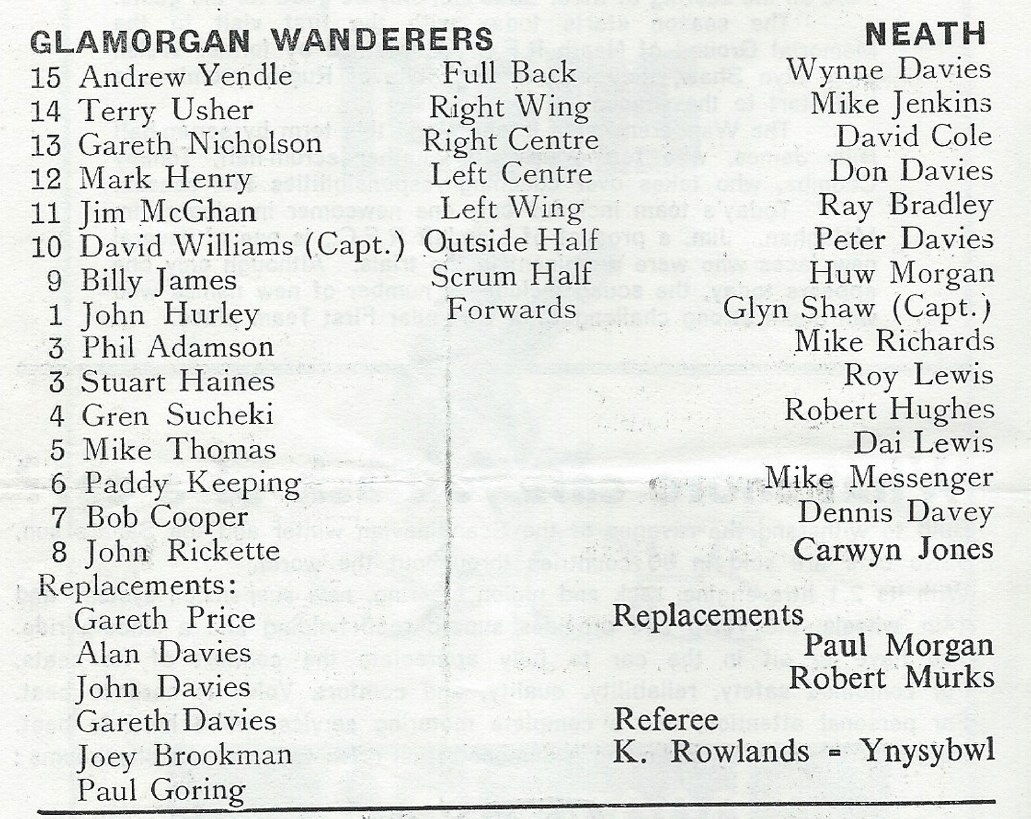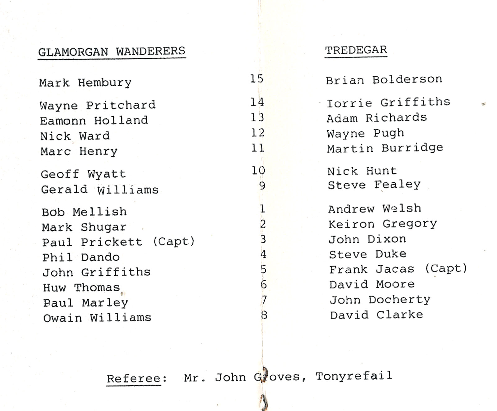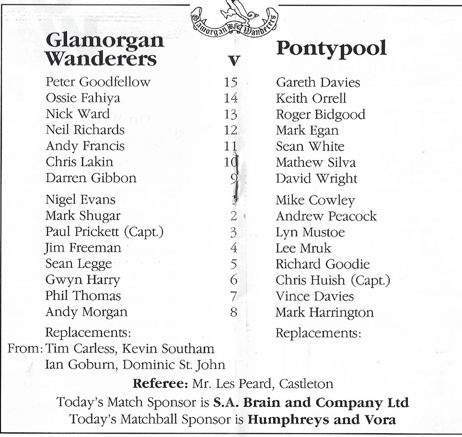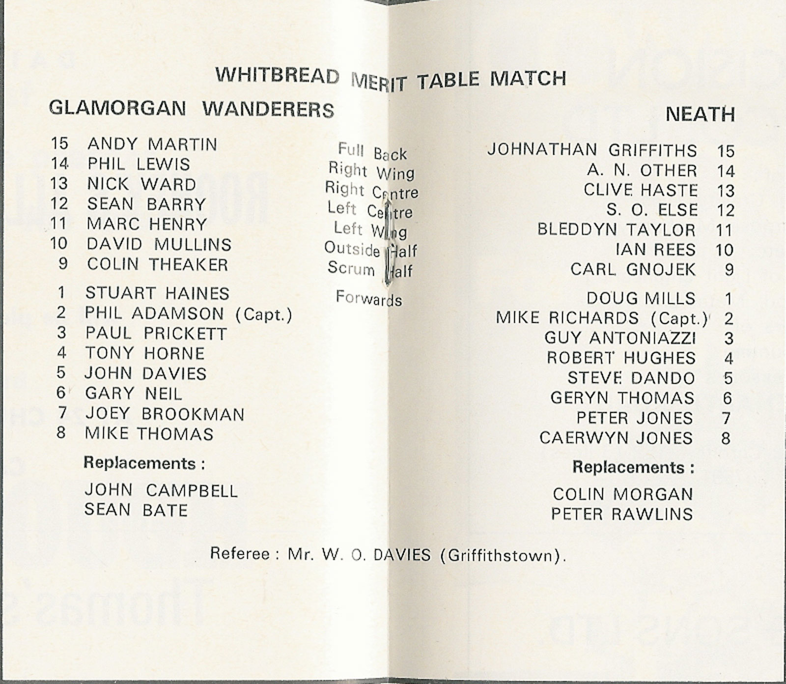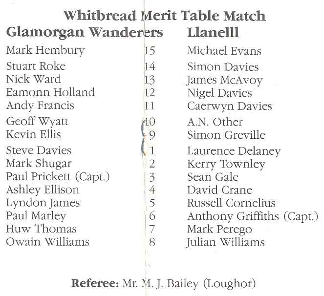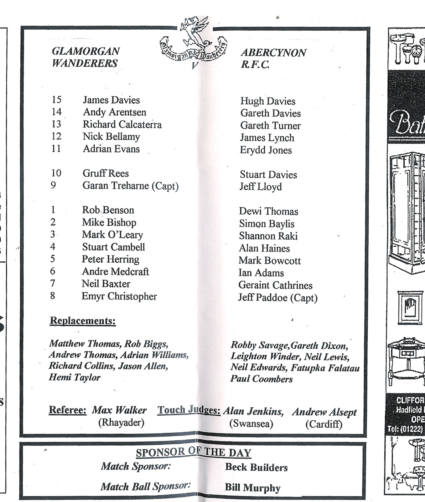 for Glamorgan Wanderers RFC away programmes please visit our other club programme pages......... Aberavon - Bath - Bridgend - Bristol - Cardiff - Ebbw Vale - English Clubs - Gloucester - Harlequins - Irish Clubs - Irish Provincial - Leicester - Llanelli & Scarlets - London Irish - London Scottish - London Welsh - Maesteg - Neath - Newbridge - Newport - Ospreys - Pontypool - Pontypridd - Richmond - Saracens - Scottish Club - Scottish District - Swansea - Welsh Clubs |
