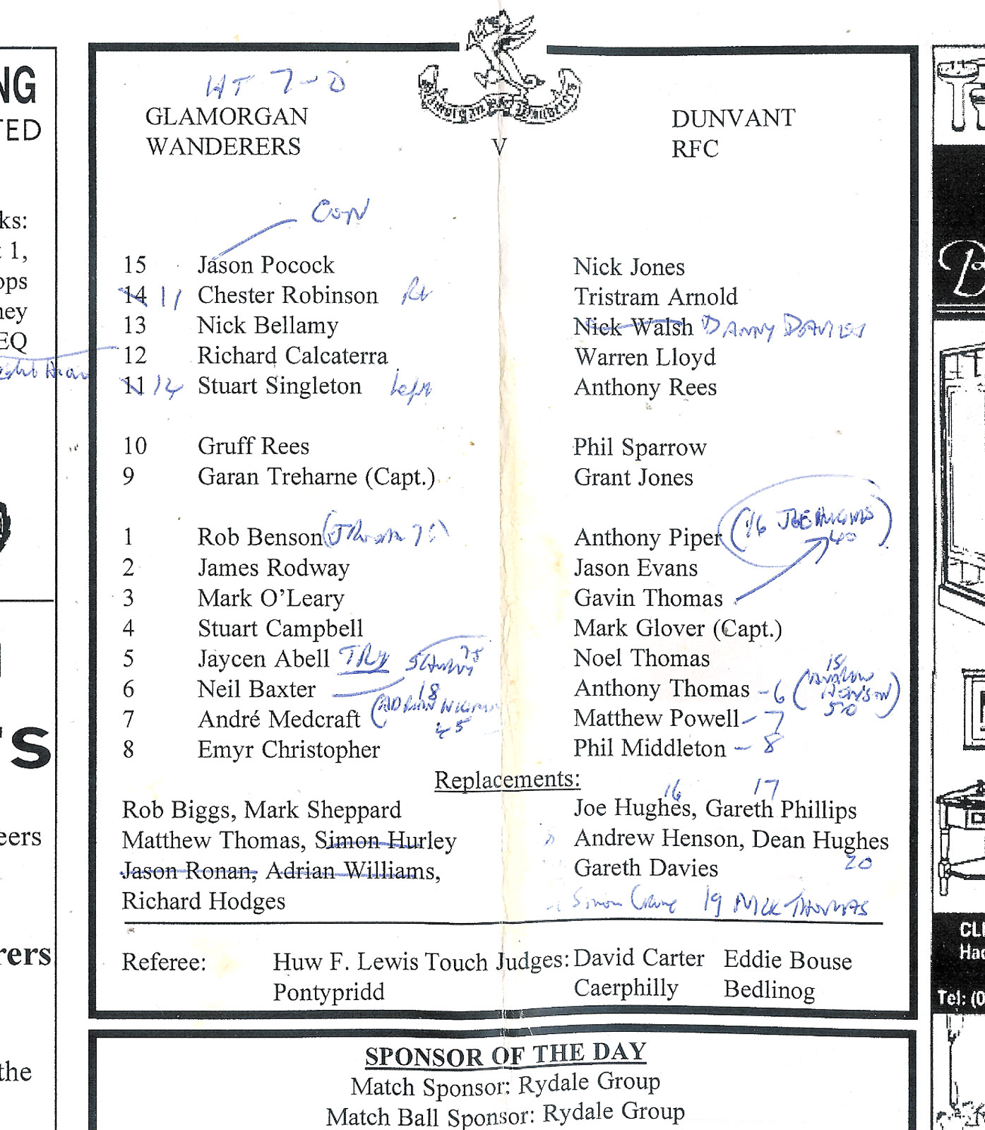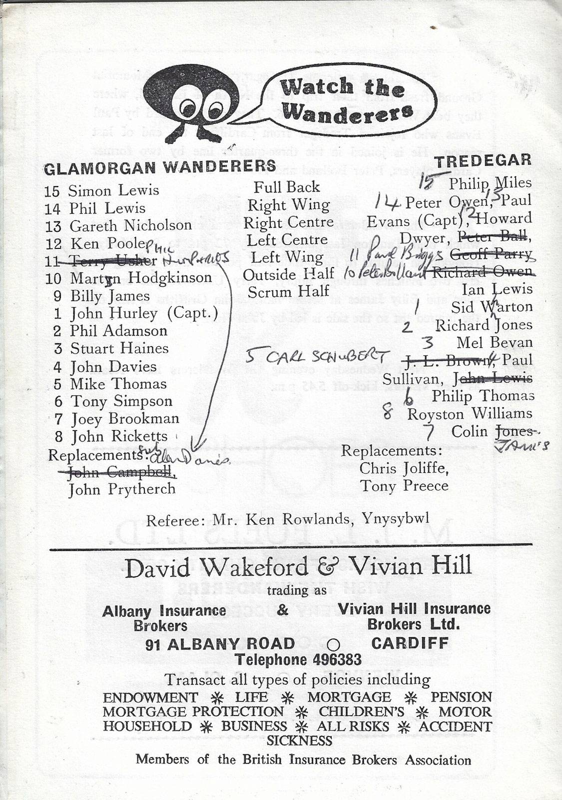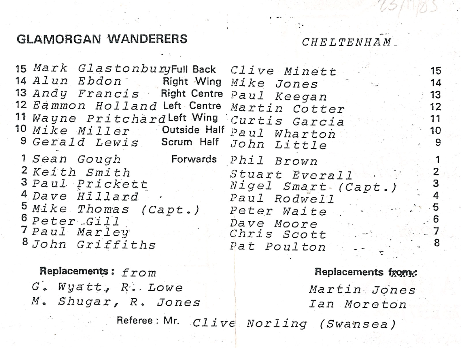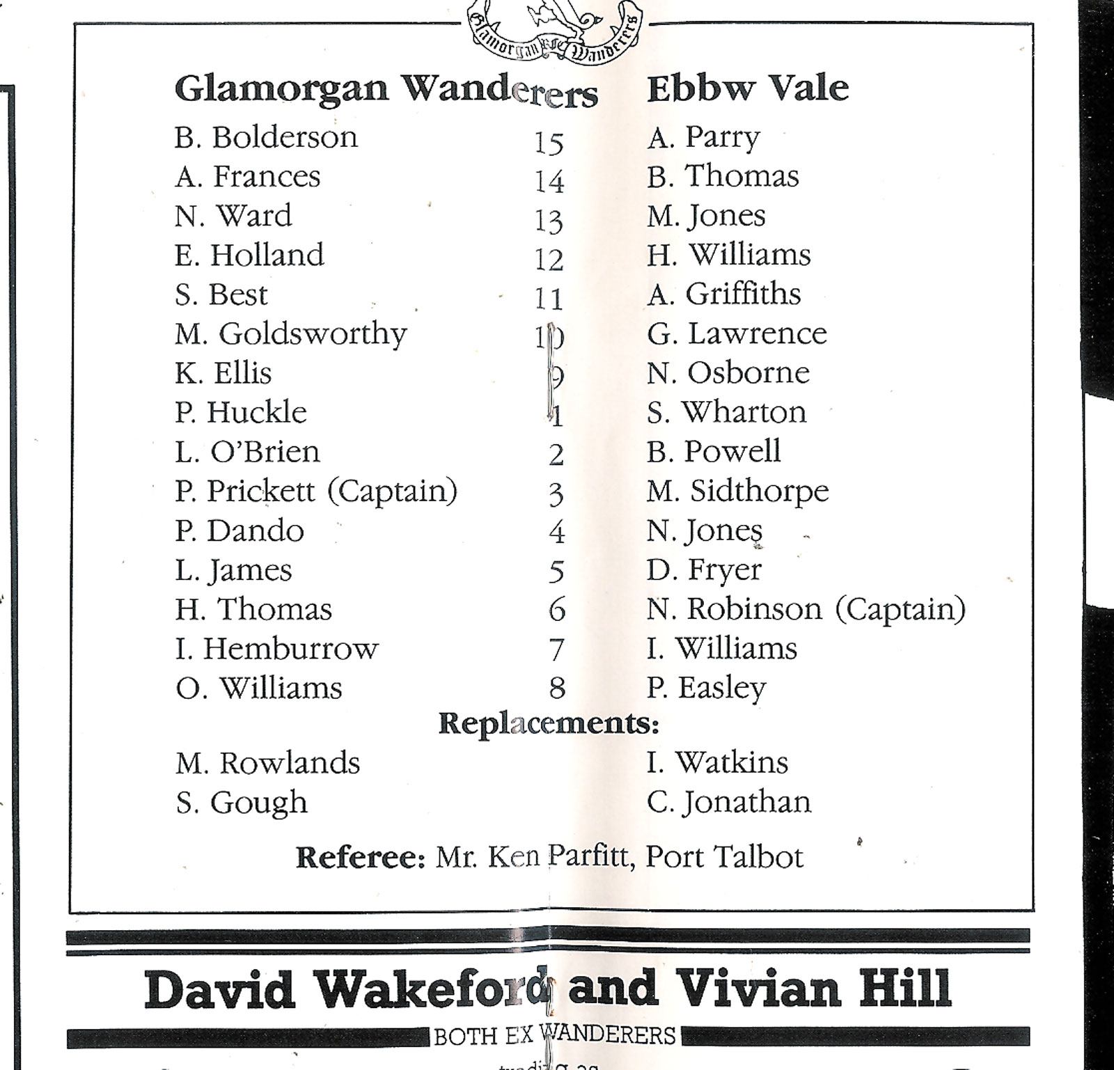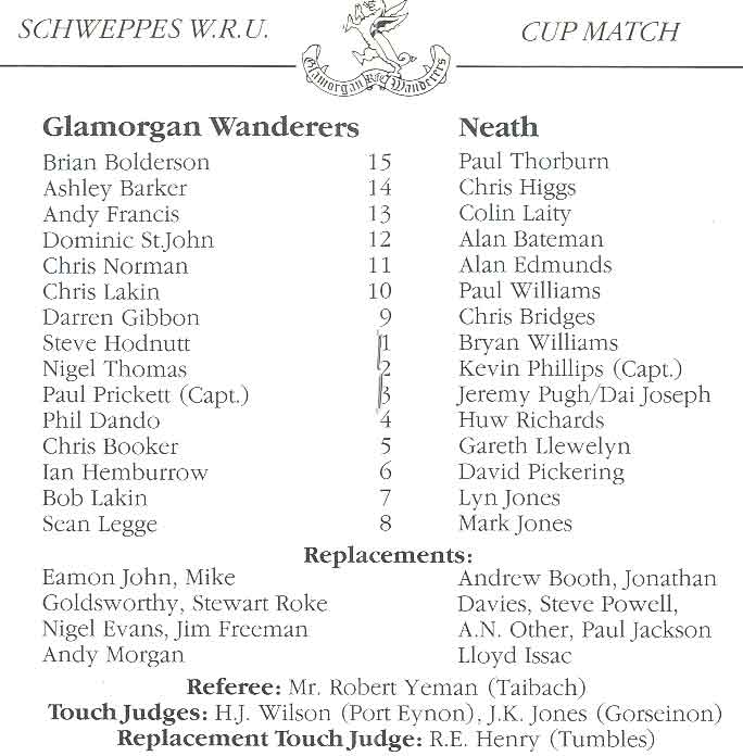 for Glamorgan Wanderers RFC away programmes please visit our other club programme pages......... Aberavon - Bath - Bridgend - Bristol - Cardiff - Ebbw Vale - English Clubs - Gloucester - Harlequins - Irish Clubs - Irish Provincial - Leicester - Llanelli & Scarlets - London Irish - London Scottish - London Welsh - Maesteg - Neath - Newbridge - Newport - Ospreys - Pontypool - Pontypridd - Richmond - Saracens - Scottish Club - Scottish District - Swansea - Welsh Clubs |