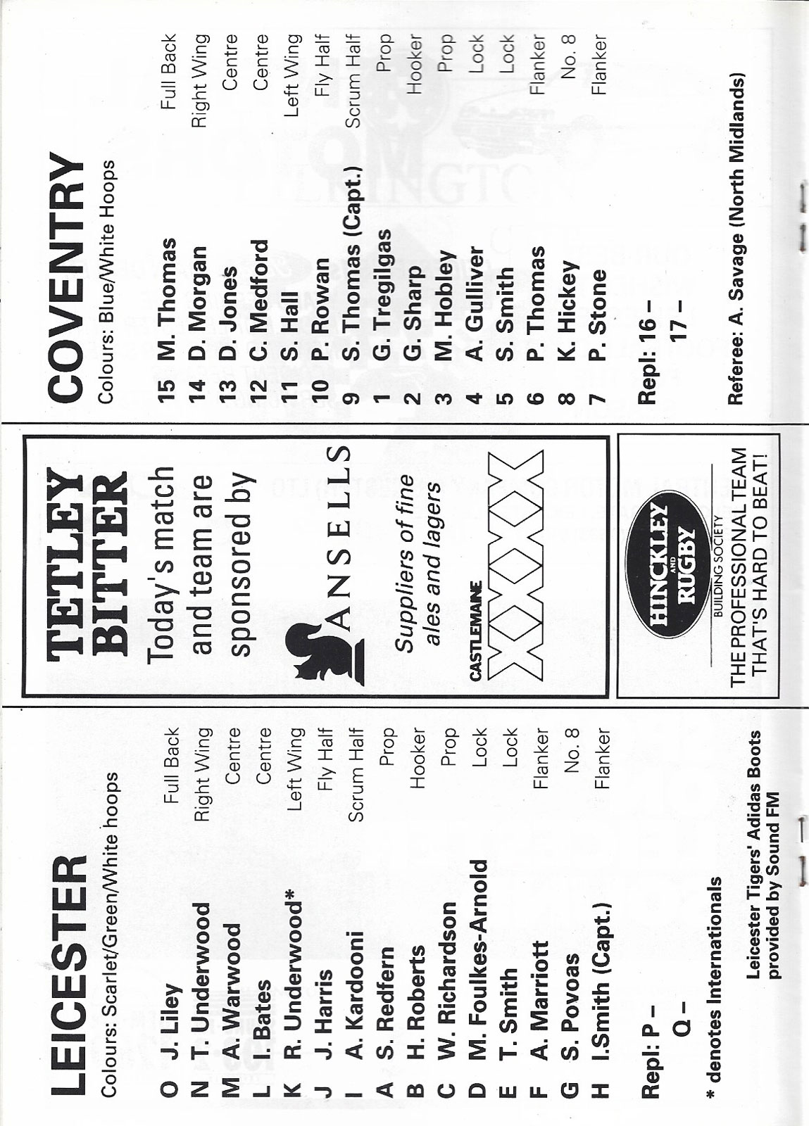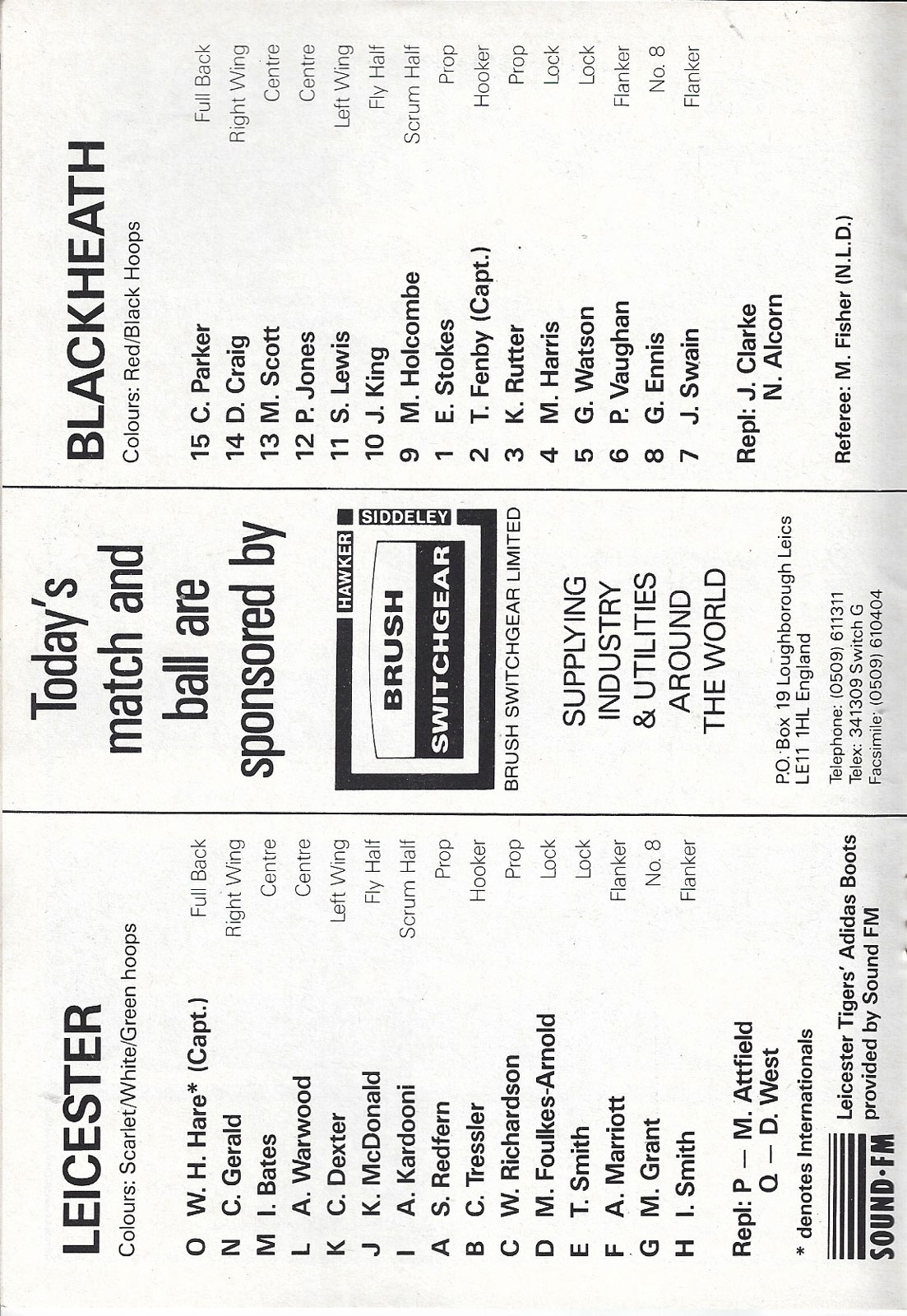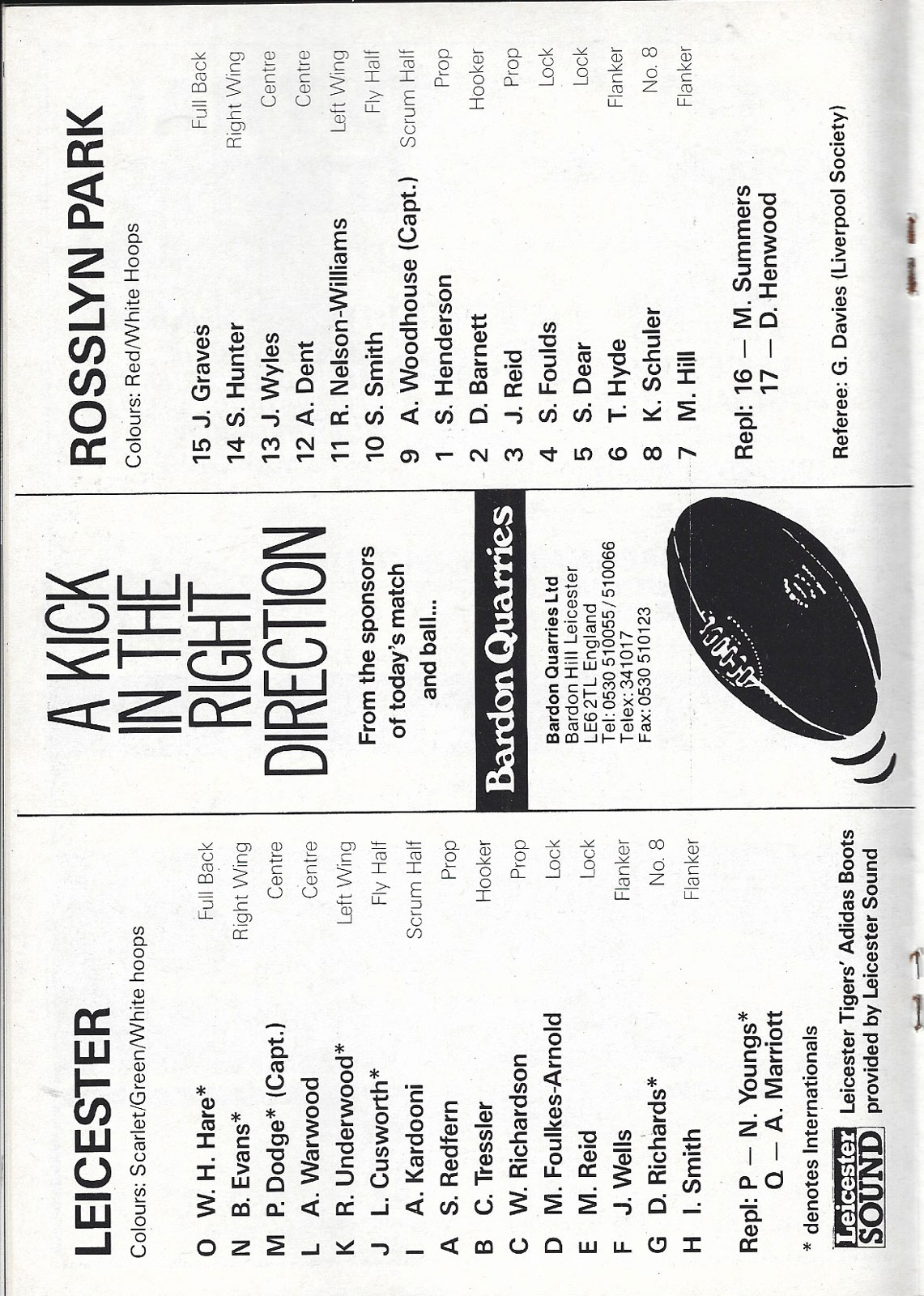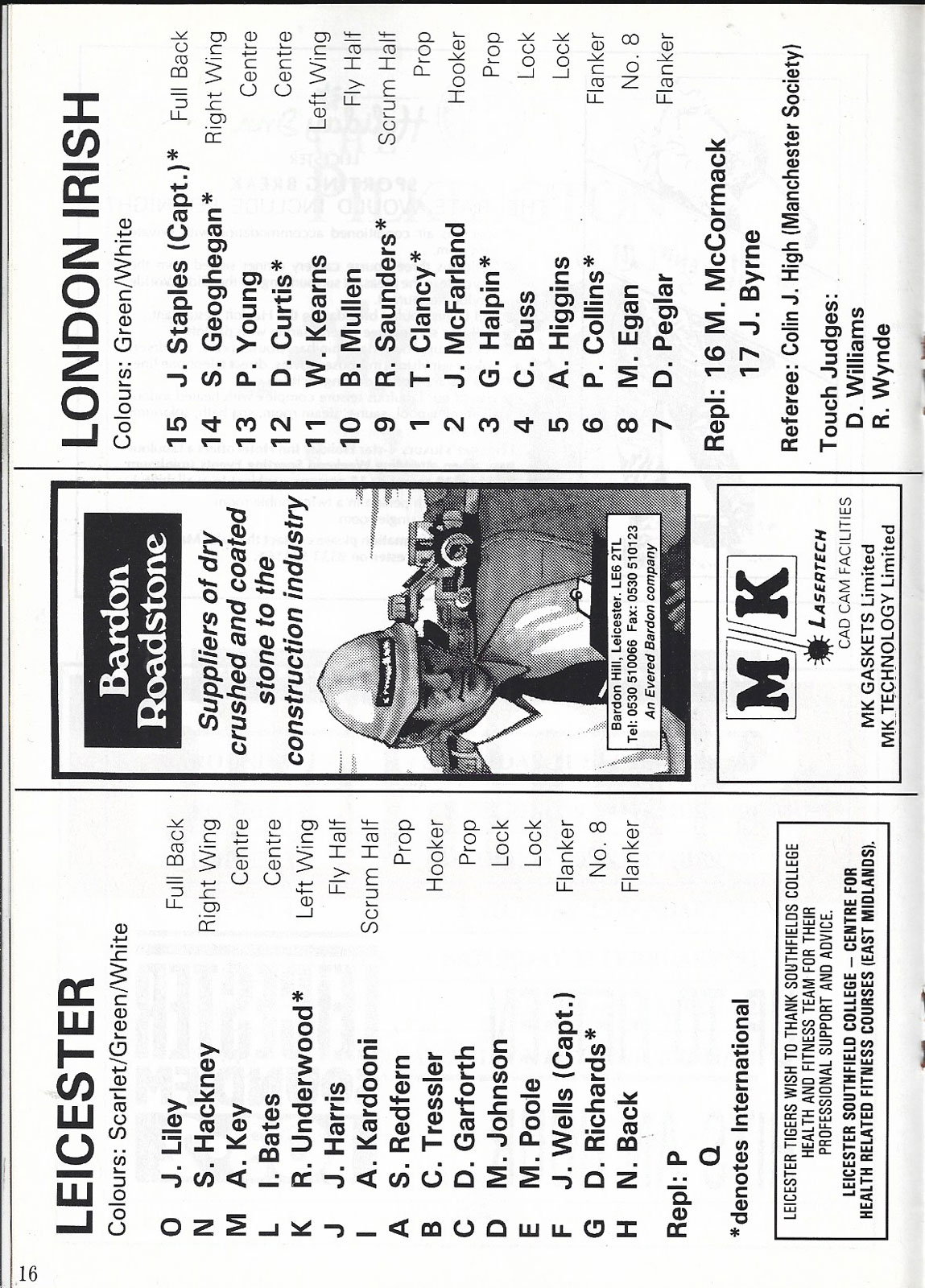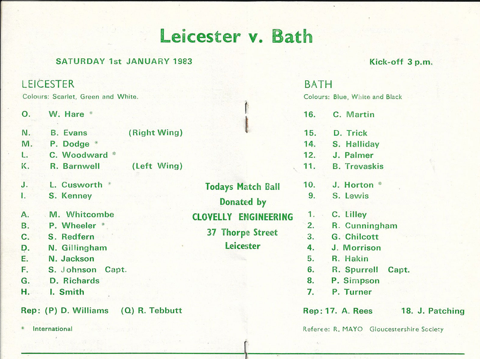for Leicester FC away programmes please visit our other club programme pages......... Aberavon - Bath - Bridgend - Cardiff - Ebbw Vale - English Clubs - Gloucester - Irish Clubs - Irish Provincial - Llanelli & Scarlets - Maesteg - Neath - Newbridge - Newport - Pontypool - Pontypridd - Saracens - Scottish Club - Swansea - Welsh Clubs |