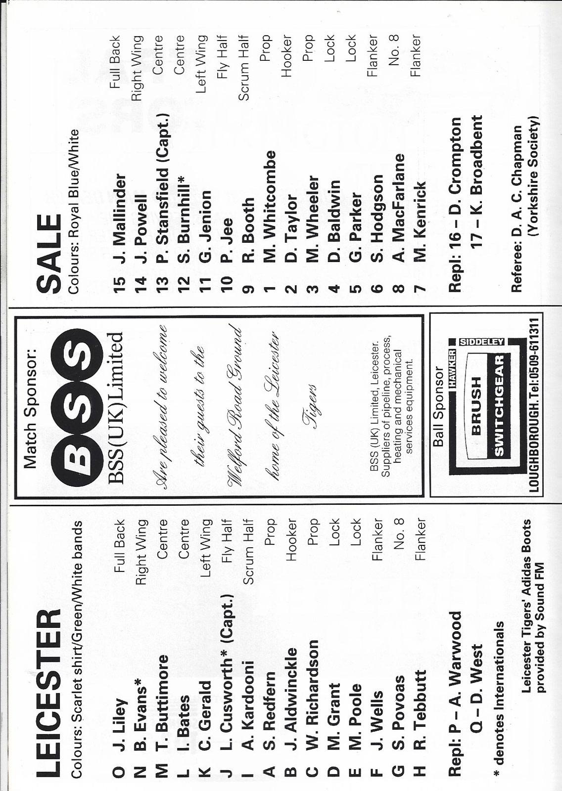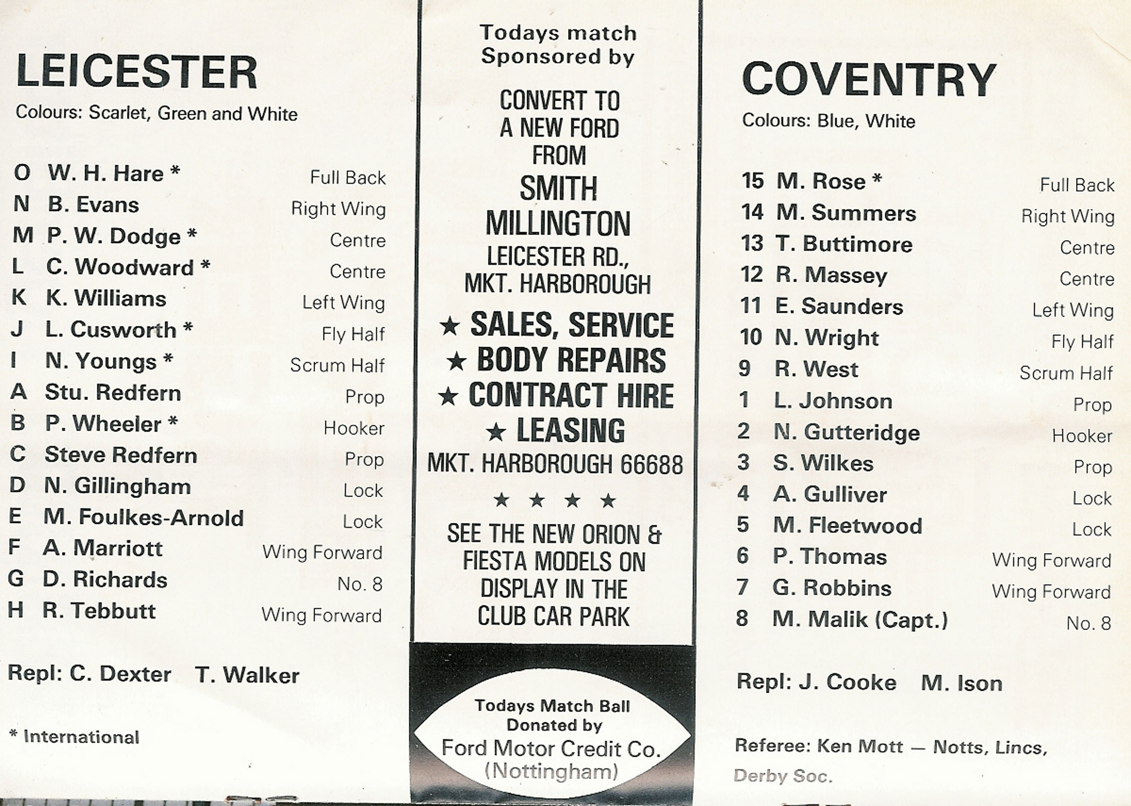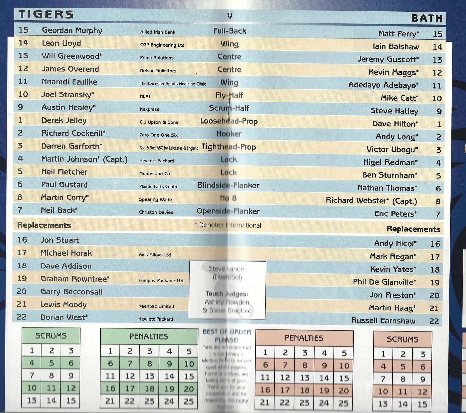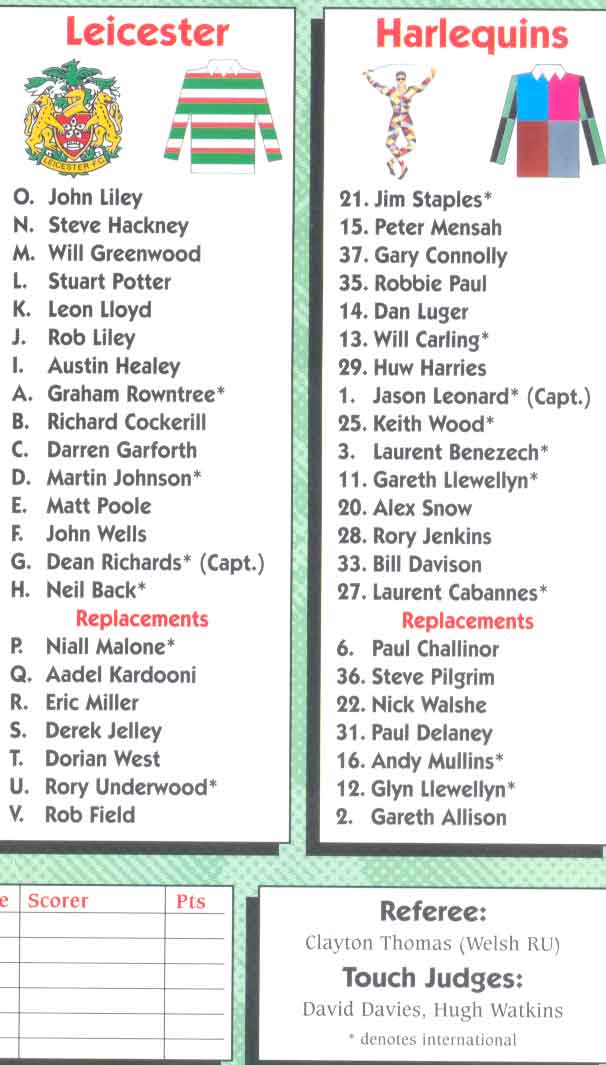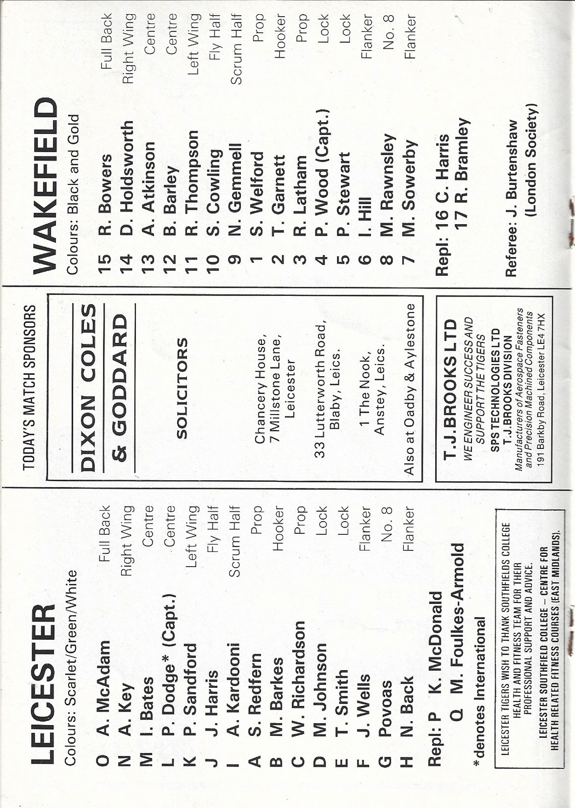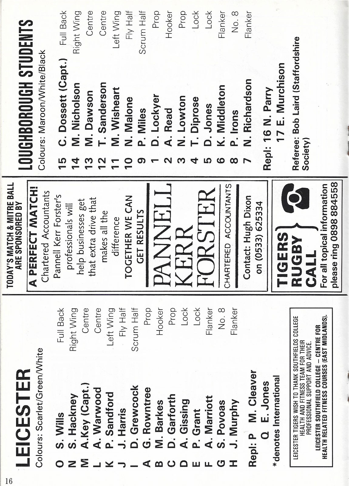 for Leicester FC away programmes please visit our other club programme pages......... Aberavon - Bath - Bridgend - Cardiff - Ebbw Vale - English Clubs - Gloucester - Irish Clubs - Irish Provincial - Llanelli & Scarlets - Maesteg - Neath - Newbridge - Newport - Pontypool - Pontypridd - Saracens - Scottish Club - Swansea - Welsh Clubs |