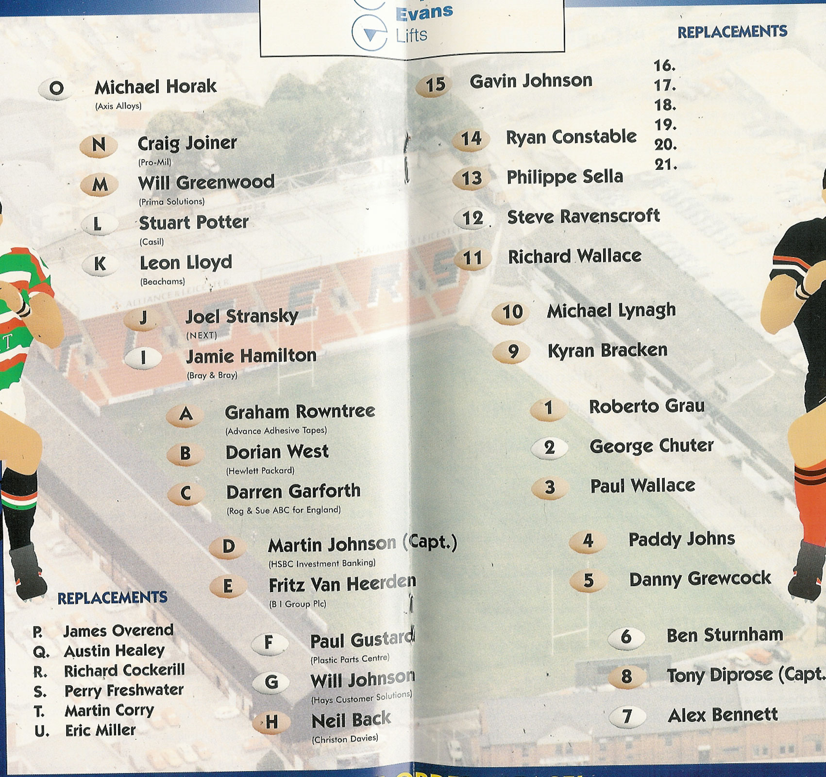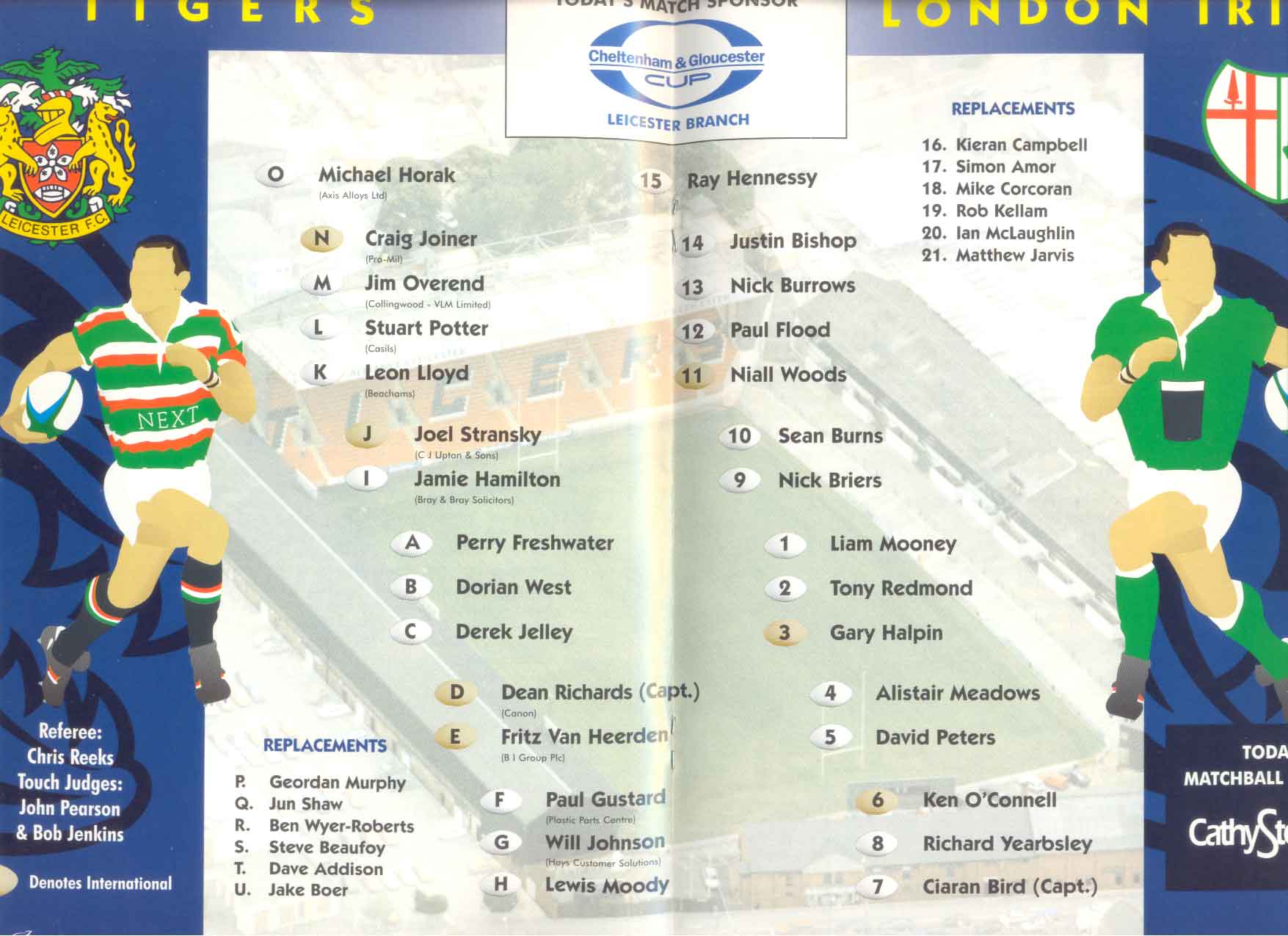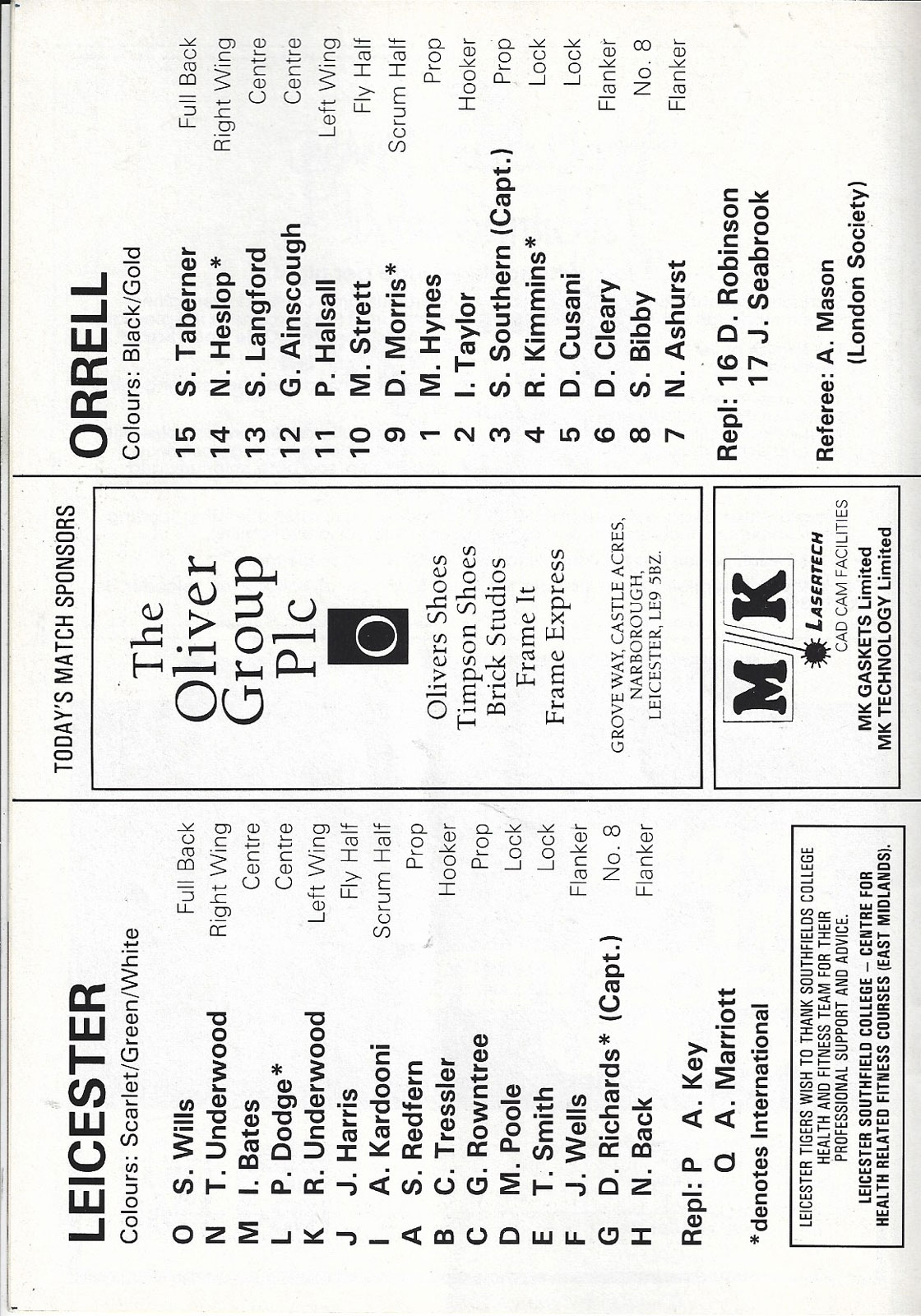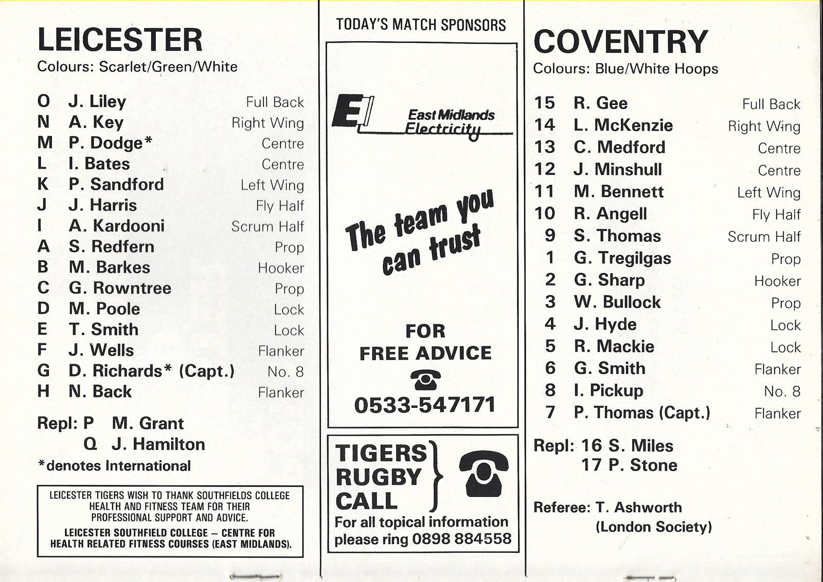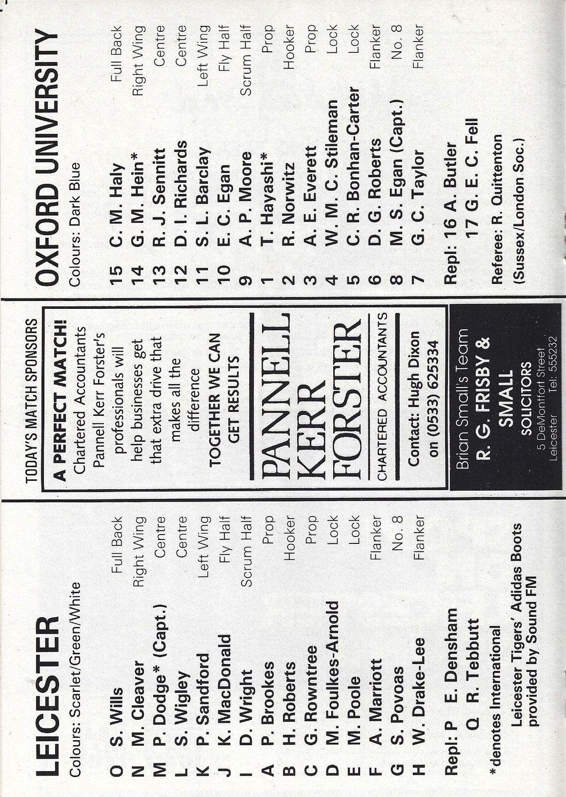 for Leicester FC away programmes please visit our other club programme pages......... Aberavon - Bath - Bridgend - Cardiff - Ebbw Vale - English Clubs - Gloucester - Irish Clubs - Irish Provincial - Llanelli & Scarlets - Maesteg - Neath - Newbridge - Newport - Pontypool - Pontypridd - Saracens - Scottish Club - Swansea - Welsh Clubs |
