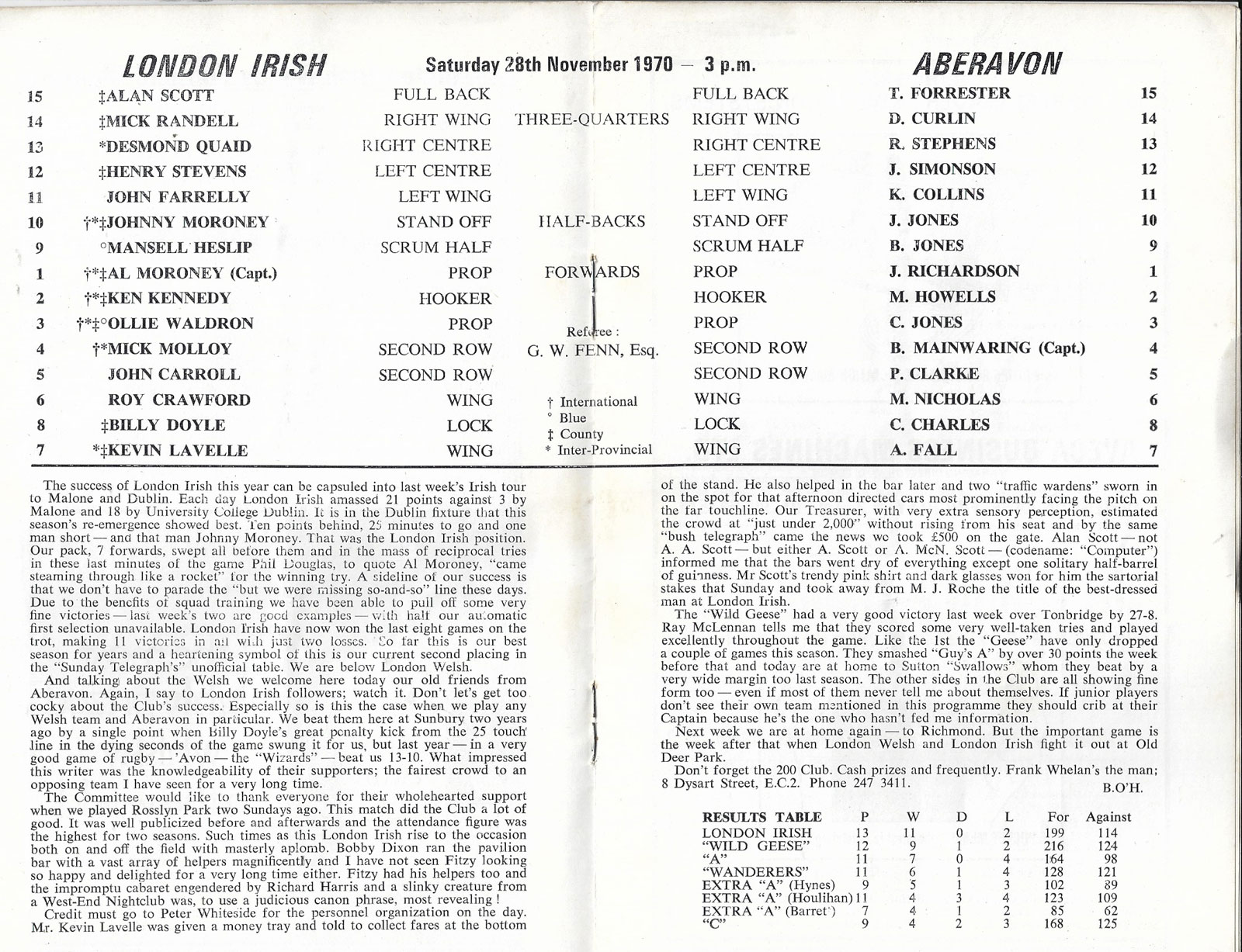 London Irish v Aberavon | 28 Nov 1970 | London Irish | good - coffee cup stain to the front Ref: RC554-G-prcb-loi19701128aav - £4.00 |