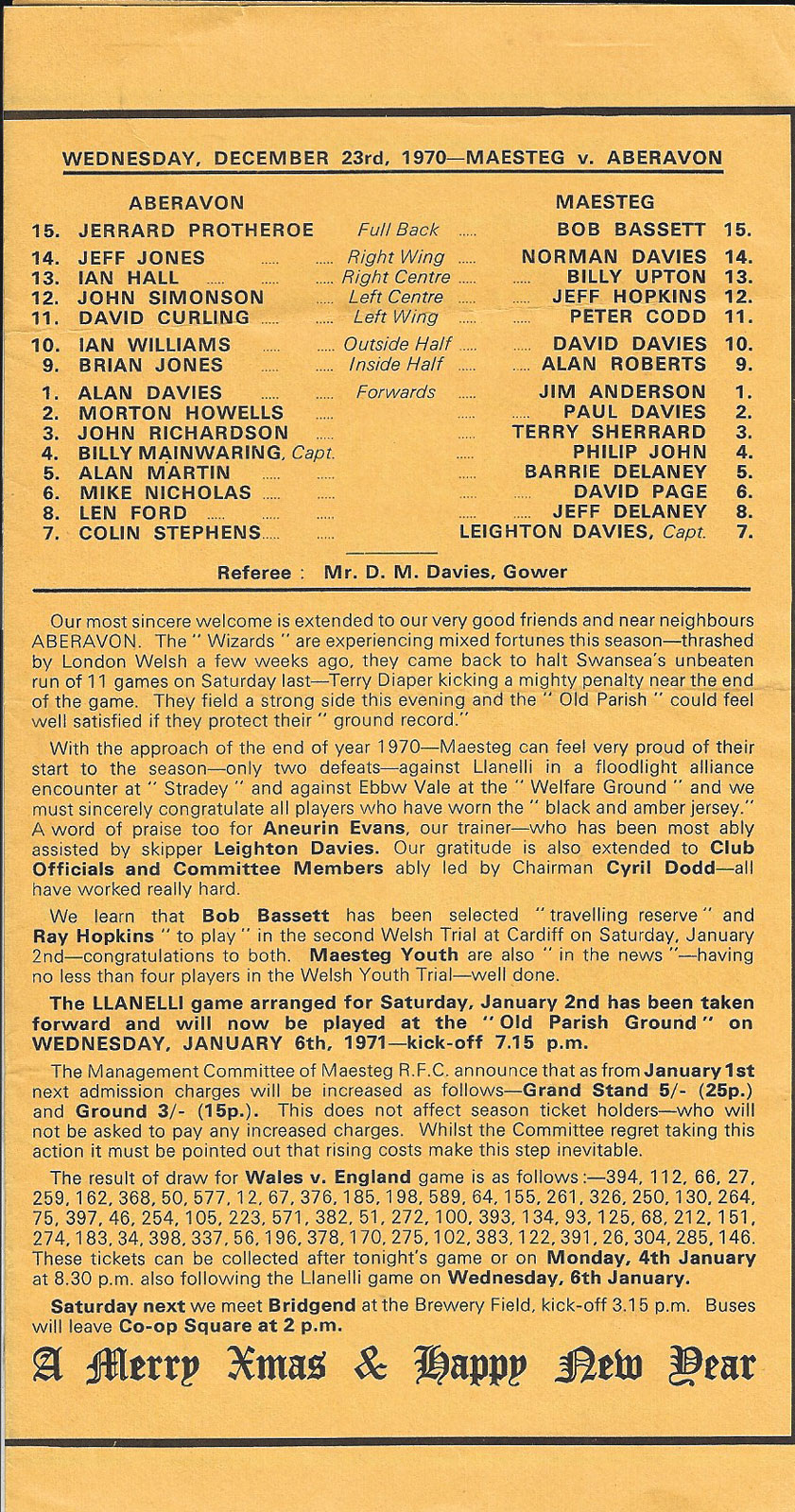Maesteg v Aberavon | 23 Dec 1970 | Maesteg | very good Ref: RC554-G-prcb-mae19701223aav - £5.00 |
