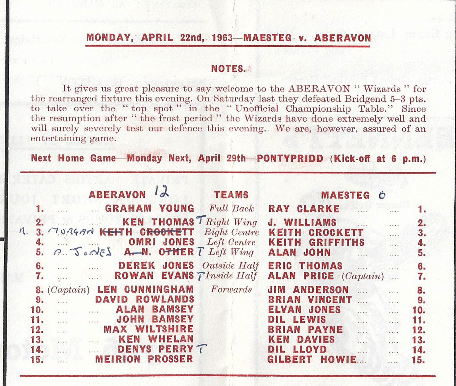 Maesteg v Aberavon | 22 Apr 1963 | Maesteg | good - slight crease, number written