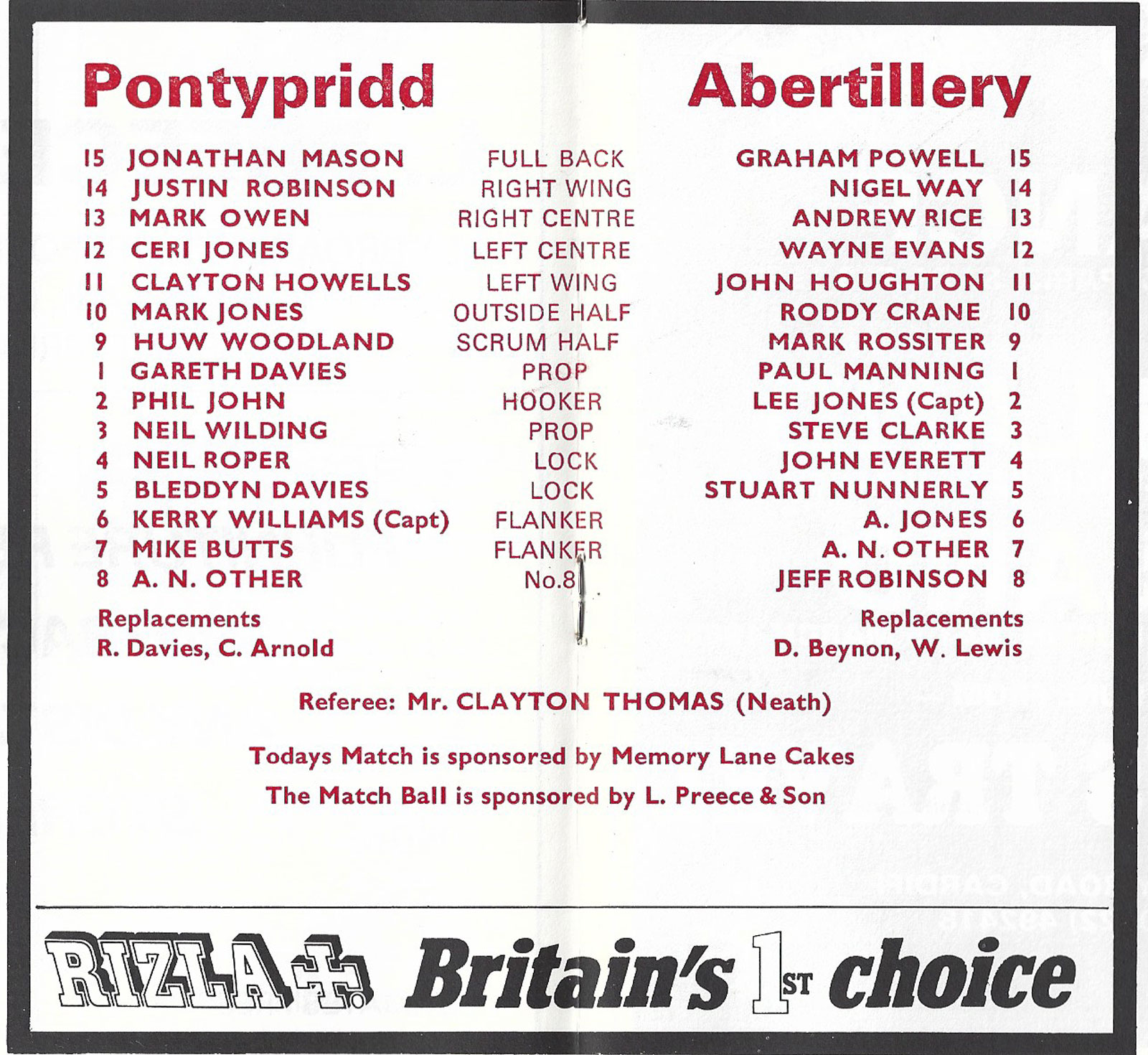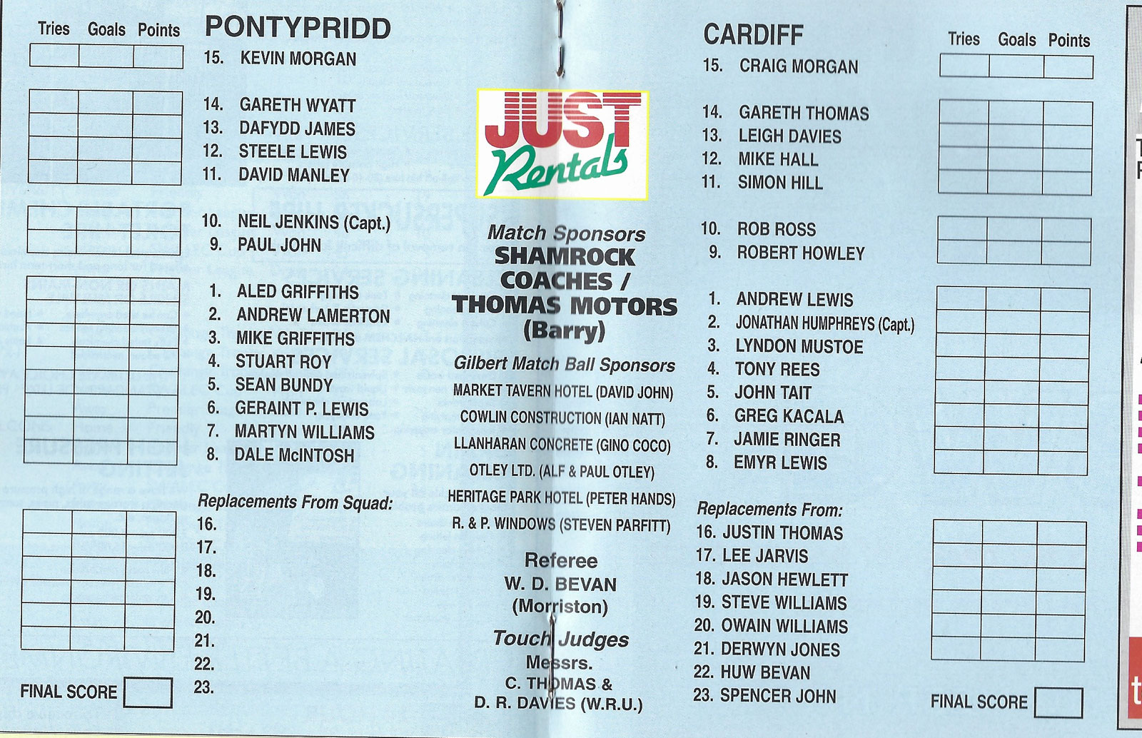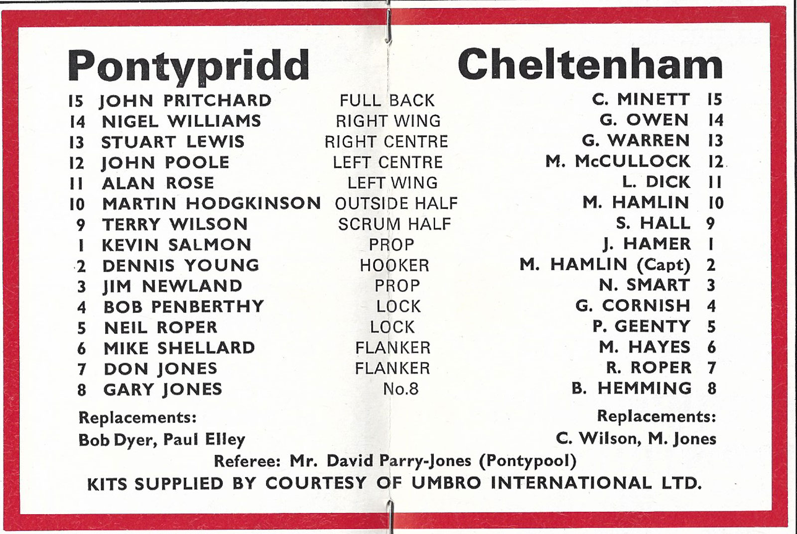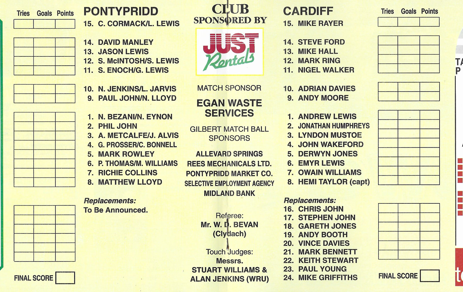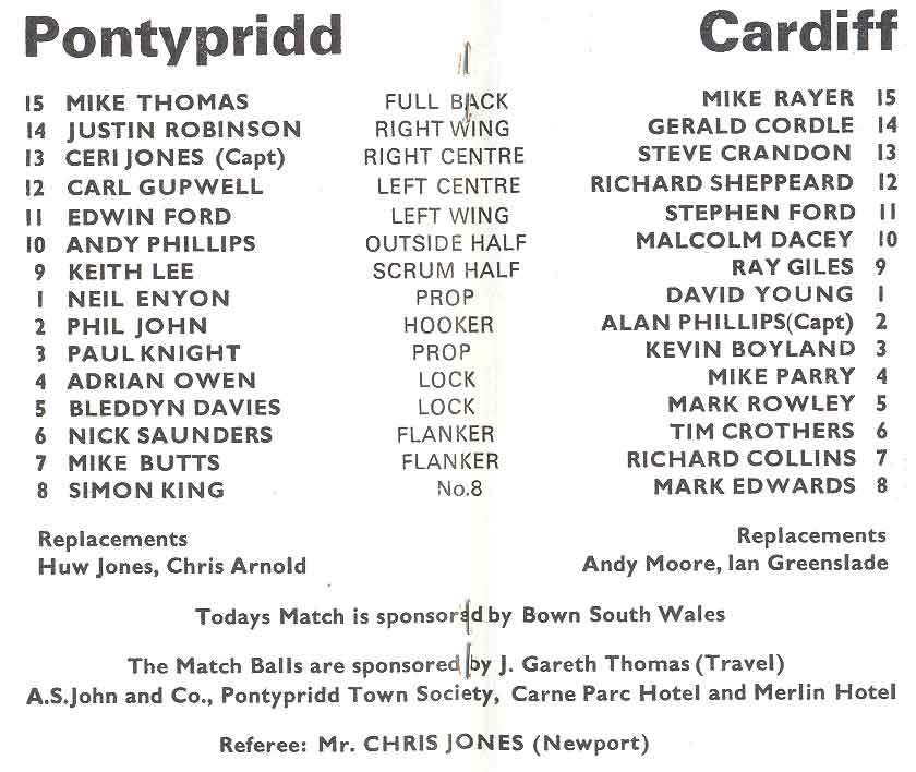 Pontypridd v Cardiff | 3 Jan 1969 | Ynysangharad Park, Pontypridd | 5-15* | very good - slight crease Ref: B215-C-prcb-ppr19690103cdf - £5.00 |