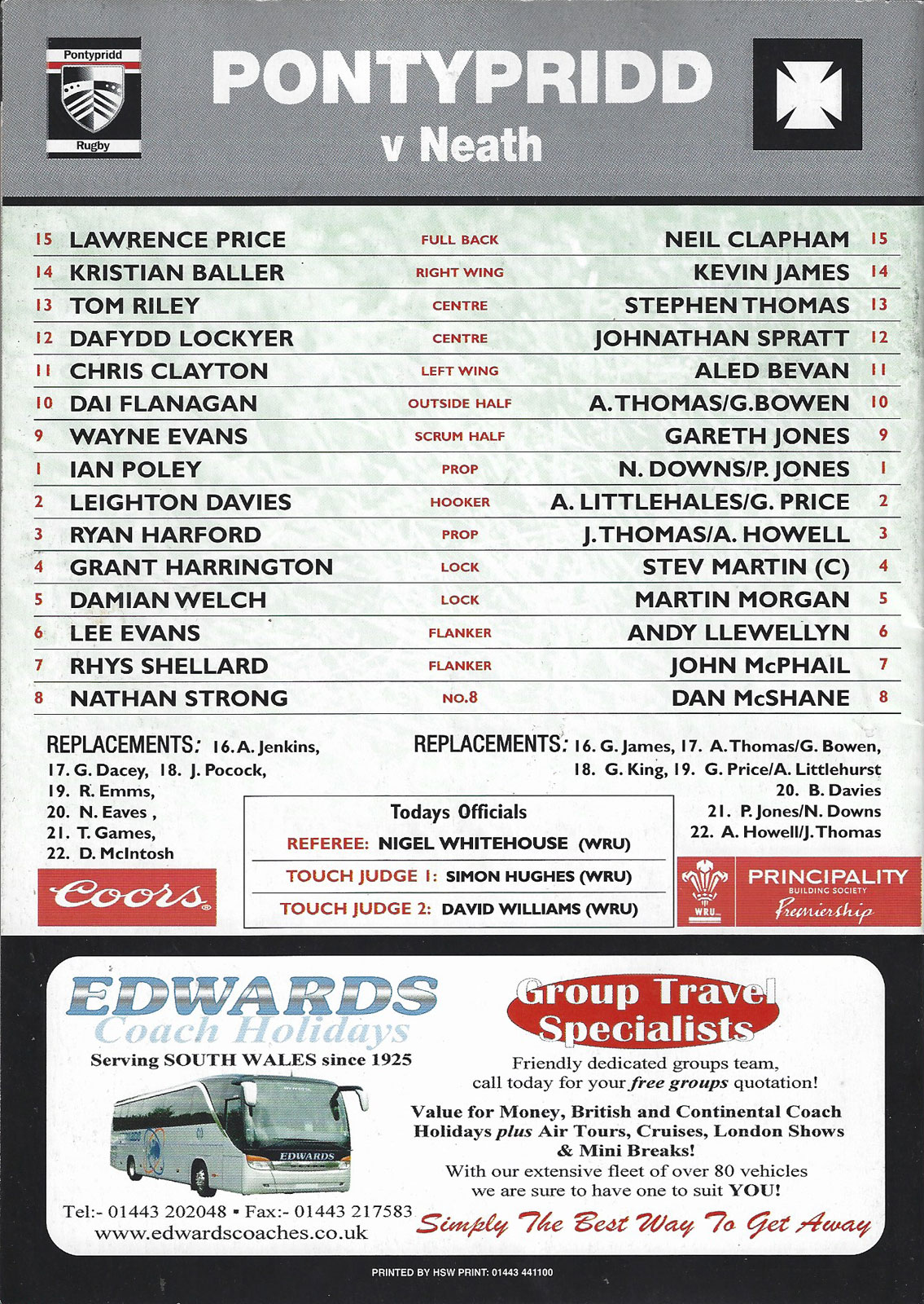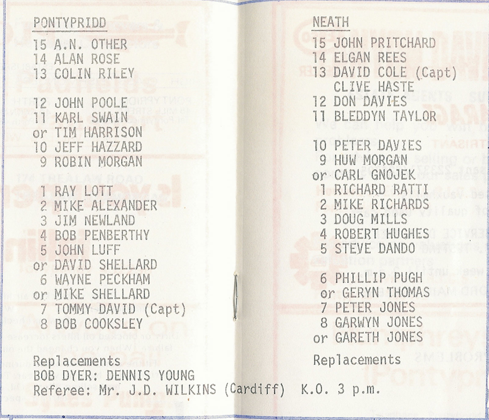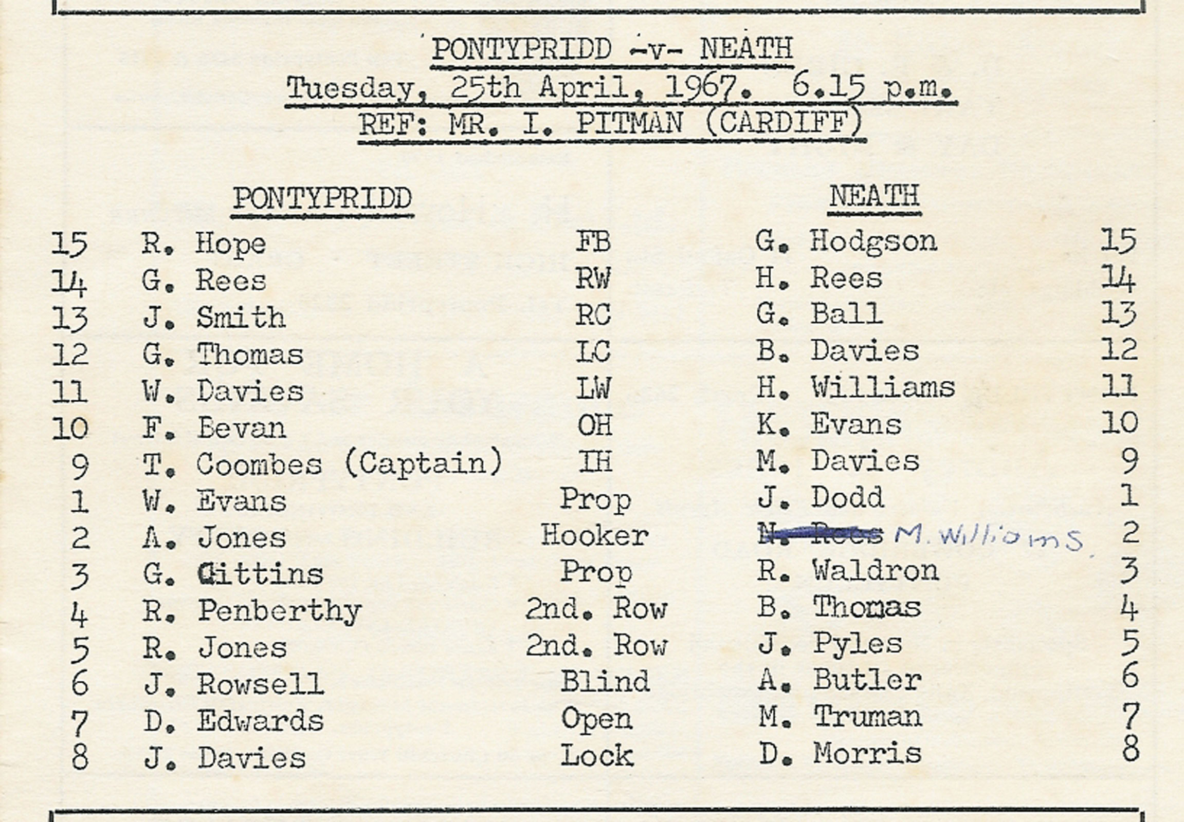 Pontypridd v Neath Championship winning match | 25 Apr 1967 | Pontypridd | 9-12 | very good Ref: PC13-prcb-ppr19670425nea - £25.00 |
