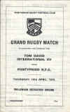 Pontypridd v Tom David International XV | 10 Apr 1975 | Pontypridd | good Ref: RC136-B-prcb-ppr19750410tom - £7.00 |