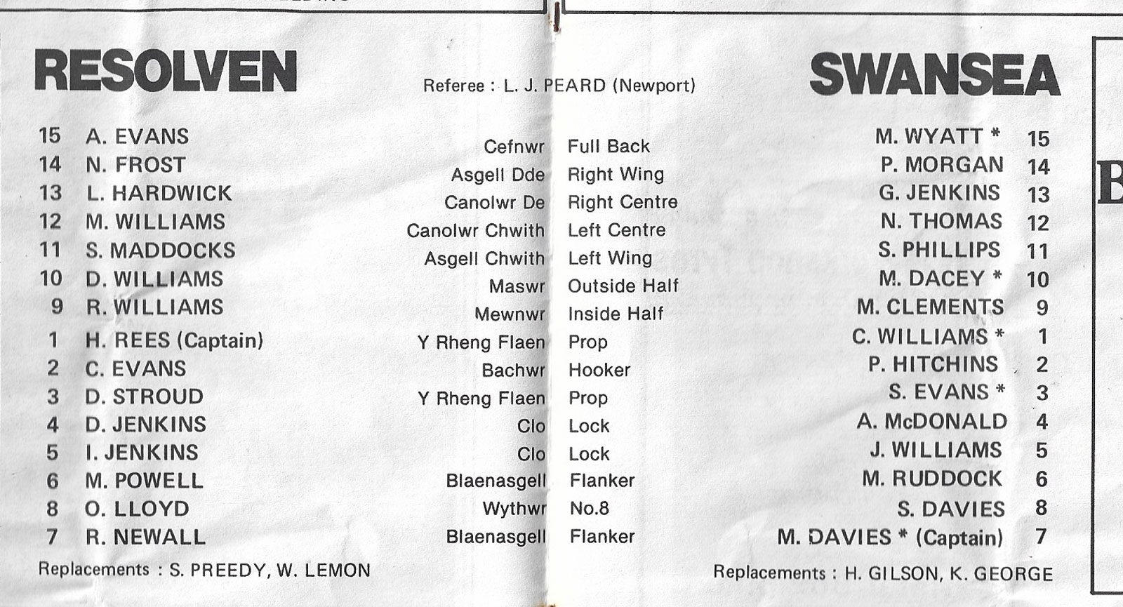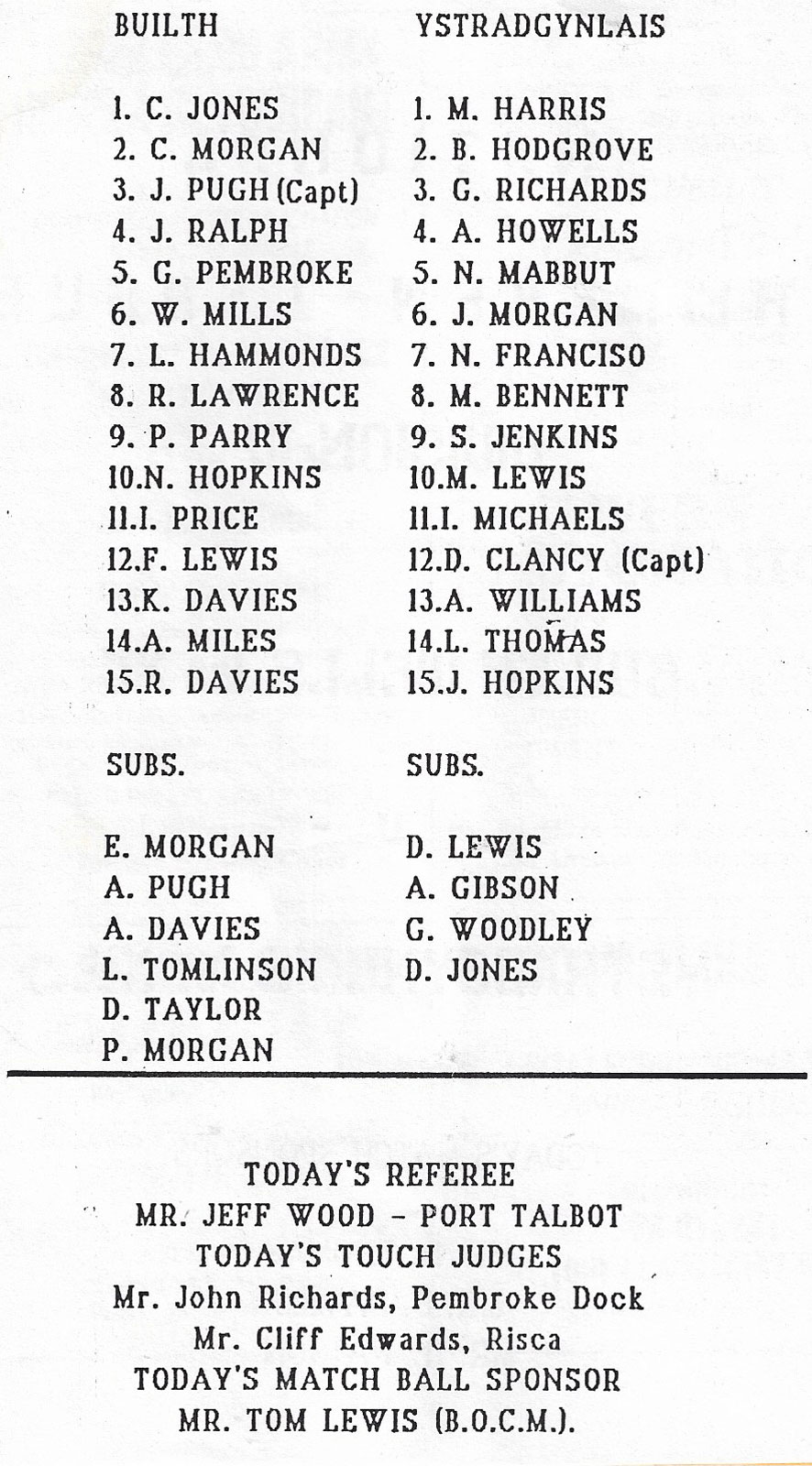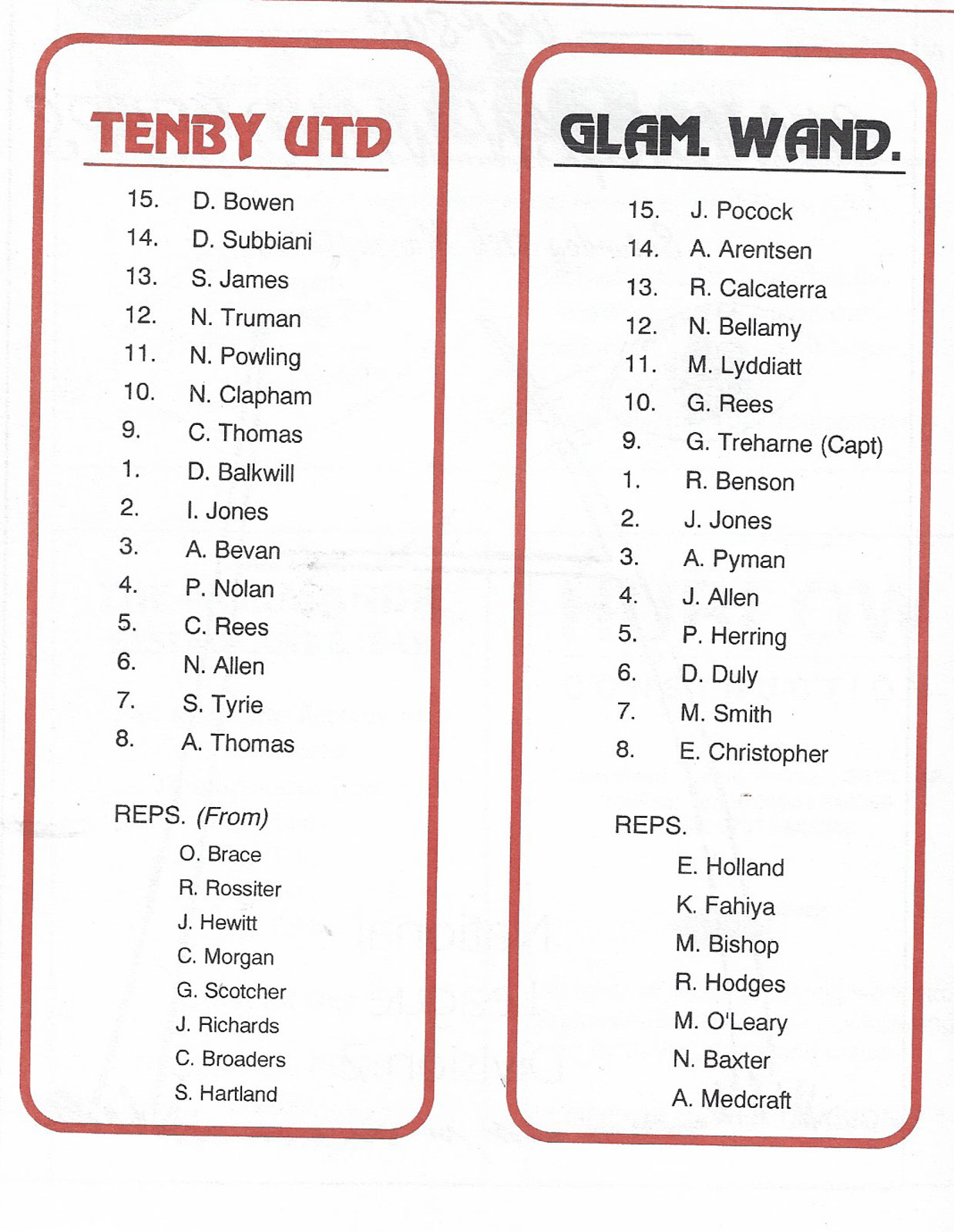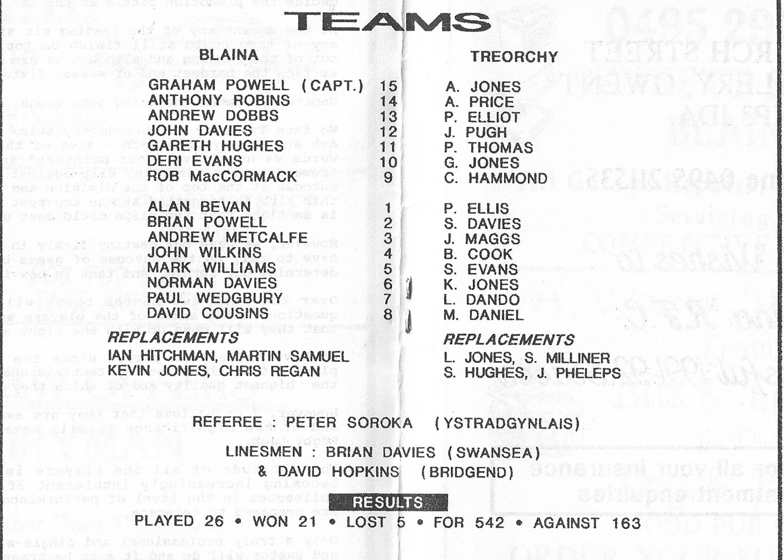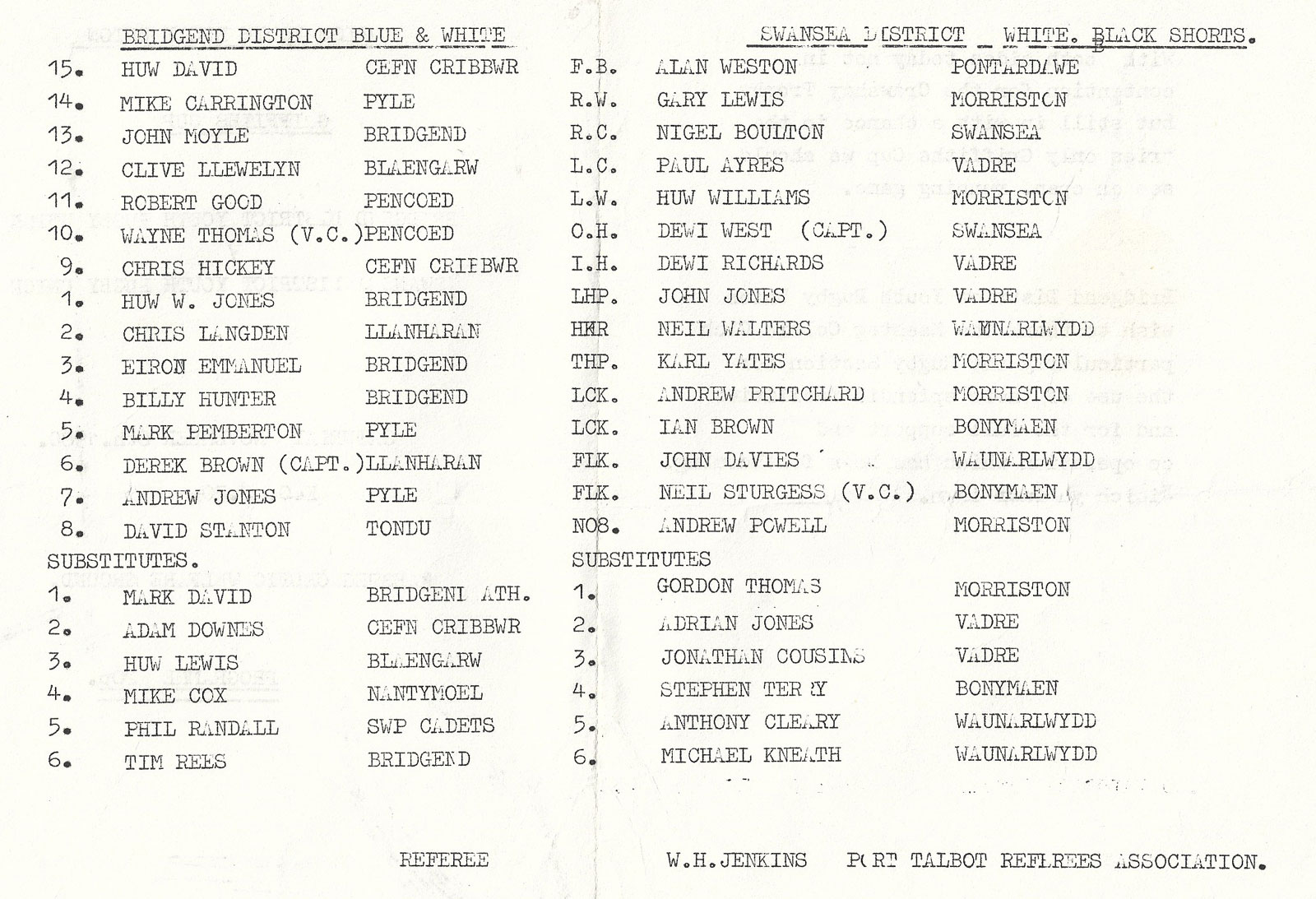 ABERCYNON - ABERAVON - ABERTILLERY - BARGOED - BEDWAS - BLAINA - BONYMAEN - BRIDGEND - CAERPHILLY - CARDIFF - CROSS KEYS - CUP FINALS & SEMI-FINALS - DUNVANT - EBBW VALE - FELINFOEL - GLAMORGAN WANDERERS - LLANDOVERY - LLANELLI - LLANHARAN - MAESTEG - MERTHYR - NEATH - NEWBRIDGE - NEWPORT - OSPREYS - PENARTH - PONTYPOOL - PONTYPRIDD - RESOLVEN - RUMNEY - SOUTH WALES POLICE - ST PETERS - SWANSEA - TENBY - TREDEGAR - TREORCHY - UWIC - YSTRADGYNLAIS - WELSH COUNTIES & REGIONAL |
