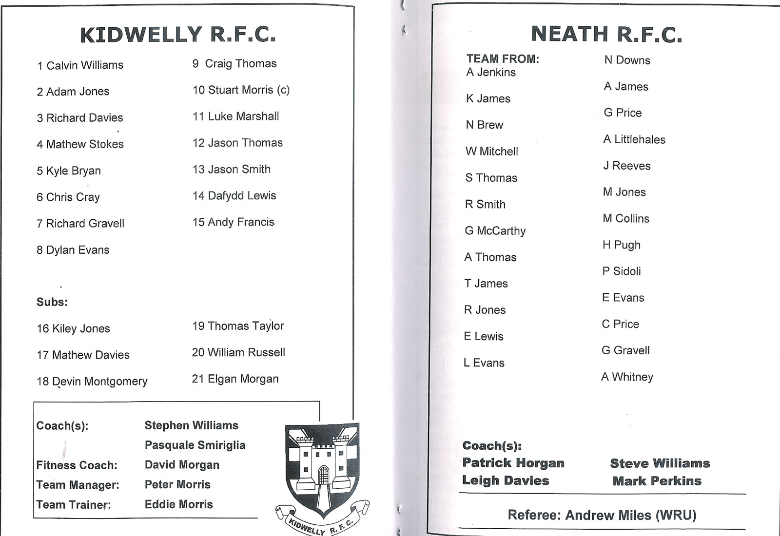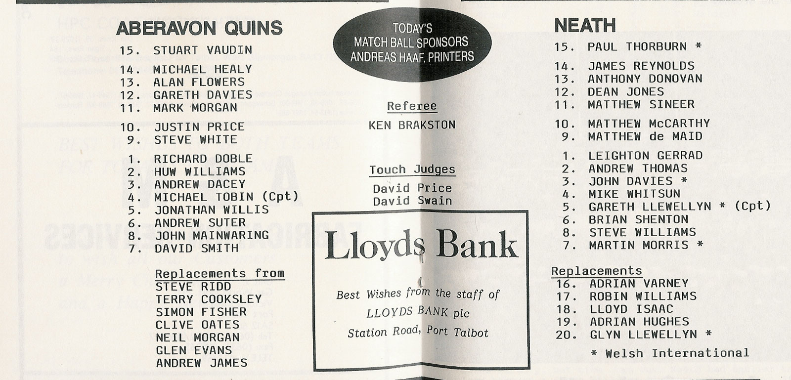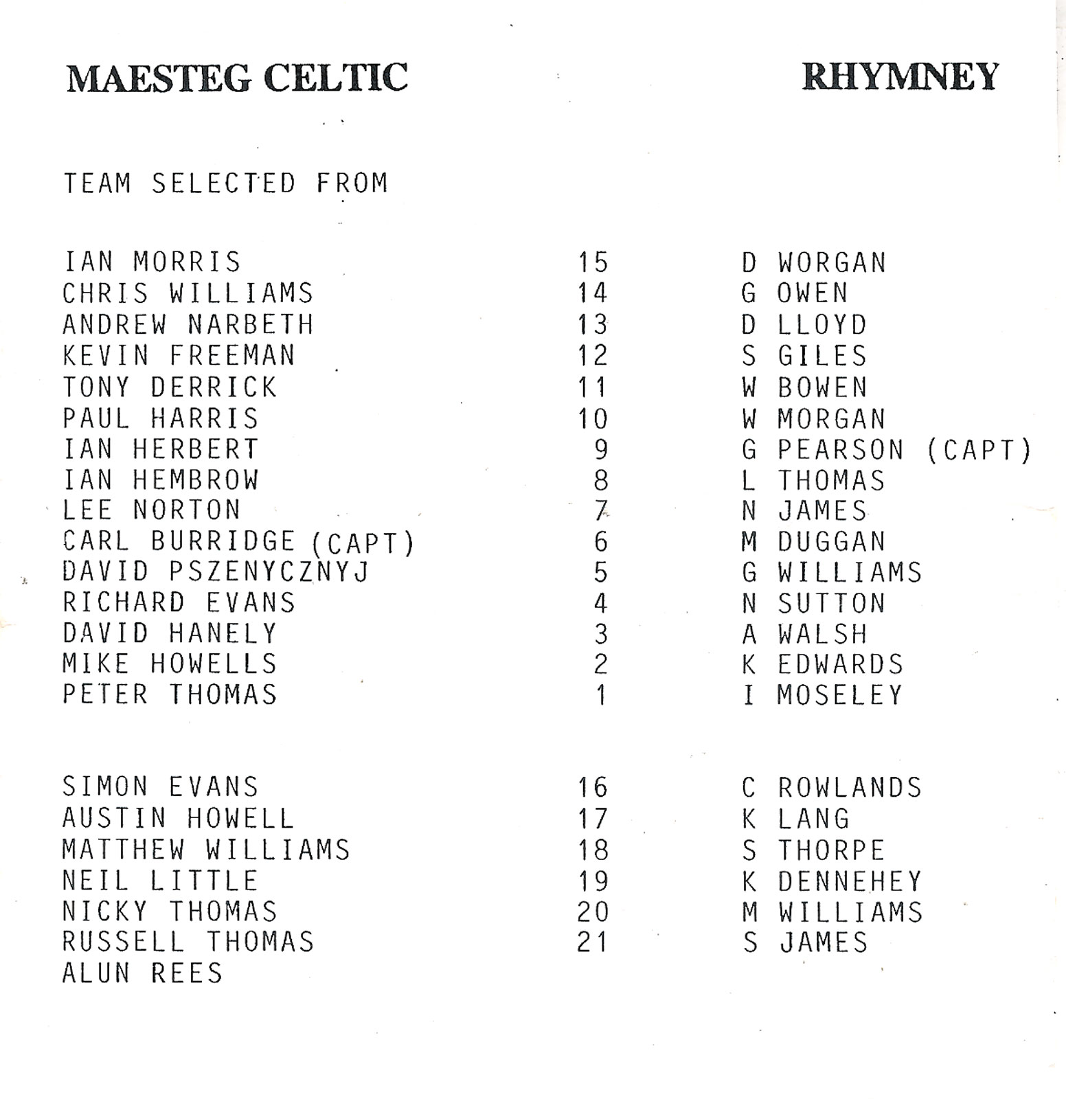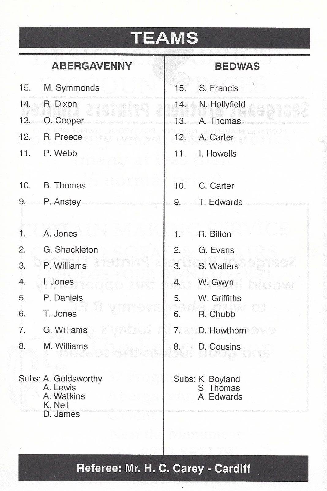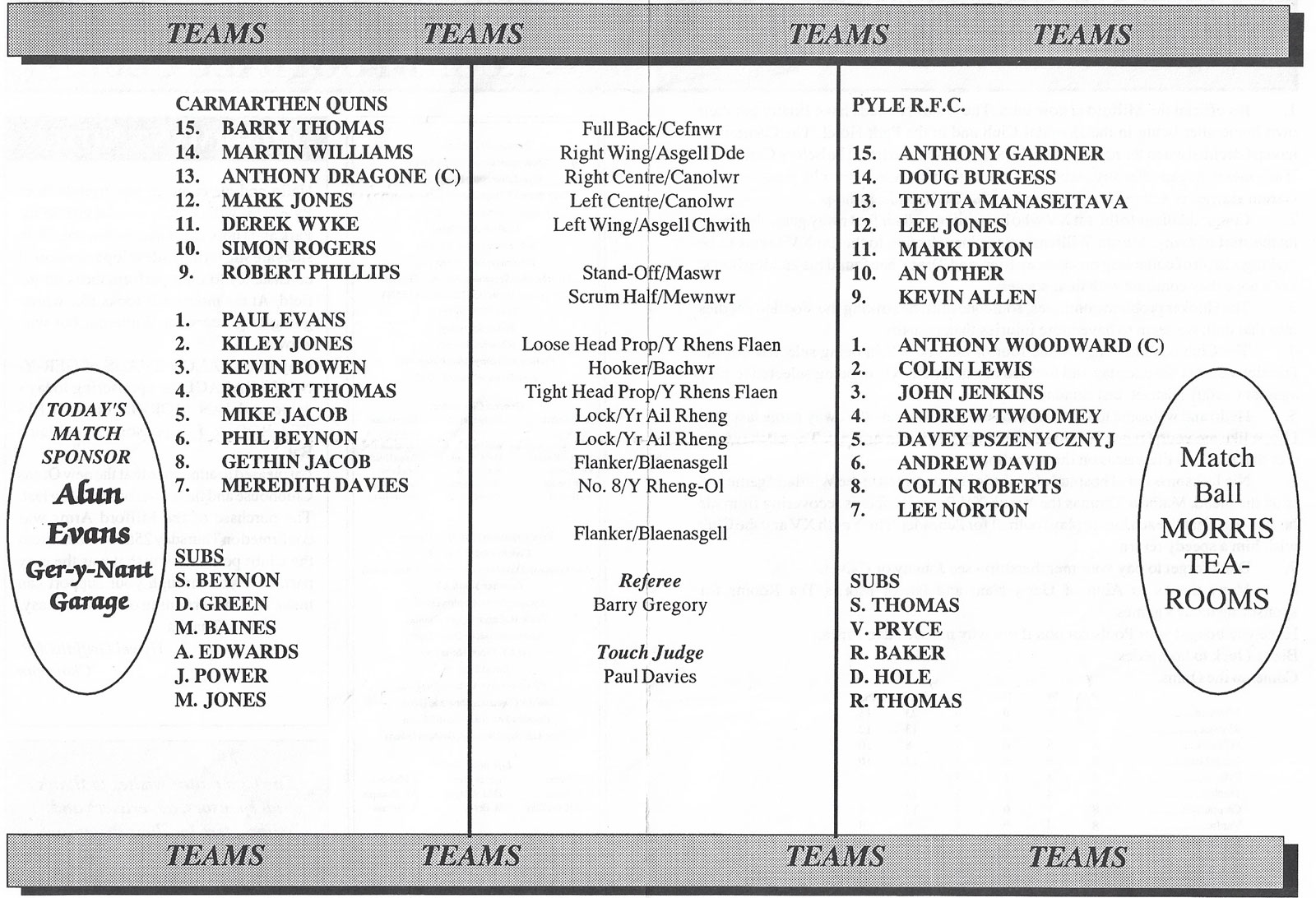 ABERCYNON - ABERAVON - ABERTILLERY - BARGOED - BEDWAS - BLAINA - BONYMAEN - BRIDGEND - CAERPHILLY - CARDIFF - CROSS KEYS - CUP FINALS & SEMI-FINALS - DUNVANT - EBBW VALE - FELINFOEL - GLAMORGAN WANDERERS - LLANDOVERY - LLANELLI - LLANHARAN - MAESTEG - MERTHYR - NEATH - NEWBRIDGE - NEWPORT - OSPREYS - PENARTH - PONTYPOOL - PONTYPRIDD - RESOLVEN - RUMNEY - SOUTH WALES POLICE - ST PETERS - SWANSEA - TENBY - TREDEGAR - TREORCHY - UWIC - YSTRADGYNLAIS - WELSH COUNTIES & REGIONAL |