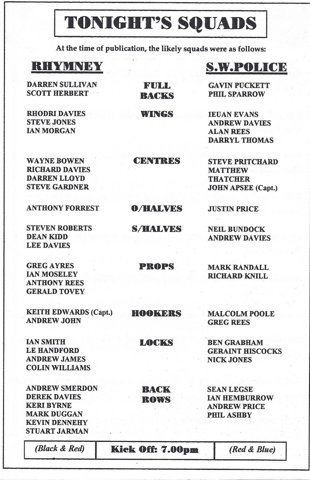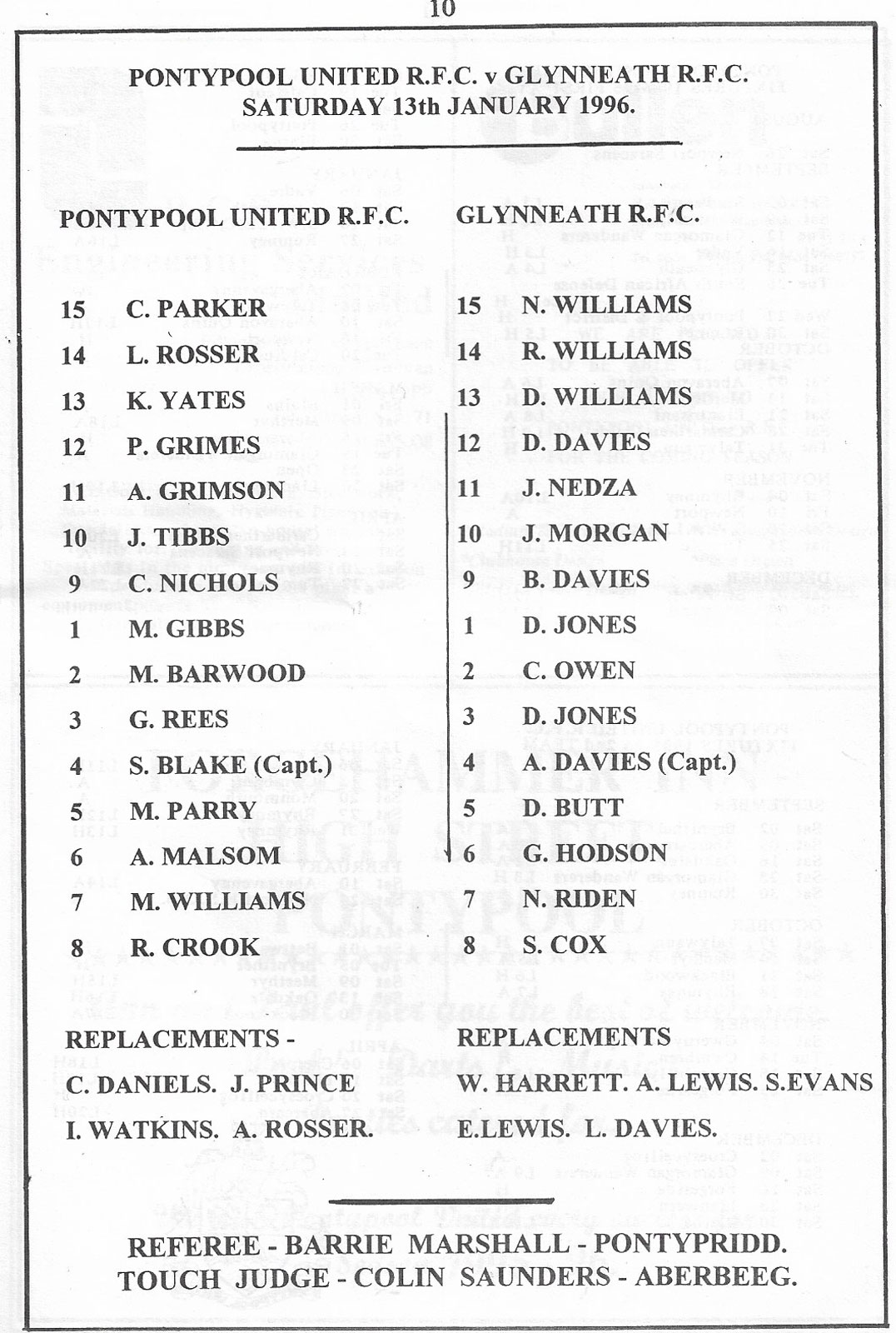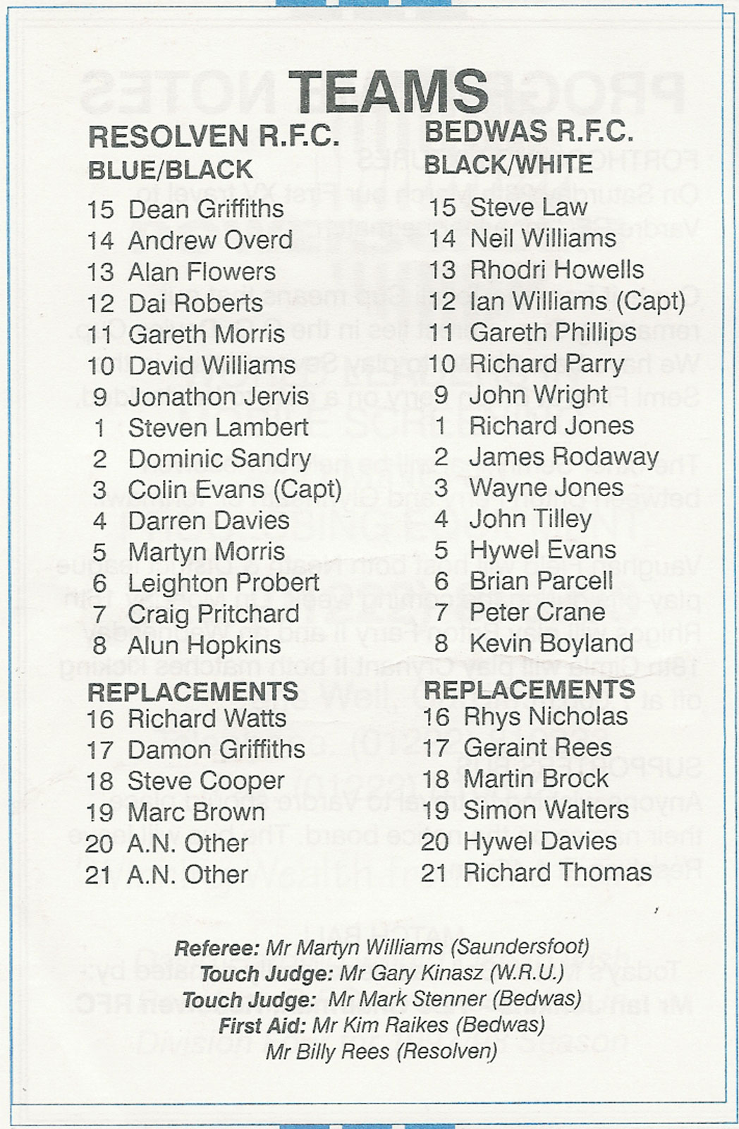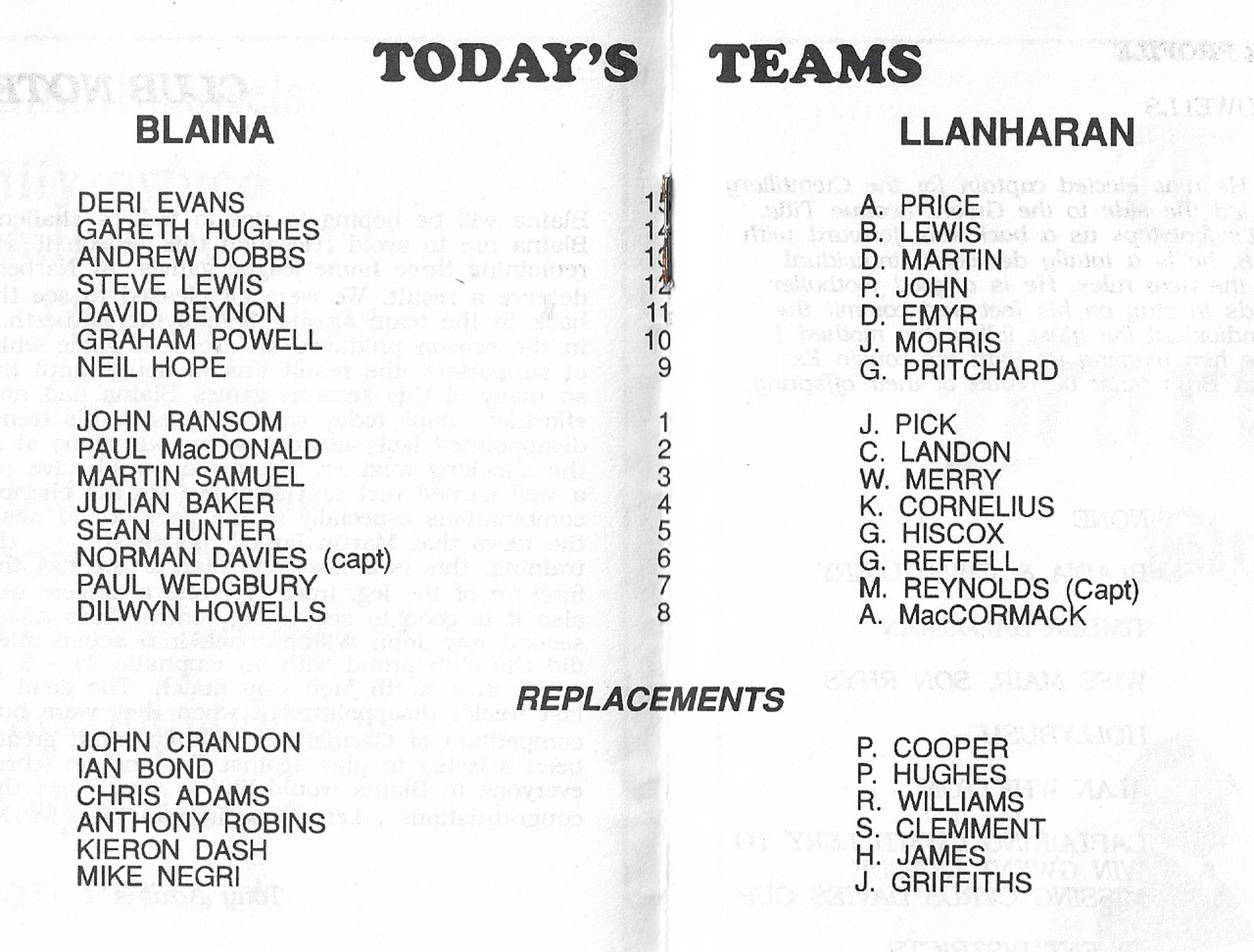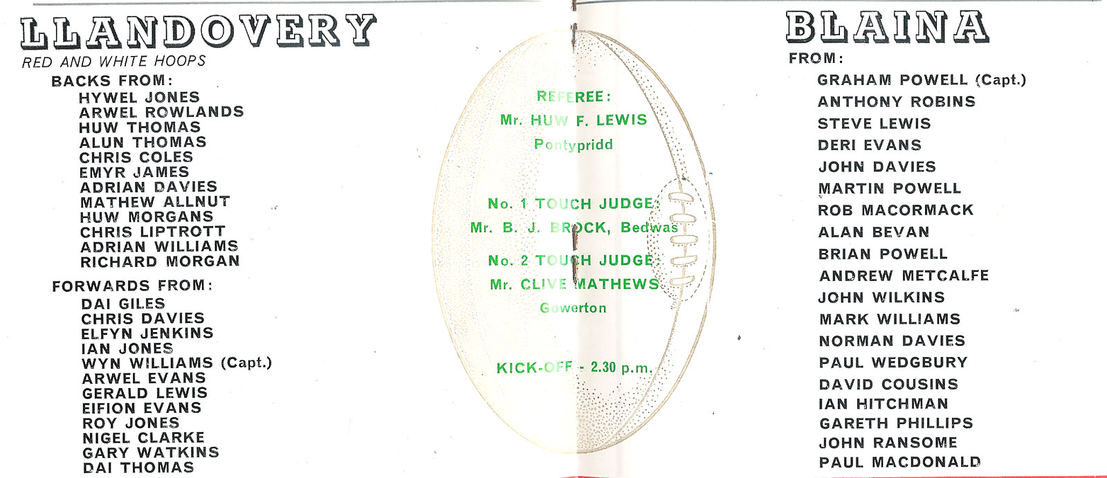 ABERCYNON - ABERAVON - ABERTILLERY - BARGOED - BEDWAS - BLAINA - BONYMAEN - BRIDGEND - CAERPHILLY - CARDIFF - CROSS KEYS - CUP FINALS & SEMI-FINALS - DUNVANT - EBBW VALE - FELINFOEL - GLAMORGAN WANDERERS - LLANDOVERY - LLANELLI - LLANHARAN - MAESTEG - MERTHYR - NEATH - NEWBRIDGE - NEWPORT - OSPREYS - PENARTH - PONTYPOOL - PONTYPRIDD - RESOLVEN - RUMNEY - SOUTH WALES POLICE - ST PETERS - SWANSEA - TENBY - TREDEGAR - TREORCHY - UWIC - YSTRADGYNLAIS - WELSH COUNTIES & REGIONAL |