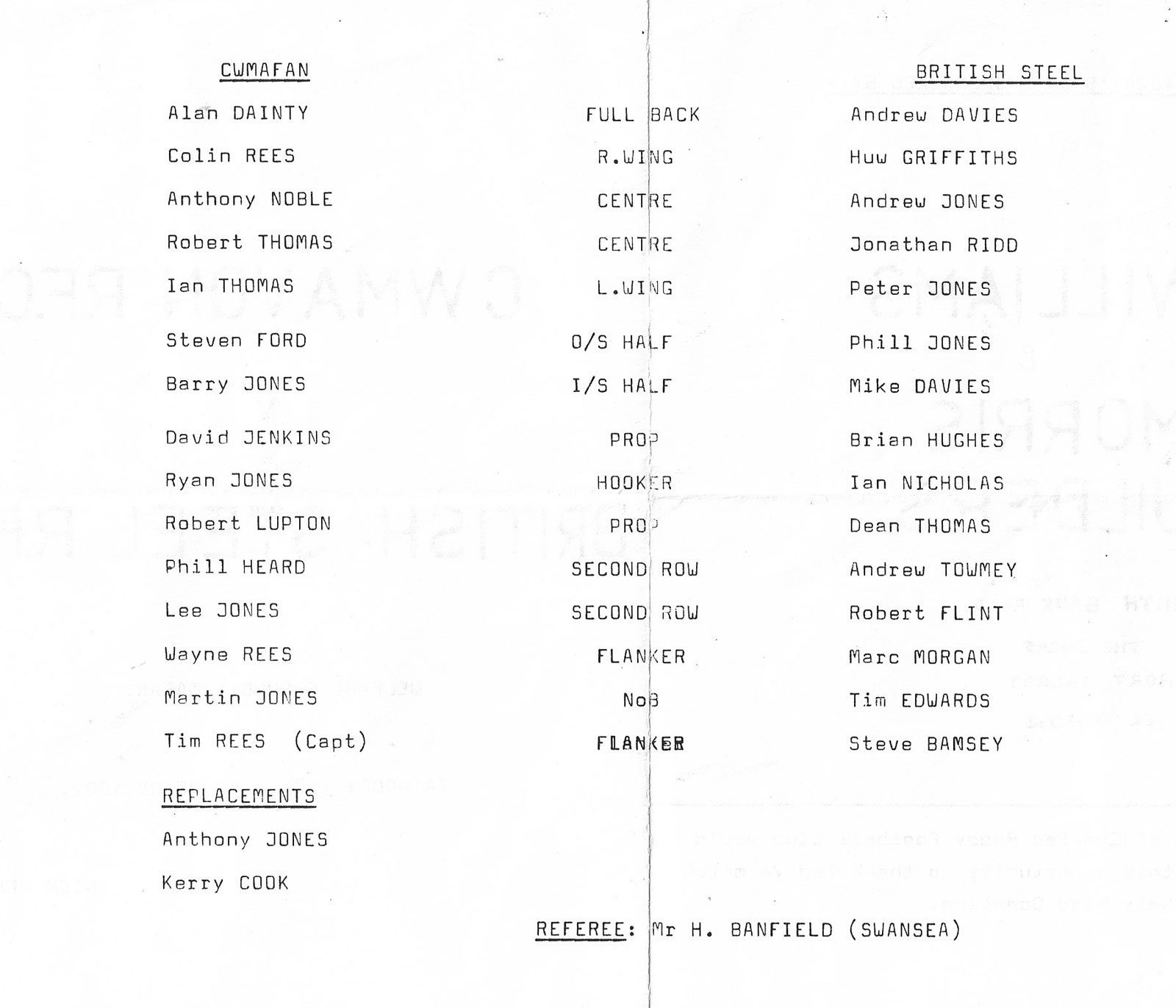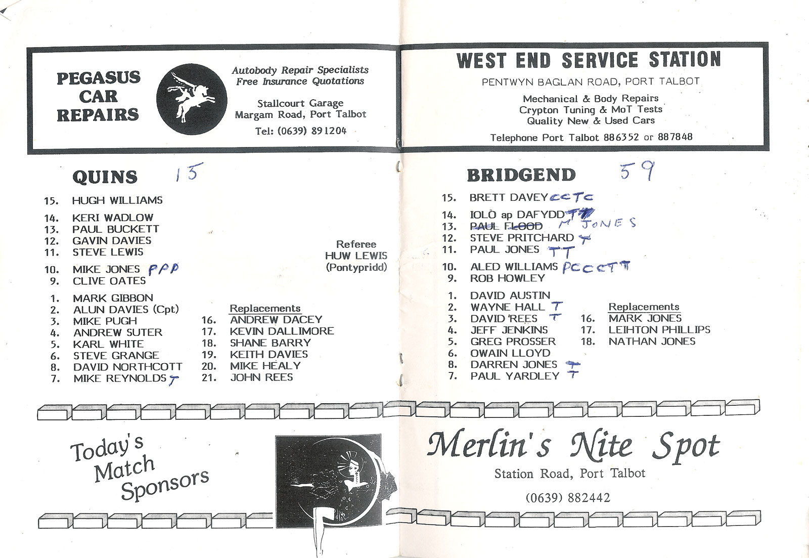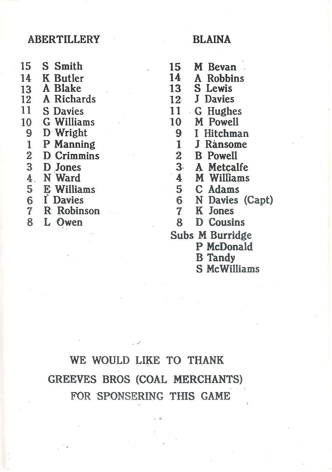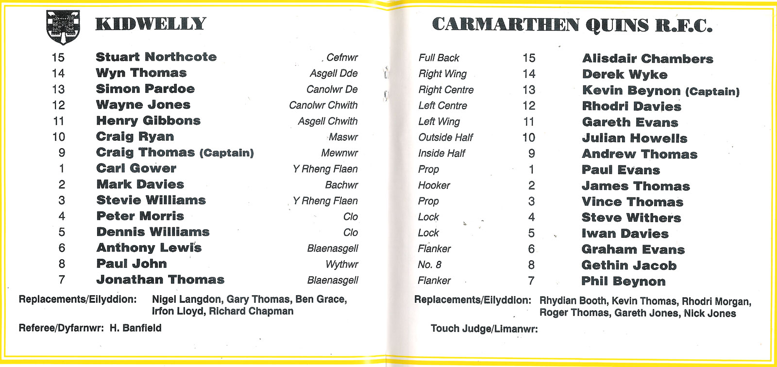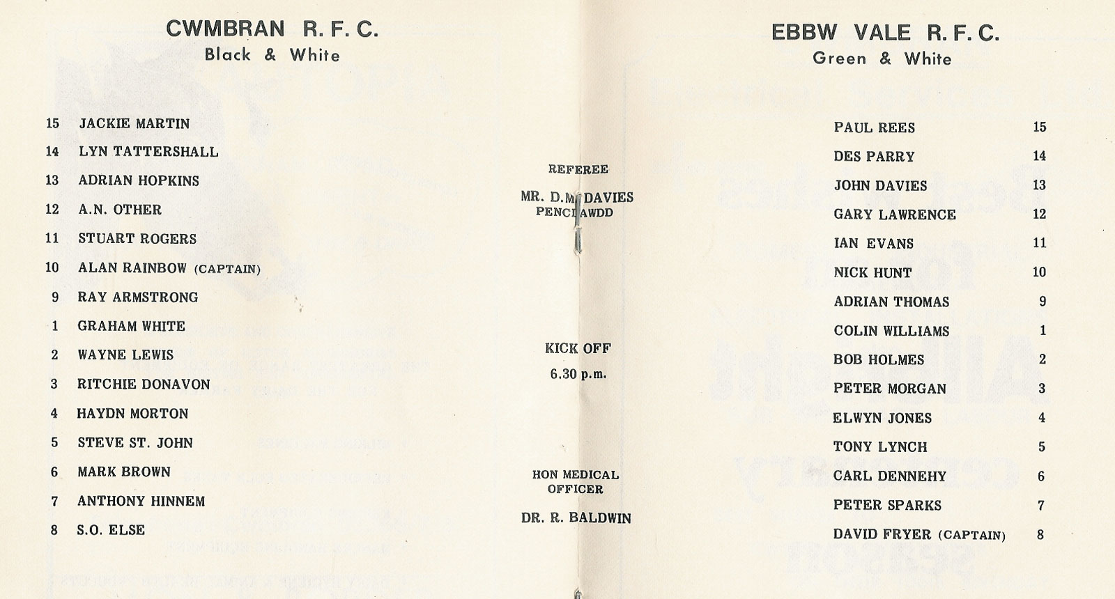 ABERCYNON - ABERAVON - ABERTILLERY - BARGOED - BEDWAS - BLAINA - BONYMAEN - BRIDGEND - CAERPHILLY - CARDIFF - CROSS KEYS - CUP FINALS & SEMI-FINALS - DUNVANT - EBBW VALE - FELINFOEL - GLAMORGAN WANDERERS - LLANDOVERY - LLANELLI - LLANHARAN - MAESTEG - MERTHYR - NEATH - NEWBRIDGE - NEWPORT - OSPREYS - PENARTH - PONTYPOOL - PONTYPRIDD - RESOLVEN - RUMNEY - SOUTH WALES POLICE - ST PETERS - SWANSEA - TENBY - TREDEGAR - TREORCHY - UWIC - YSTRADGYNLAIS - WELSH COUNTIES & REGIONAL |