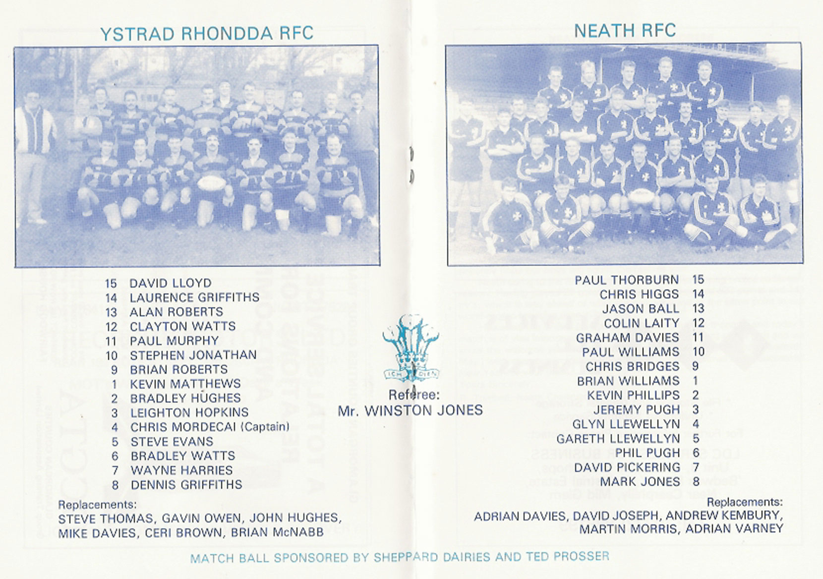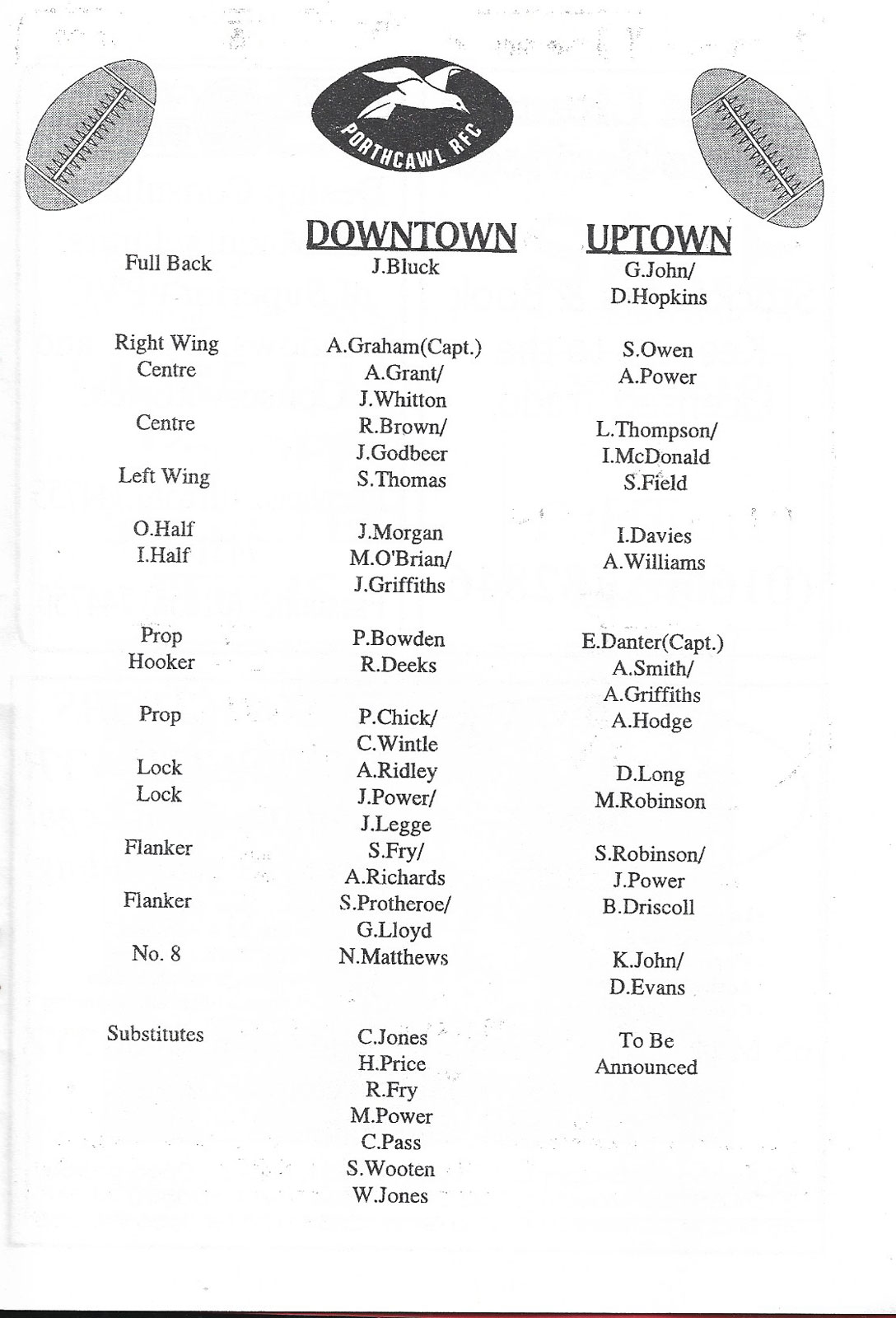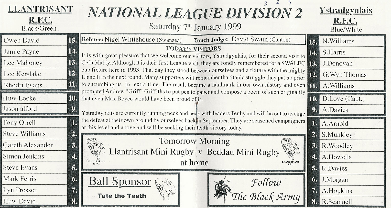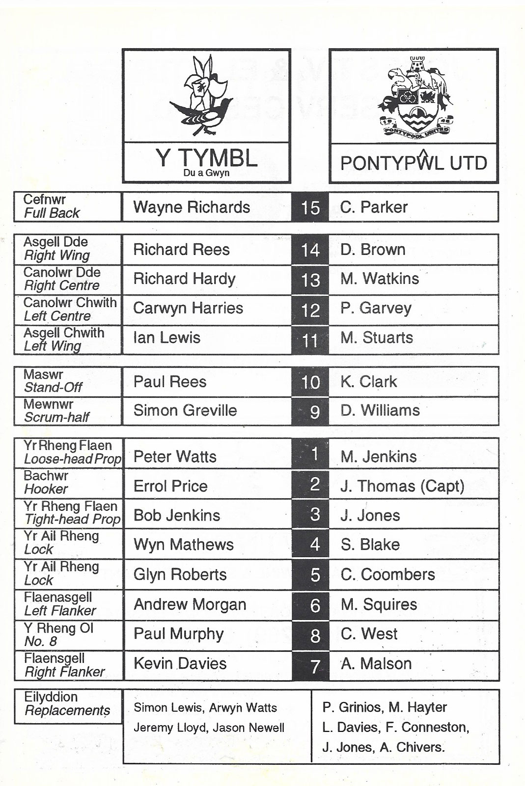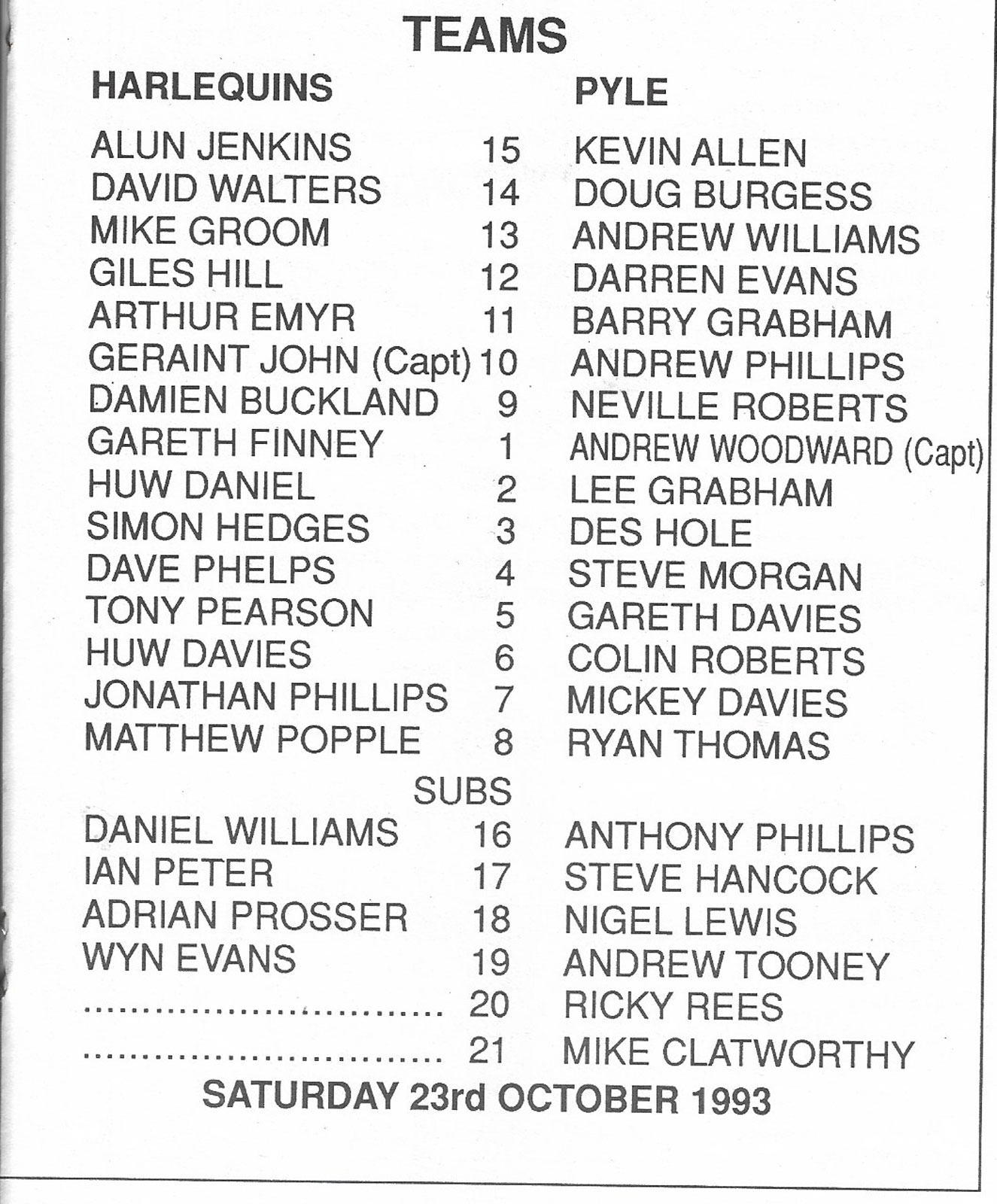 ABERCYNON - ABERAVON - ABERTILLERY - BARGOED - BEDWAS - BLAINA - BONYMAEN - BRIDGEND - CAERPHILLY - CARDIFF - CROSS KEYS - CUP FINALS & SEMI-FINALS - DUNVANT - EBBW VALE - FELINFOEL - GLAMORGAN WANDERERS - LLANDOVERY - LLANELLI - LLANHARAN - MAESTEG - MERTHYR - NEATH - NEWBRIDGE - NEWPORT - OSPREYS - PENARTH - PONTYPOOL - PONTYPRIDD - RESOLVEN - RUMNEY - SOUTH WALES POLICE - ST PETERS - SWANSEA - TENBY - TREDEGAR - TREORCHY - UWIC - YSTRADGYNLAIS - WELSH COUNTIES & REGIONAL |