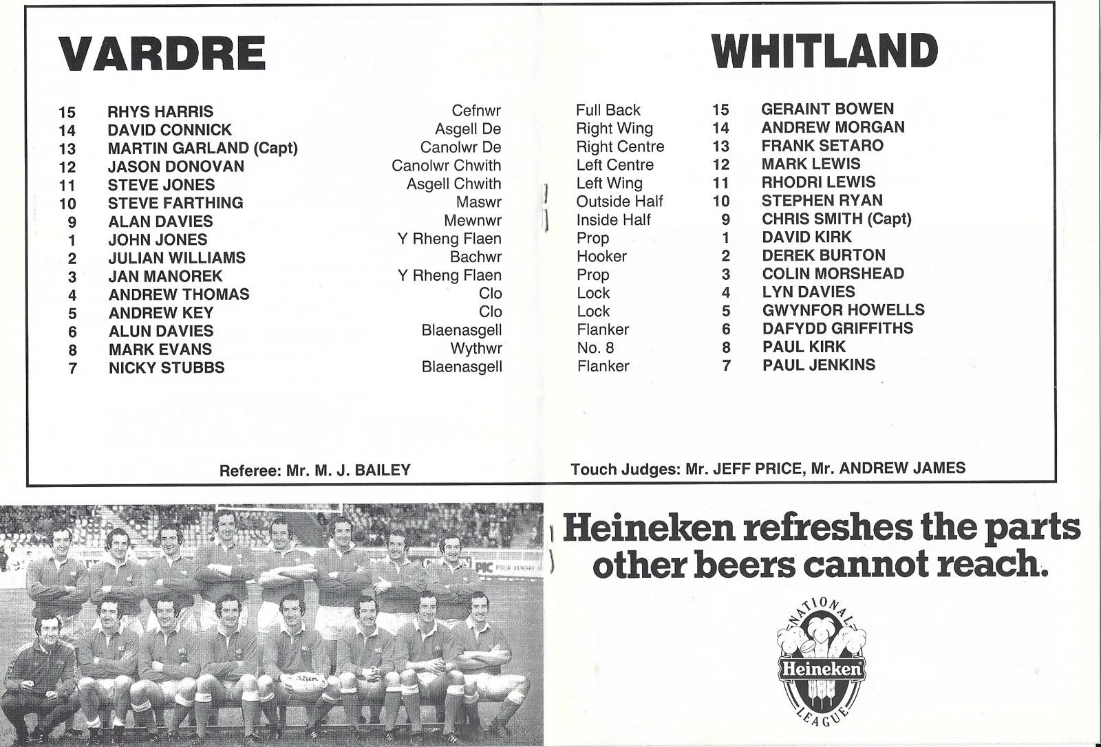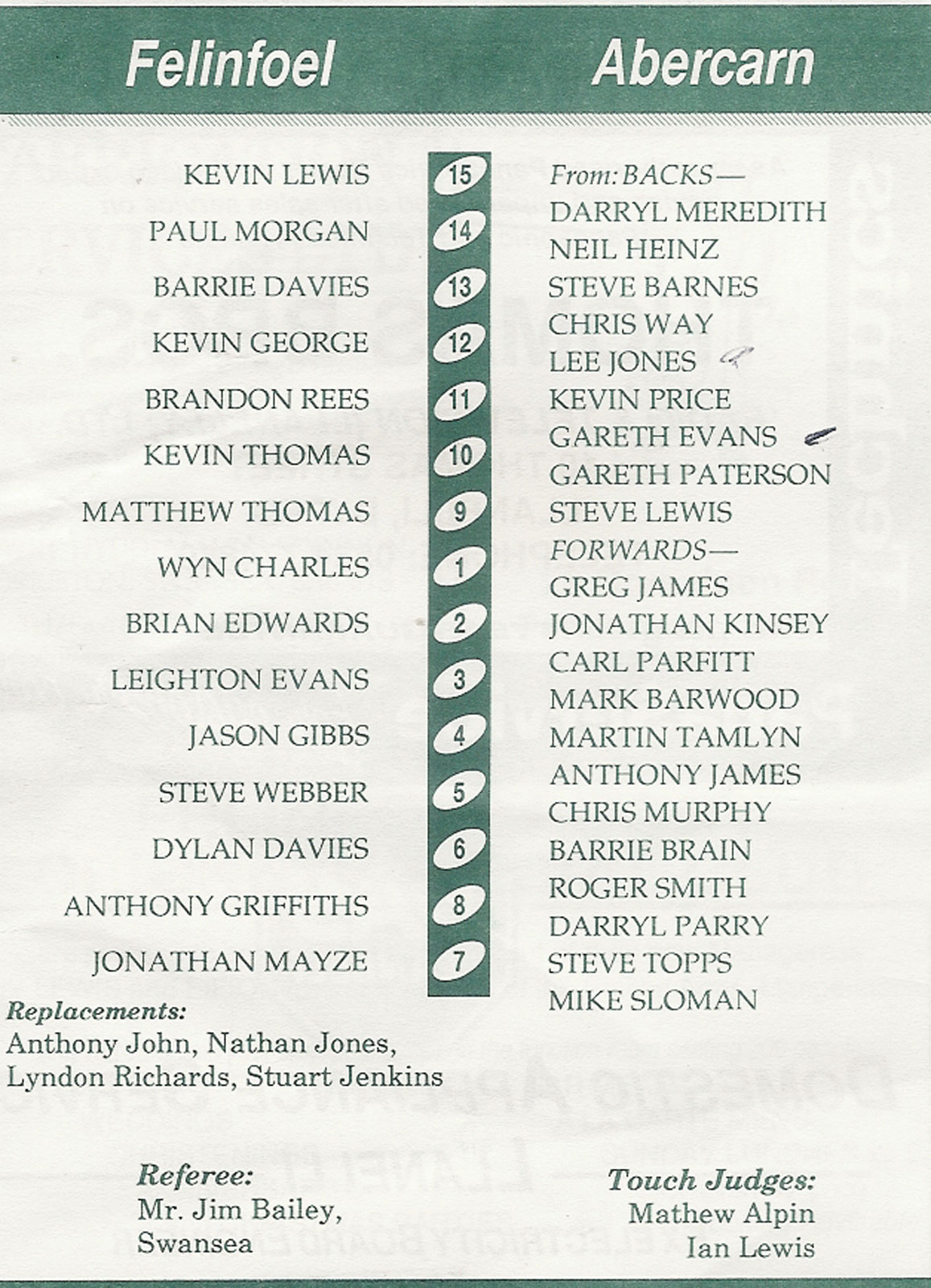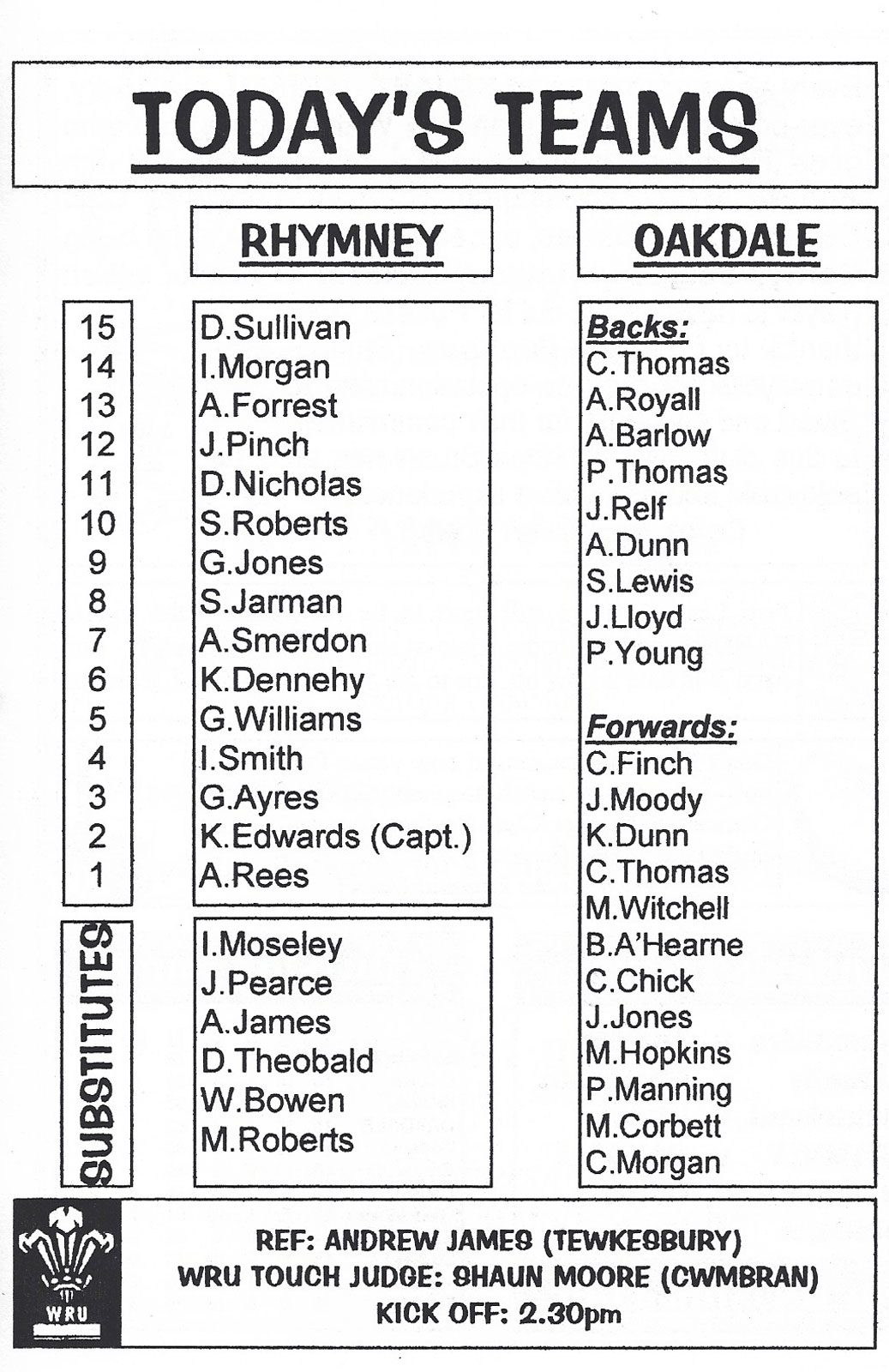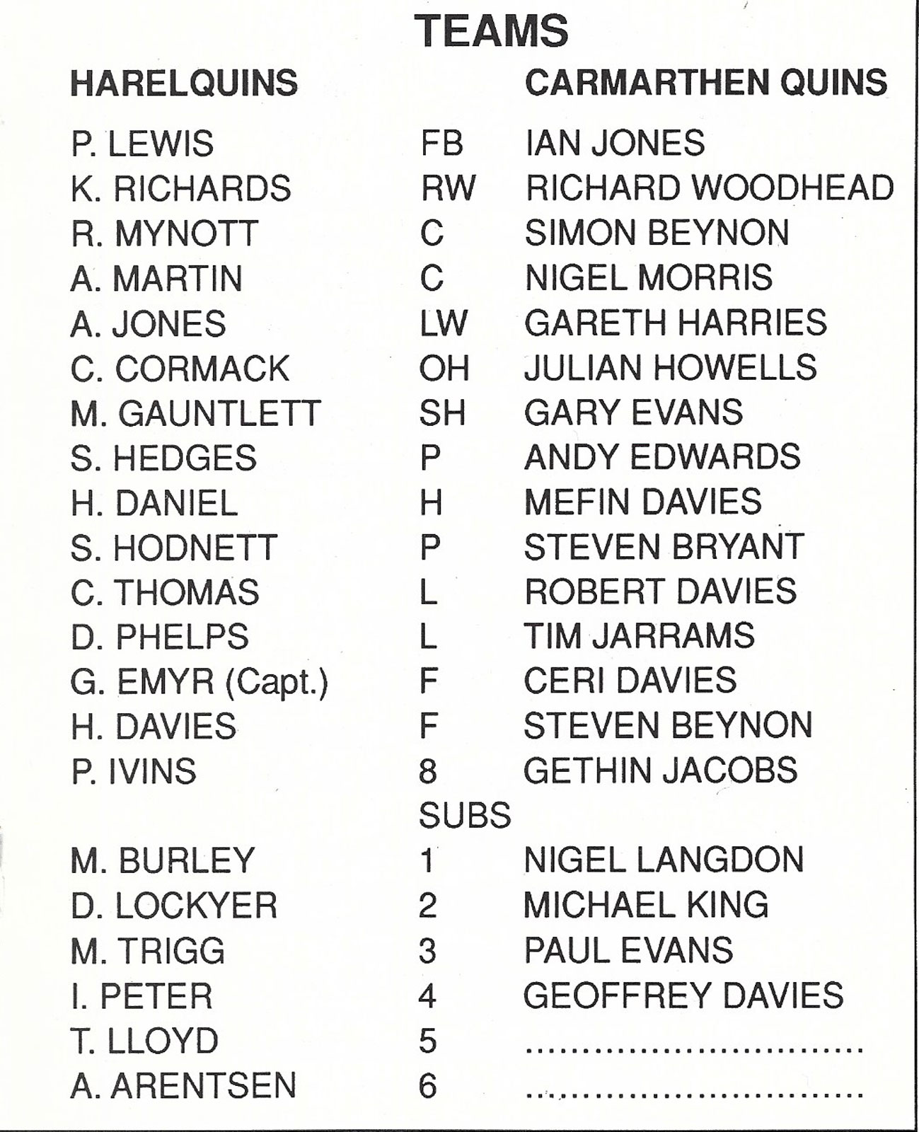 ABERCYNON - ABERAVON - ABERTILLERY - BARGOED - BEDWAS - BLAINA - BONYMAEN - BRIDGEND - CAERPHILLY - CARDIFF - CROSS KEYS - CUP FINALS & SEMI-FINALS - DUNVANT - EBBW VALE - FELINFOEL - GLAMORGAN WANDERERS - LLANDOVERY - LLANELLI - LLANHARAN - MAESTEG - MERTHYR - NEATH - NEWBRIDGE - NEWPORT - OSPREYS - PENARTH - PONTYPOOL - PONTYPRIDD - RESOLVEN - RUMNEY - SOUTH WALES POLICE - ST PETERS - SWANSEA - TENBY - TREDEGAR - TREORCHY - UWIC - YSTRADGYNLAIS - WELSH COUNTIES & REGIONAL |