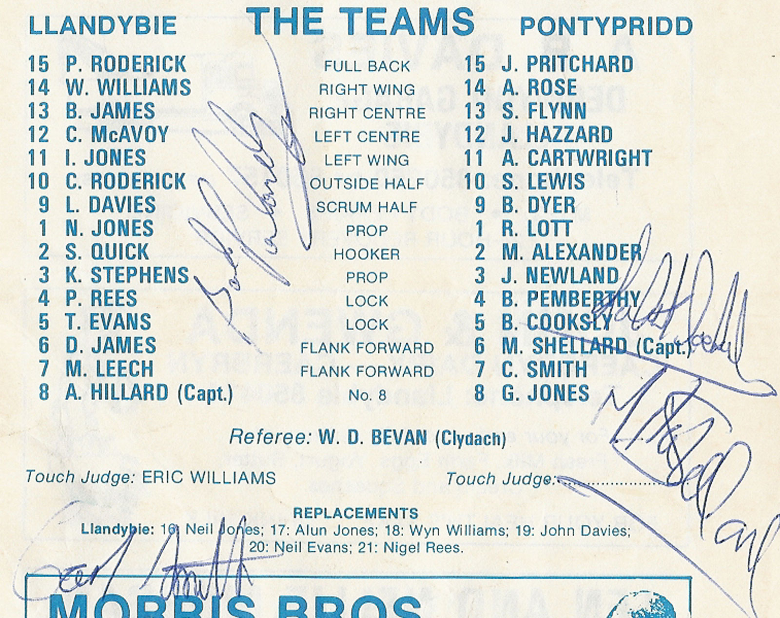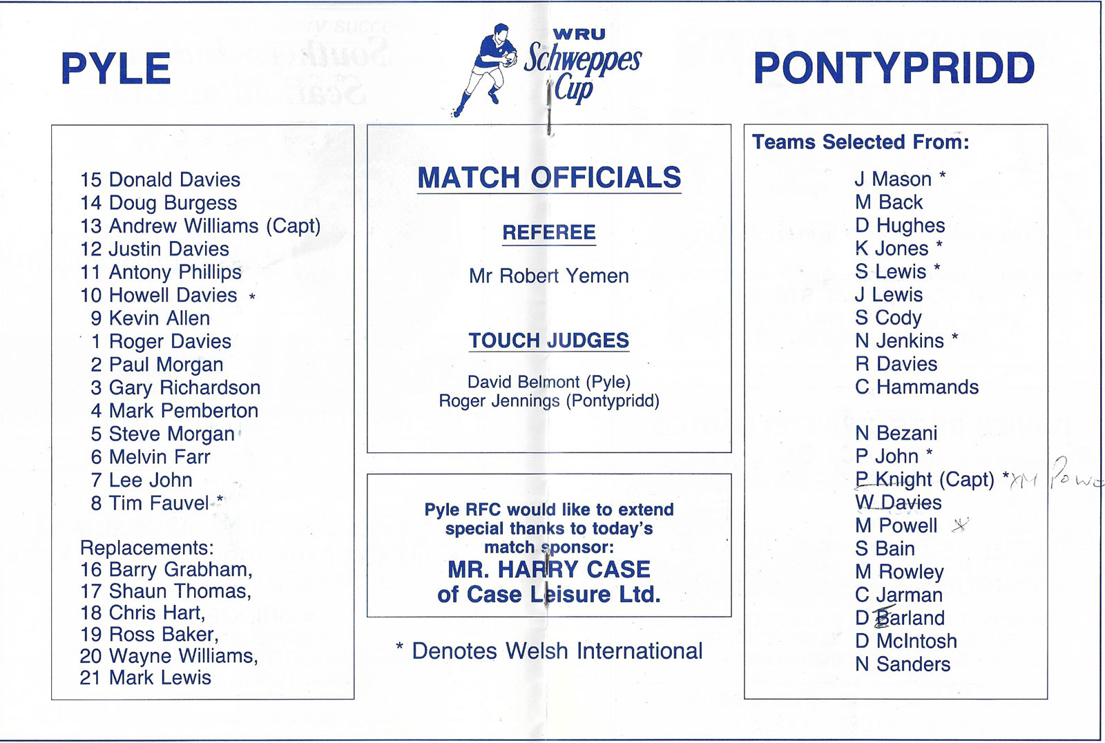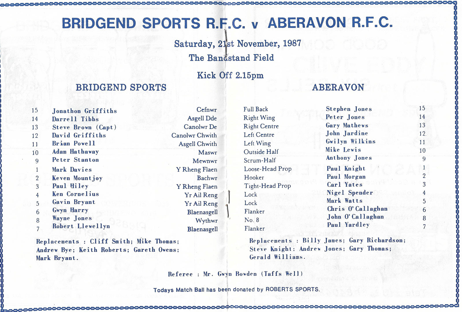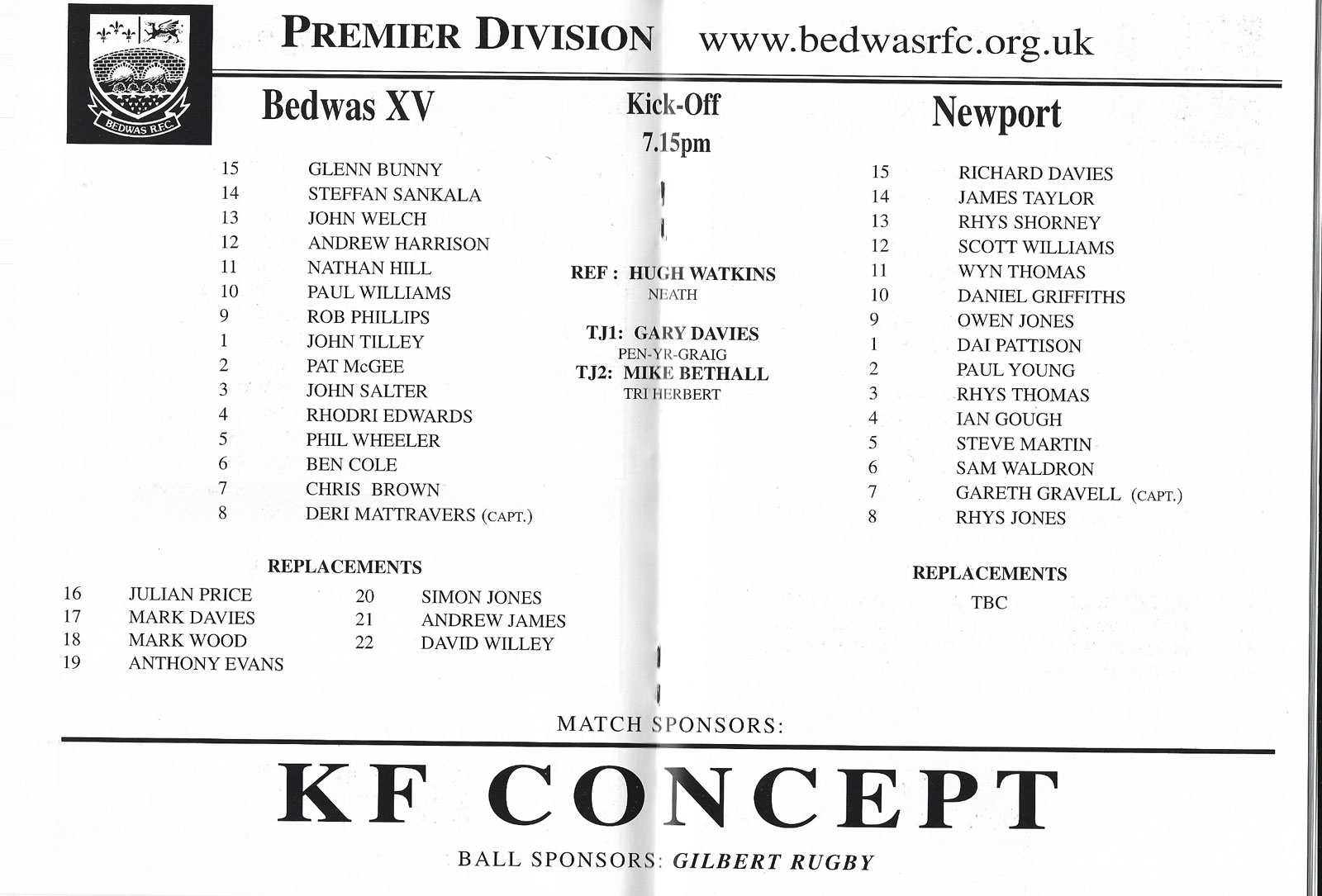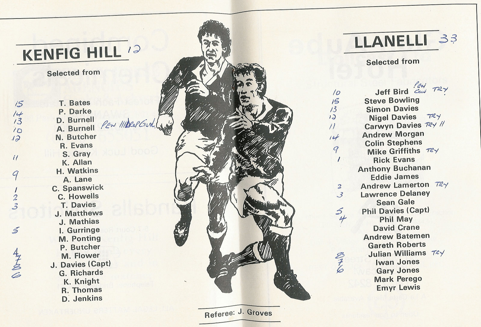ABERCYNON - ABERAVON - ABERTILLERY - BARGOED - BEDWAS - BLAINA - BONYMAEN - BRIDGEND - CAERPHILLY - CARDIFF - CROSS KEYS - CUP FINALS & SEMI-FINALS - DUNVANT - EBBW VALE - FELINFOEL - GLAMORGAN WANDERERS - LLANDOVERY - LLANELLI - LLANHARAN - MAESTEG - MERTHYR - NEATH - NEWBRIDGE - NEWPORT - OSPREYS - PENARTH - PONTYPOOL - PONTYPRIDD - RESOLVEN - RUMNEY - SOUTH WALES POLICE - ST PETERS - SWANSEA - TENBY - TREDEGAR - TREORCHY - UWIC - YSTRADGYNLAIS - WELSH COUNTIES & REGIONAL |