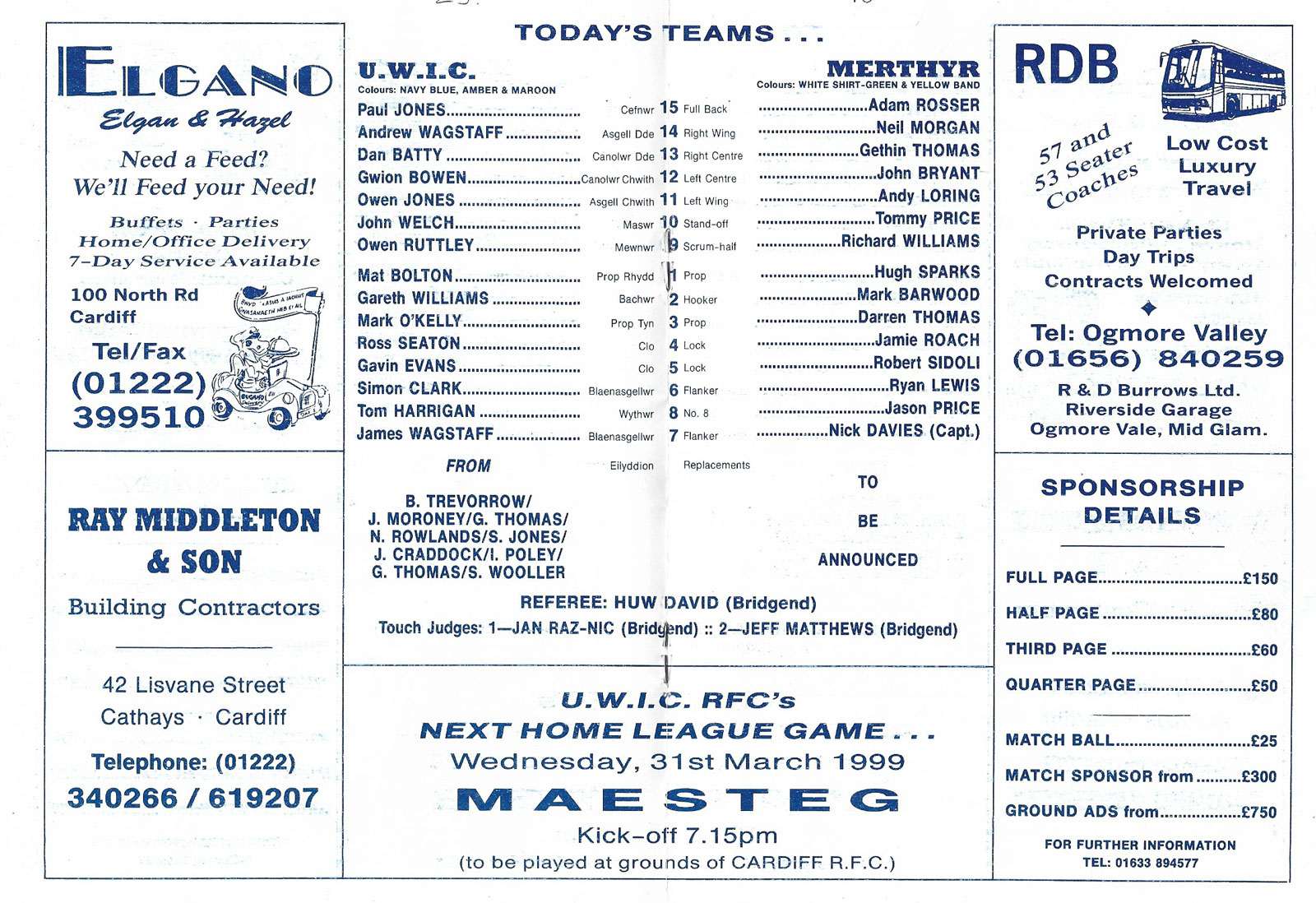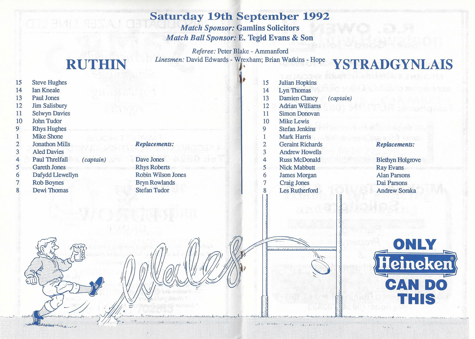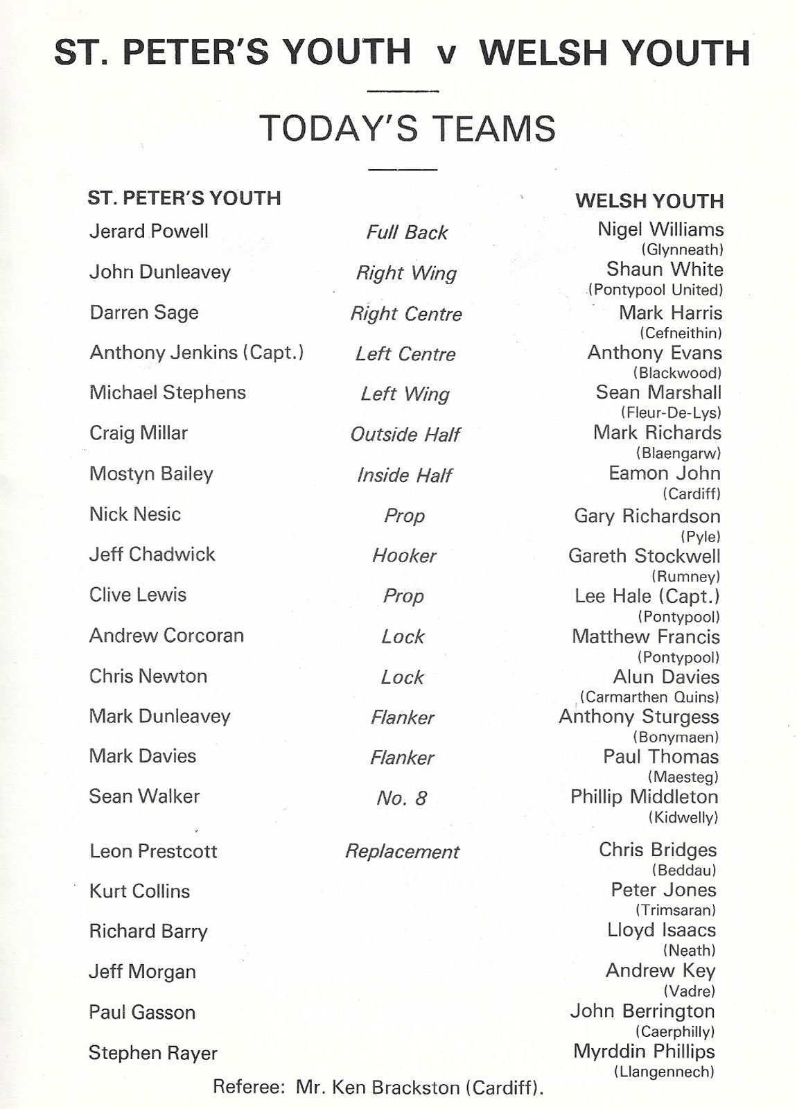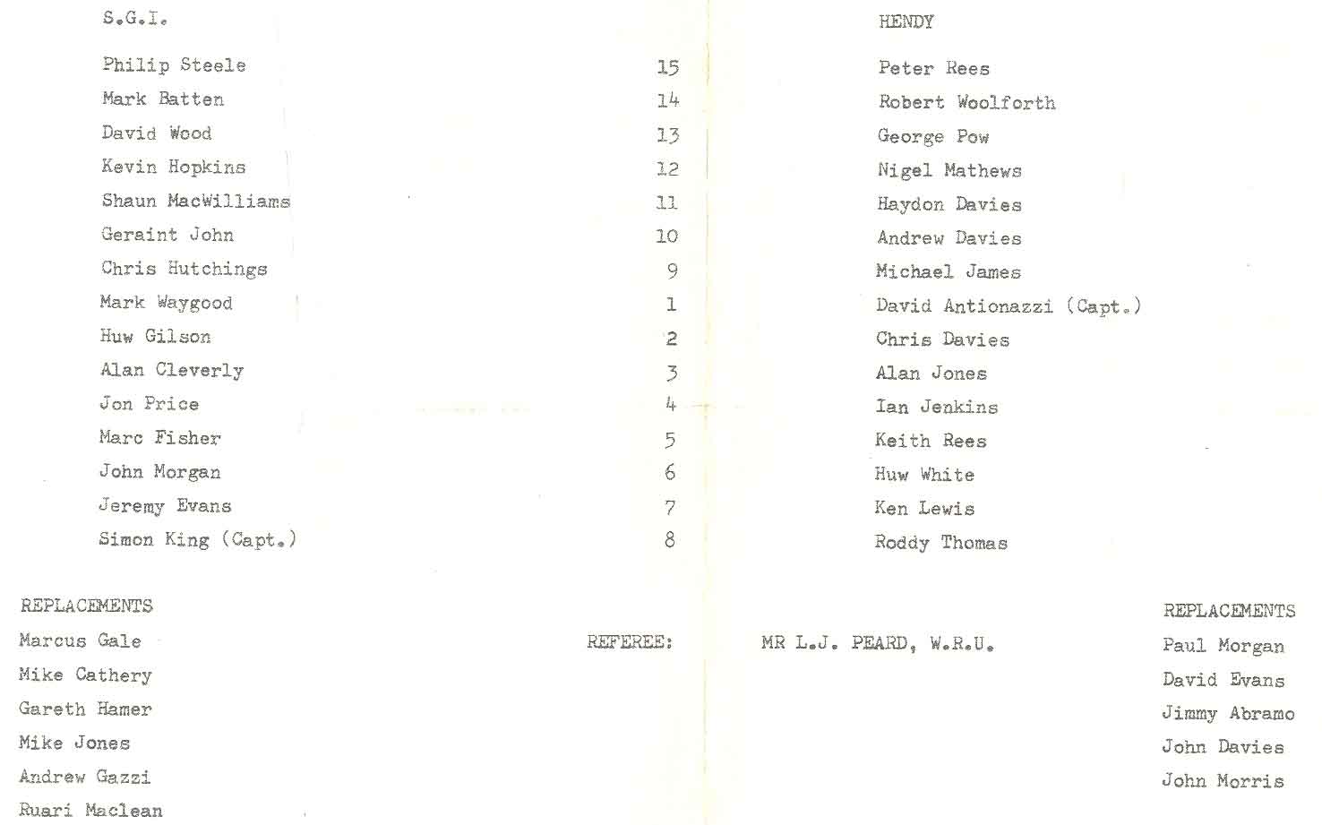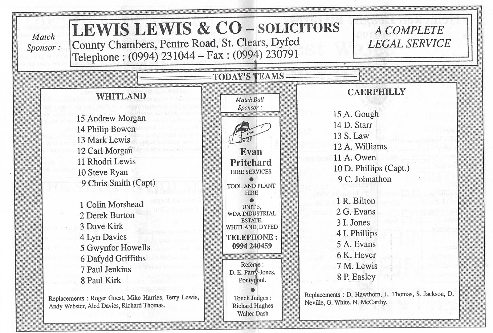 ABERCYNON - ABERAVON - ABERTILLERY - BARGOED - BEDWAS - BLAINA - BONYMAEN - BRIDGEND - CAERPHILLY - CARDIFF - CROSS KEYS - CUP FINALS & SEMI-FINALS - DUNVANT - EBBW VALE - FELINFOEL - GLAMORGAN WANDERERS - LLANDOVERY - LLANELLI - LLANHARAN - MAESTEG - MERTHYR - NEATH - NEWBRIDGE - NEWPORT - OSPREYS - PENARTH - PONTYPOOL - PONTYPRIDD - RESOLVEN - RUMNEY - SOUTH WALES POLICE - ST PETERS - SWANSEA - TENBY - TREDEGAR - TREORCHY - UWIC - YSTRADGYNLAIS - WELSH COUNTIES & REGIONAL |