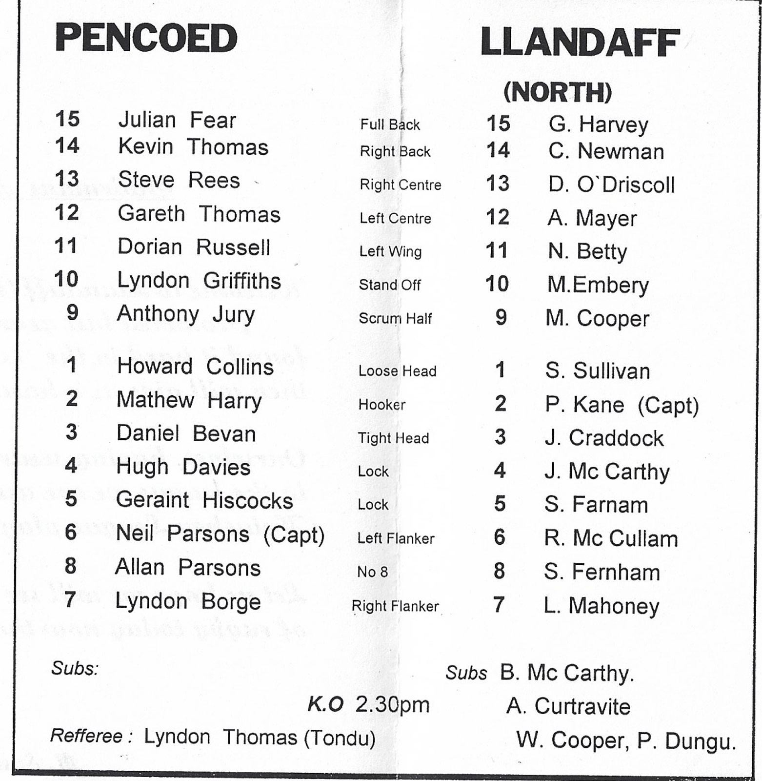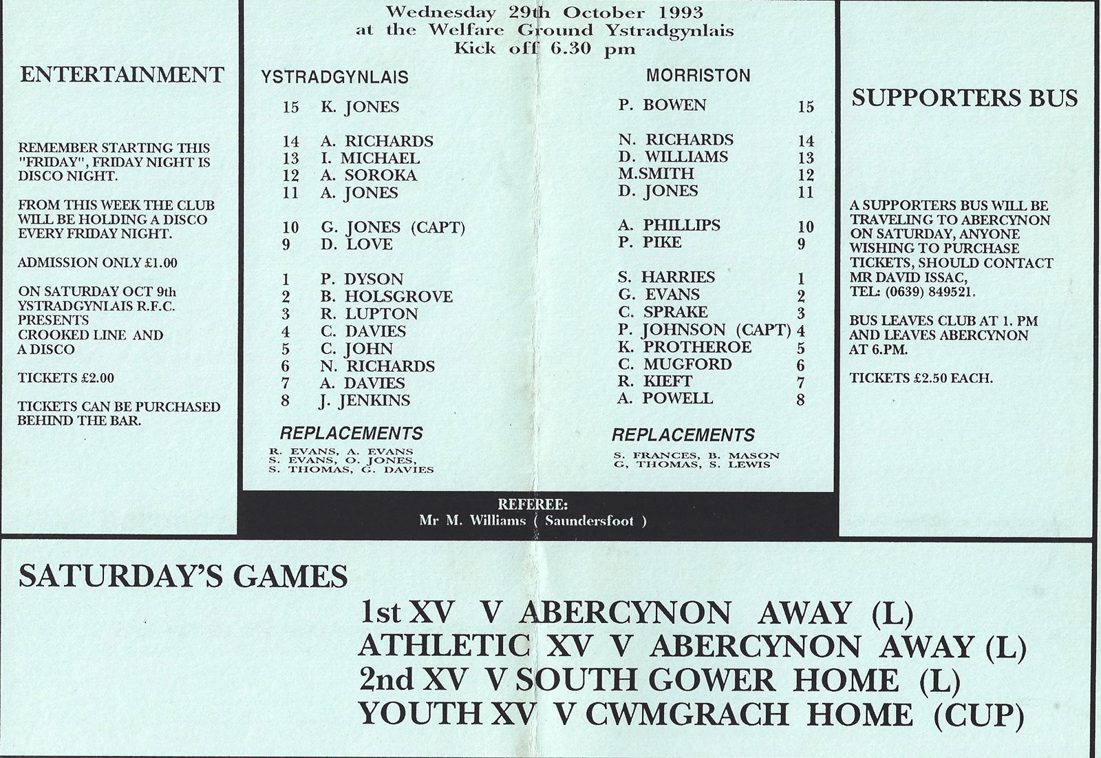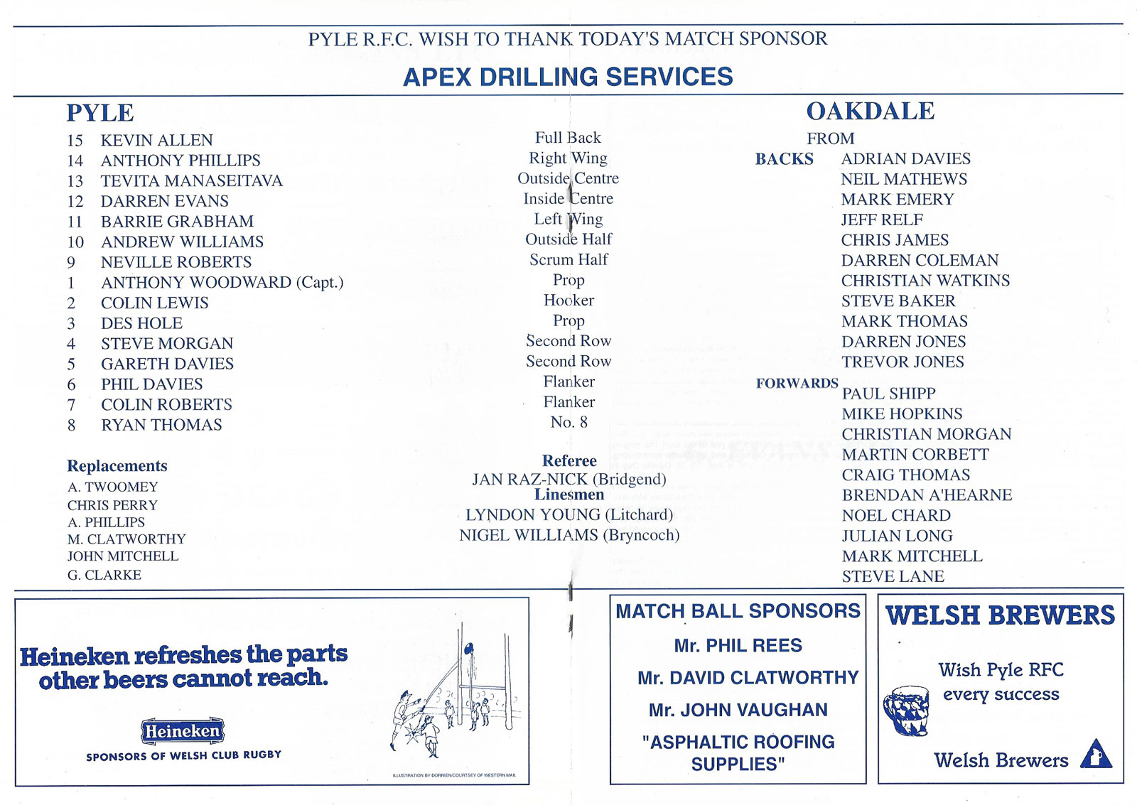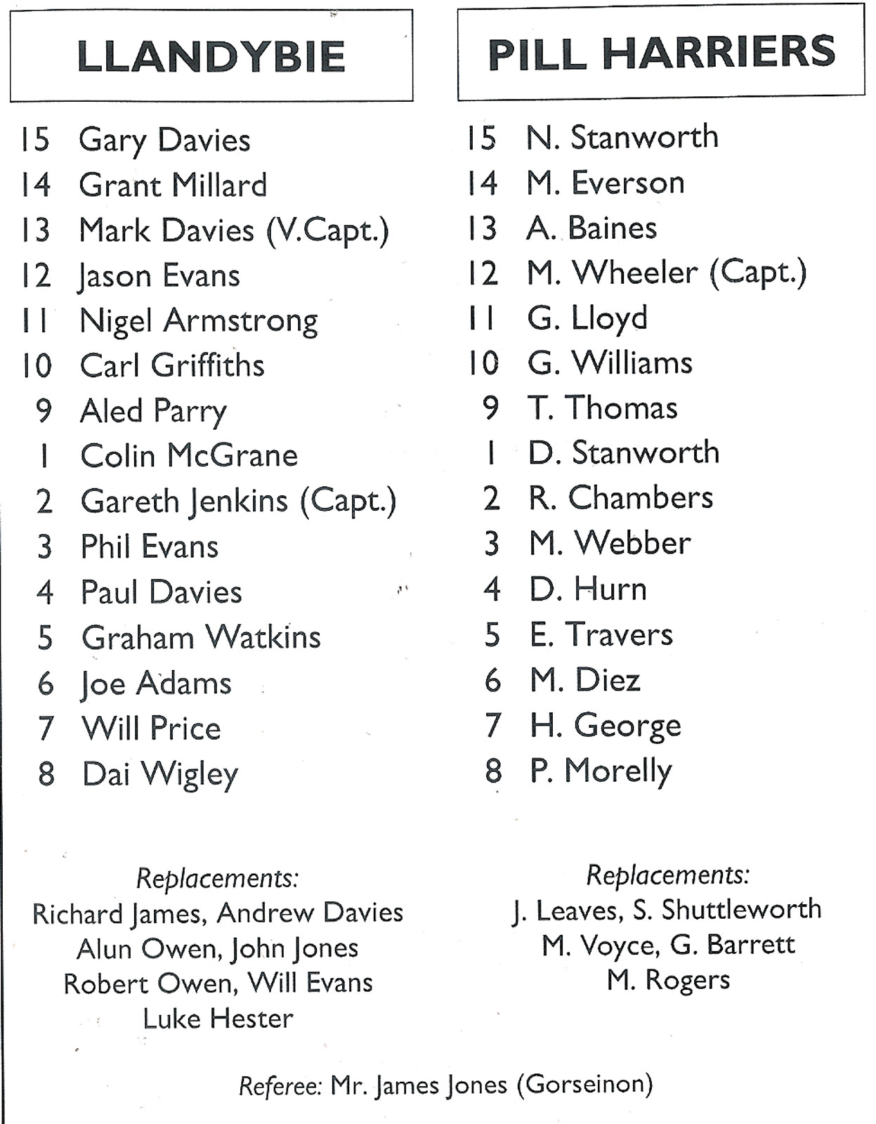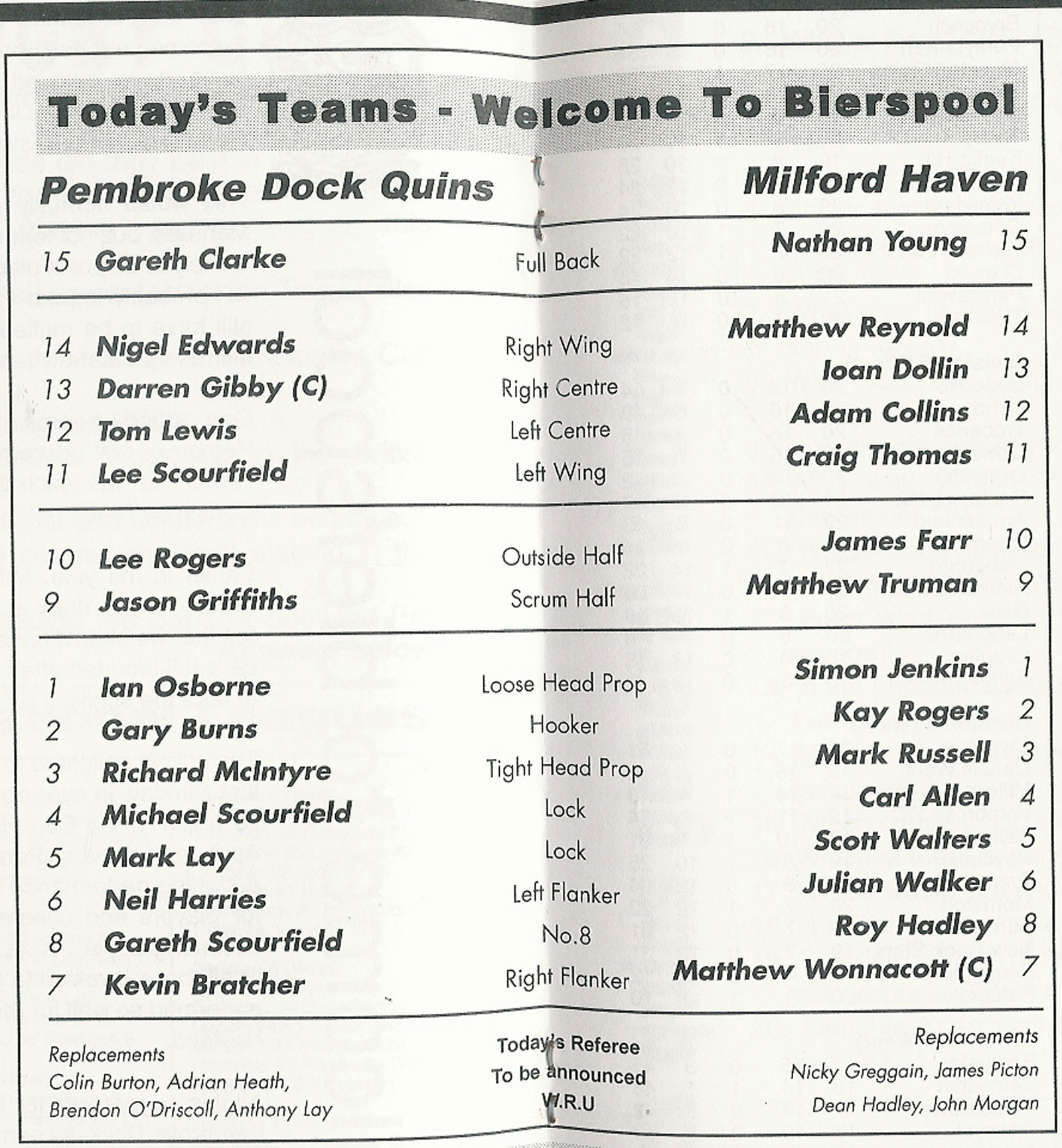 ABERCYNON - ABERAVON - ABERTILLERY - BARGOED - BEDWAS - BLAINA - BONYMAEN - BRIDGEND - CAERPHILLY - CARDIFF - CROSS KEYS - CUP FINALS & SEMI-FINALS - DUNVANT - EBBW VALE - FELINFOEL - GLAMORGAN WANDERERS - LLANDOVERY - LLANELLI - LLANHARAN - MAESTEG - MERTHYR - NEATH - NEWBRIDGE - NEWPORT - OSPREYS - PENARTH - PONTYPOOL - PONTYPRIDD - RESOLVEN - RUMNEY - SOUTH WALES POLICE - ST PETERS - SWANSEA - TENBY - TREDEGAR - TREORCHY - UWIC - YSTRADGYNLAIS - WELSH COUNTIES & REGIONAL |