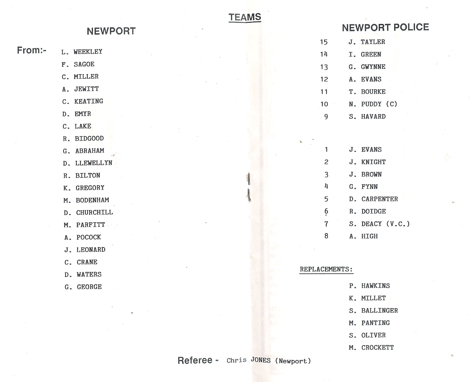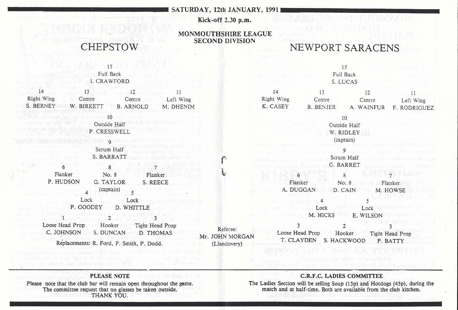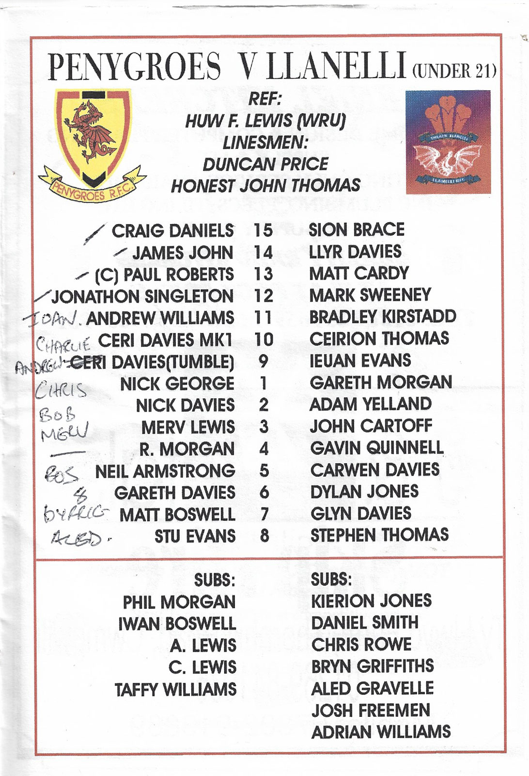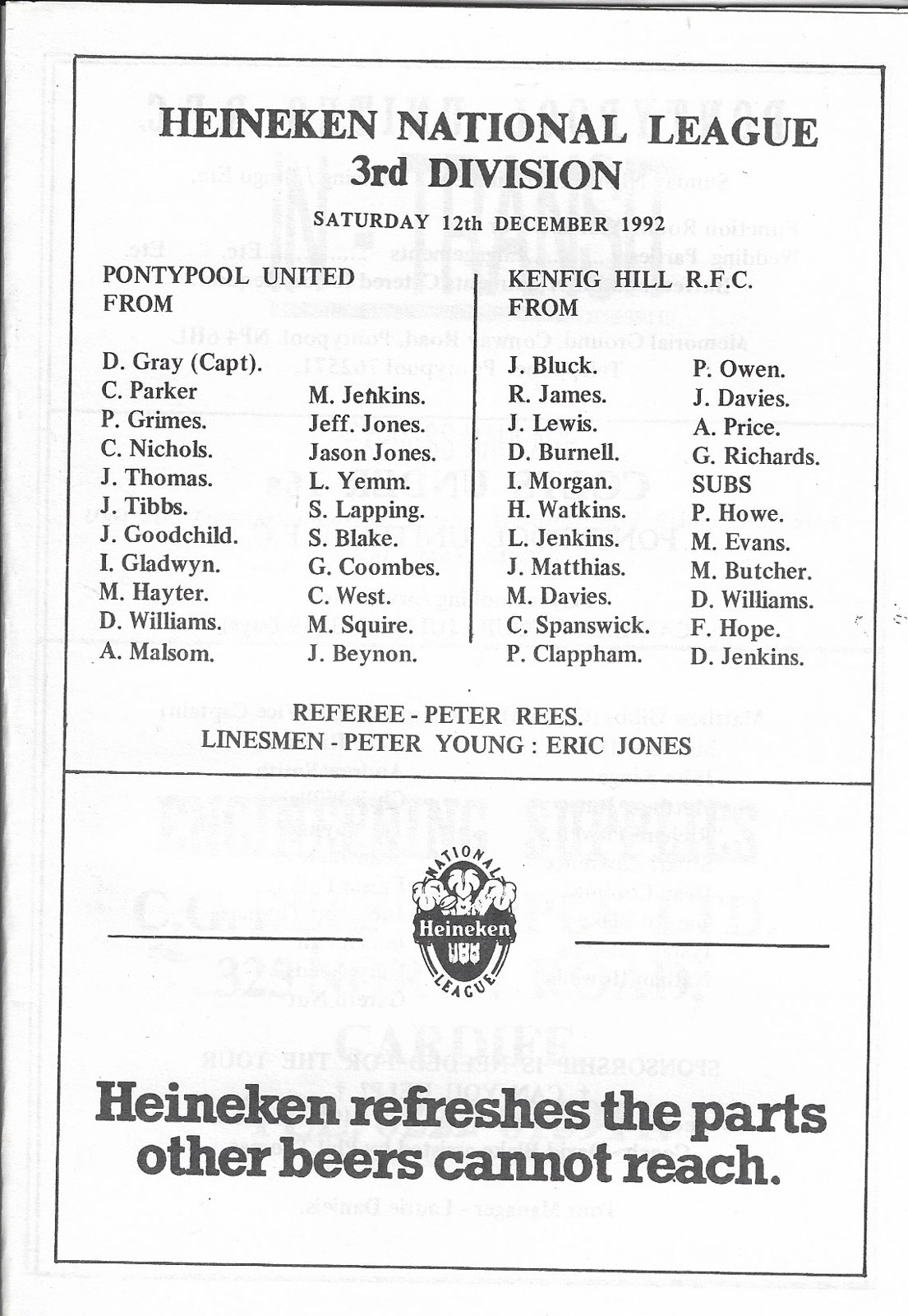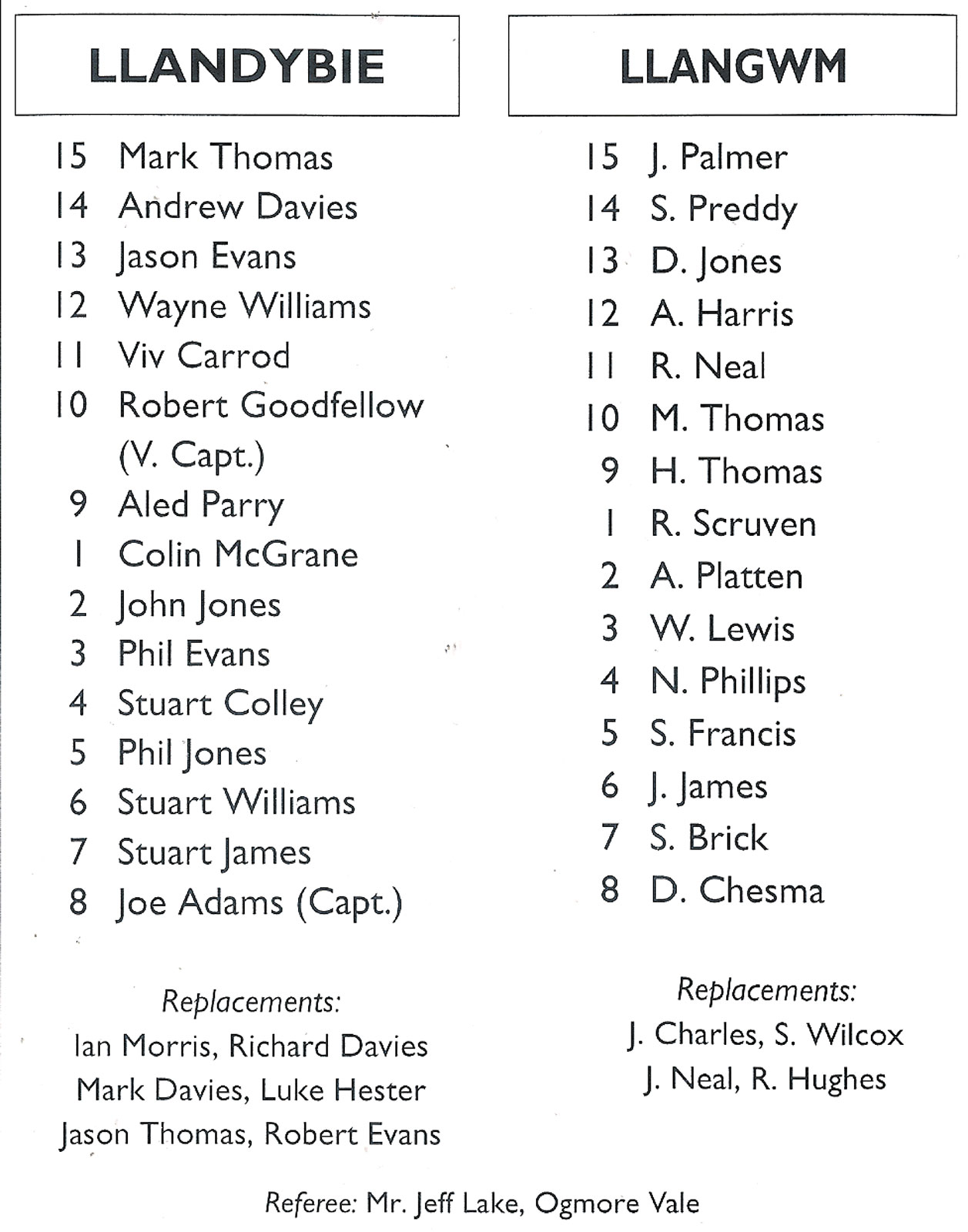 ABERCYNON - ABERAVON - ABERTILLERY - BARGOED - BEDWAS - BLAINA - BONYMAEN - BRIDGEND - CAERPHILLY - CARDIFF - CROSS KEYS - CUP FINALS & SEMI-FINALS - DUNVANT - EBBW VALE - FELINFOEL - GLAMORGAN WANDERERS - LLANDOVERY - LLANELLI - LLANHARAN - MAESTEG - MERTHYR - NEATH - NEWBRIDGE - NEWPORT - OSPREYS - PENARTH - PONTYPOOL - PONTYPRIDD - RESOLVEN - RUMNEY - SOUTH WALES POLICE - ST PETERS - SWANSEA - TENBY - TREDEGAR - TREORCHY - UWIC - YSTRADGYNLAIS - WELSH COUNTIES & REGIONAL |