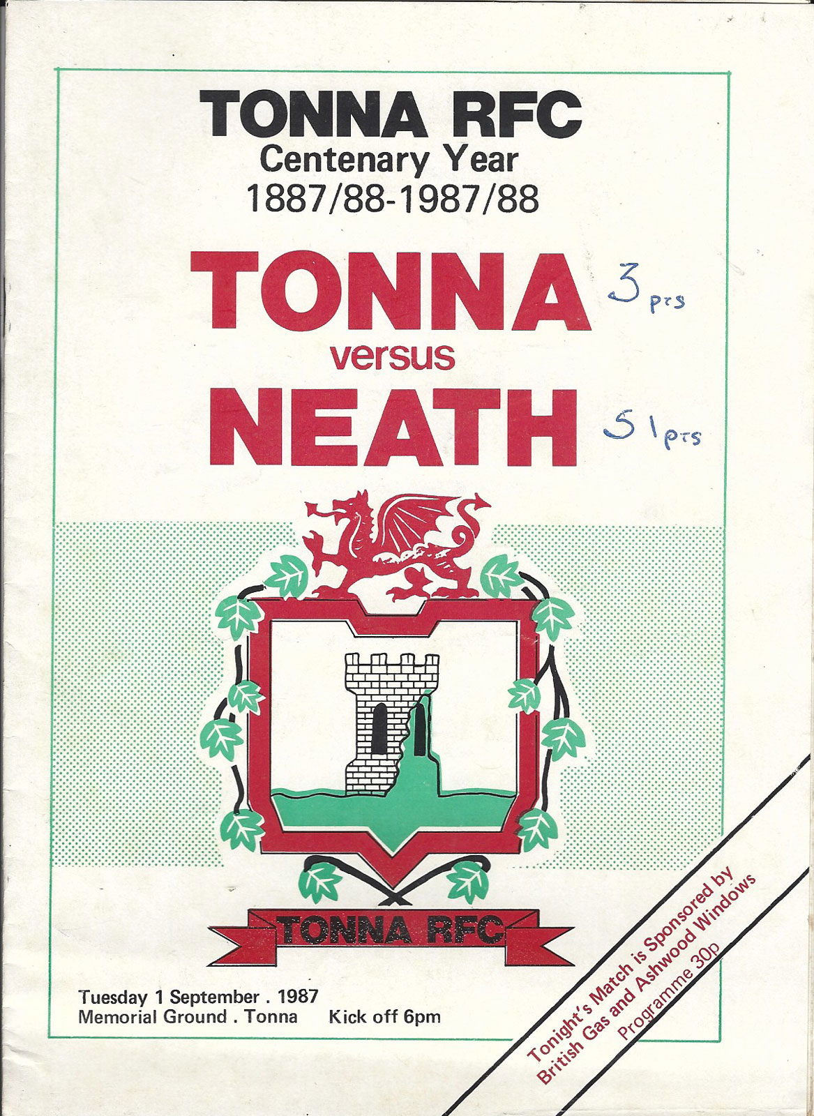 Tonna v Neath - centenary match | 1 Sep 1987 | Tonna | 3-51 | good - score on front Ref: B224-A-prcbwa-tna19870901nea* - £4.00 |
