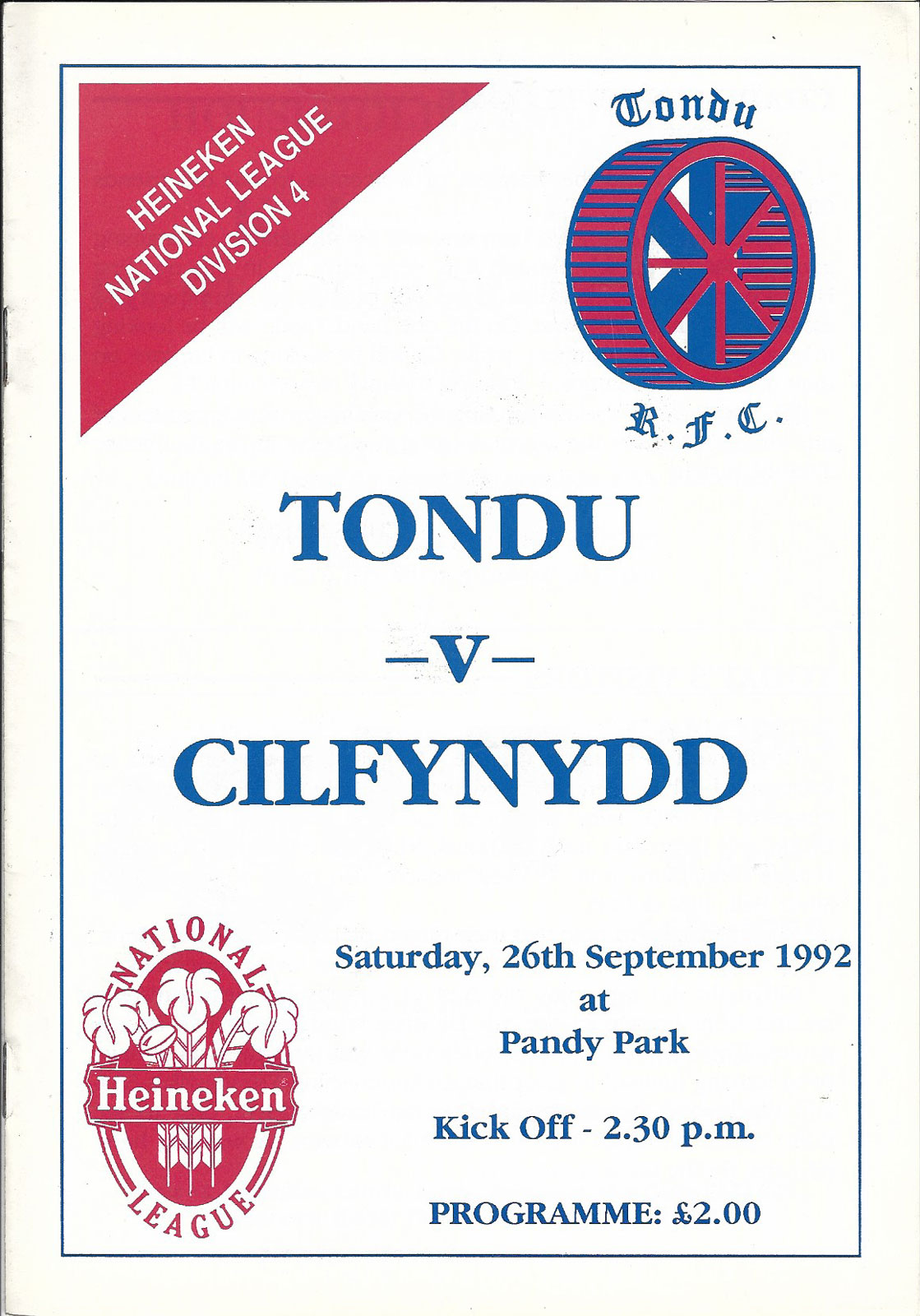 Tondu v Cilfynydd | 26 Sep 1992 | Pandy Park, Tondu | very good Ref: RC522-F-prcbwa-tdu19920926cil - £2.00 |