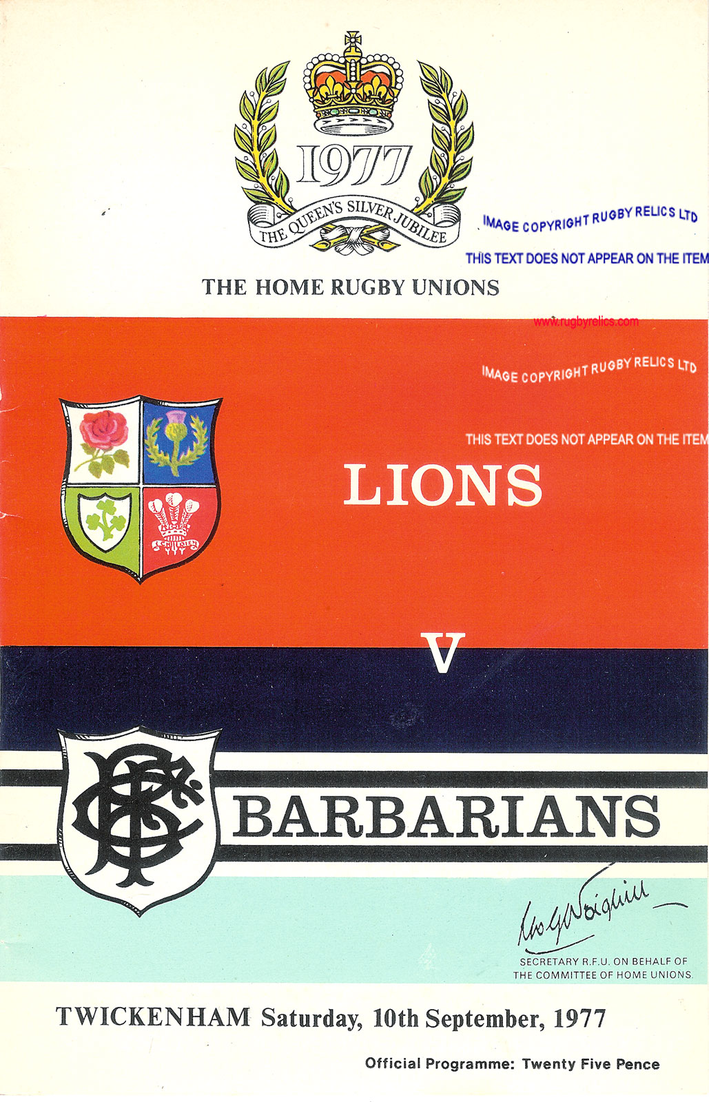 BRITISH LIONS v BARBARIANS - 10th September 1977 - On their return from NZ the British Lions played a match against the Barbarians at Twickenham to celebrate the Queen's Silver Jubilee and raise funds for the Jubilee charity. This is the first ever British Lions home match. The Lions were victorious in the match by 23 points to 14 in front of a capacity crowd at Twickenham. |