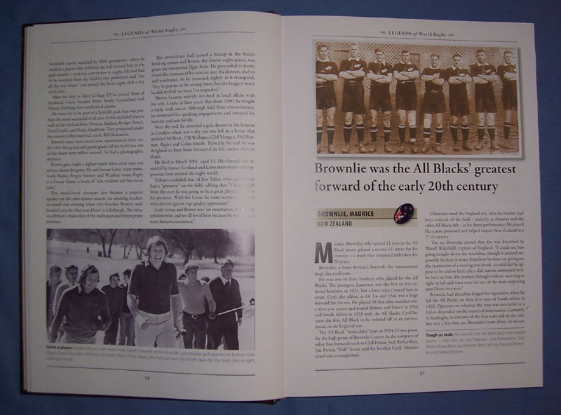 The players who have signed are as follows............... Pierre Albaladejo (France), Bill Beaumont (England), Phil Bennett (Wales), Naas Botha (South Africa), David Campese (Australia), Will Carling (England), Ken Catchpole (Australia), Johan Claassen (South Africa), Des Connor (Australia), Fran Cotton (England), Michel Crauste (France), Gerald Davies (Wales), Mervyn Davies (Wales), Benoit Dauga (France), David Duckham (England), Morne Du Plessis (South Africa), Frik Du Preez (South Africa), John Eales (Australia), Gareth Edwards (Wales), Mark Ella (Australia), Nick Farr-Jones (Australia), Sean Fitzpatrick (New Zealand), Grant Fox (New Zealand), John Gainsford (South Africa), Danie Gerber (South Africa), Mike Gibson (Ireland), Sid Going (New Zealand), Gavin Hastings (Scotland), Tim Horan (Australia), Andy Irvine (Scotland), Dickie Jeeps (England), Barry John (Wales), Michael Jones (New Zealand), Ian Kirkpatrick (New Zealand), Jackie Kyle (Ireland), Frank Laidlaw (Scotland), Brian Lochore (New Zealand), Michael Lynagh (Australia), Jo Maso (France), Jackie Matthews (Wales), Willie John McBride (Ireland), Fergie McCormick (New Zealand), Ian McGeechan (Scotland), Ian McLauchlan (Scotland), Colin Meads (New Zealand), Lucien Mias (France), Cliff Morgan (Wales), Karl Mullen (Ireland), Noel Murphy (Ireland), Tony Neary (England), Tony O'Reilly (Ireland), Simon Poidevin (Australia), Hugo Porta (Argentina), John Pullin (England), Derek Quinnell (Wales), Andy Ripley (England), Bev Risman (England), Bob Scott (New Zealand), Philippe Sella (France), Nick Shehadie (Australia), Kevin Skinner (New Zealand), Fergus Slattery (Ireland), Walter Spanghero (France), Joel Stransky (South Africa), Jim Telfer (Scotland), John Thornett (Australia), Rory Underwood (England), Joost Van Der Westhuizen (South Africa), Pierre Villepreux (France), Wilson Whineray (New Zealand), Tiny White (New Zealand), Bleddyn Williams (Wales), Chester Williams (South Africa), J P R Williams (Wales) Those players who have gone to the great signing in the sky............... Gerry Brand (South Africa), Gordon Brown (Scotland), Maurice Brownlie (New Zealand), Don Clarke (New Zealand), Bert Cooke (New Zealand), Danie Craven (South Africa), Ernie Crawford (Ireland), Dave Davies (England), Greg Davis (Australia), Ken Gray (New Zealand), Peter Jackson (England), Cliff Jones (Wales), Ken Jones (Wales), Tommy Lawton (Australia), Boy Louw (South Africa), Gerhard Morkel (South Africa), Hennie Muller (South Africa), George Nepia (New Zealand), Gwyn Nicholls (Wales), Bennie Osler (South Africa), 'Cherry' Pillman (England), Jean Prat (France), Ian Smith (Scotland), Cyril Towers (Australia), Kel Tremain (New Zealand), Billy Wallace (New Zealand), |