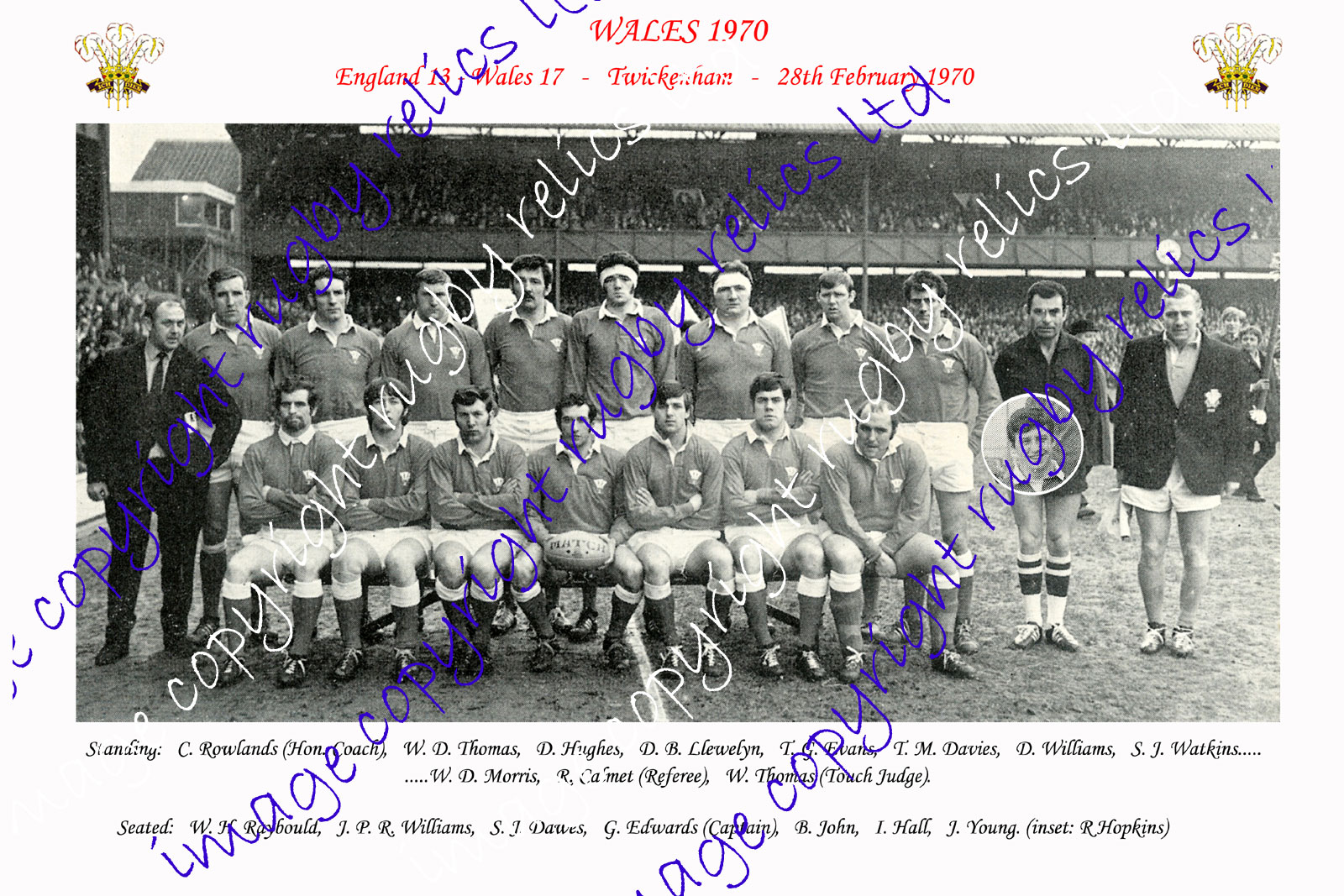 Raybould, Clive Rowlands (Coach), Air Commodore Lams (Referee), V. Perrins, B. John, J. Williams, Gareth Edwards (Captain), J. Dawes, P. Bennett, I. Hall.