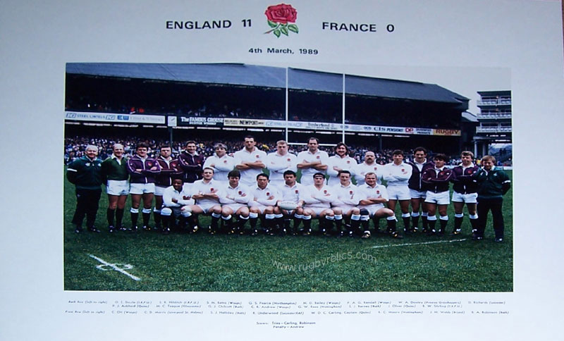 S D Hodgkinson (Nottingham), D Pears (Harlequins), N J Heslop (Orrell), C D Morris (Orrell), P A G Rendall (Wasps), G W Rees (Nottingham), J Leonard (Harlequins), B C Moore (Harlequins), J C Oliver (Northampton), D Richards (Leicester), M C Teague (Gloucester), M G Skinner (Harlequins), P. J Ackford (Harlequins), W A Dooley (Preston Grasshoppers), N C Redman (Bath), J M Webb (Bath), G S Pearce (Northampton), Dr L B C Gilfeather (Hon. Physician), R J Hill (Bath), J C Guscott (Bath), R Underwood (Leicester R.A.F), R M Uttley (Hon. National Coach) W D C Carling (Harlequins) (Captain), G D Cooke (Hon. Team Manager), P J Winterbottom (Harlequins), J J Elliott ( Hon England Selector), C R Andrew (Wasps), K Murphy (hon. Physiotherapist)