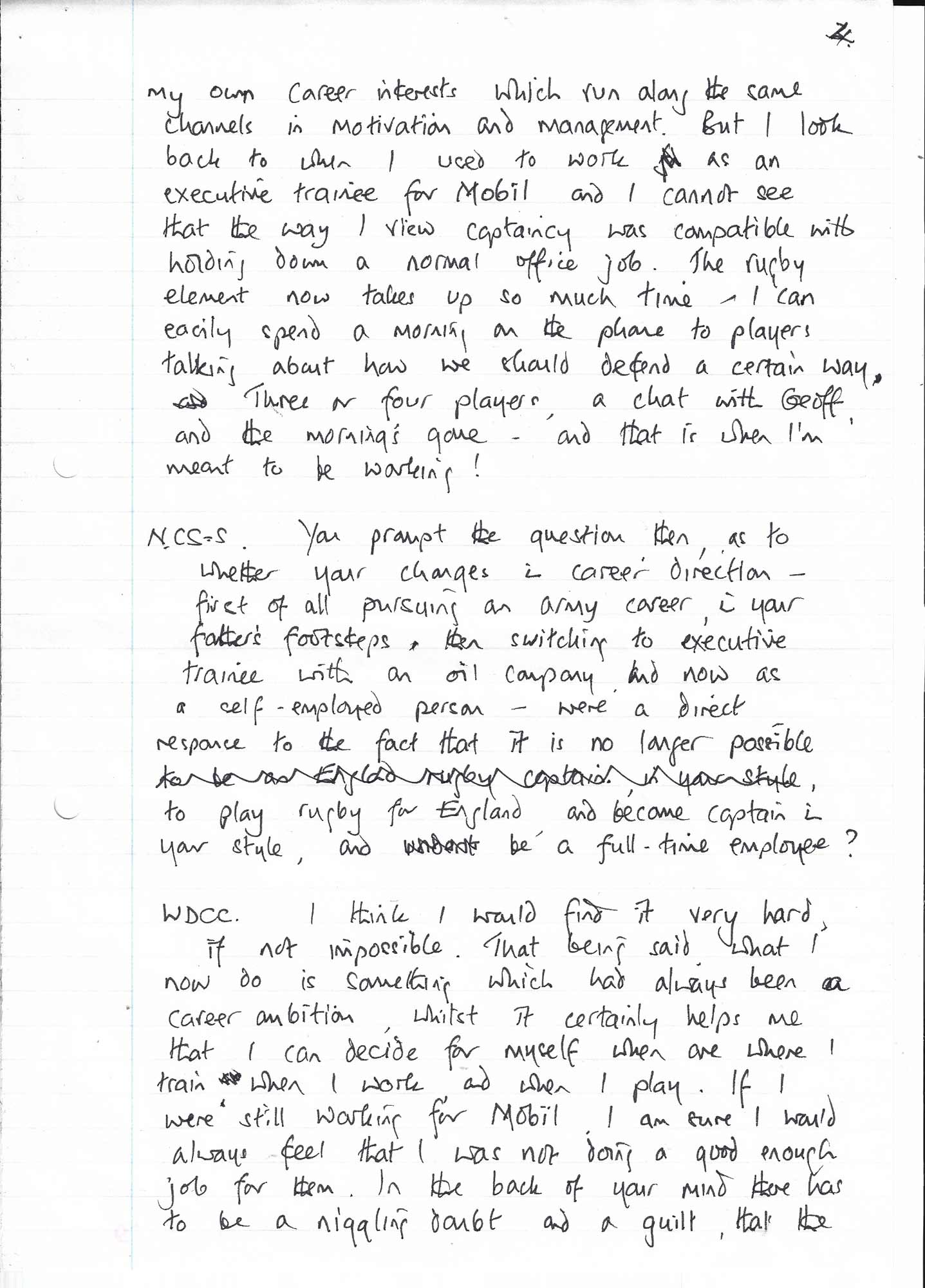 A series of handwritten sheets consisting of an interview with Will Carling, the England captain by the former England scrum half and editor of Rugby World, Nigel Starmer-Smith. The interview conducted before the game turned professional looks at Carling's role as a young captain (aged 22), how he integrates rugby with his work, his business, style of leadership, playing under the coaching regime of Geoff Cooke and about the prospect of the sport turning professional. 10 pages. |