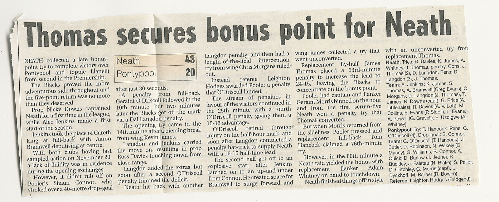 Neath v Newport | 5 Dec 2009 | The Gnoll, Neath | 21-13 | match report | |