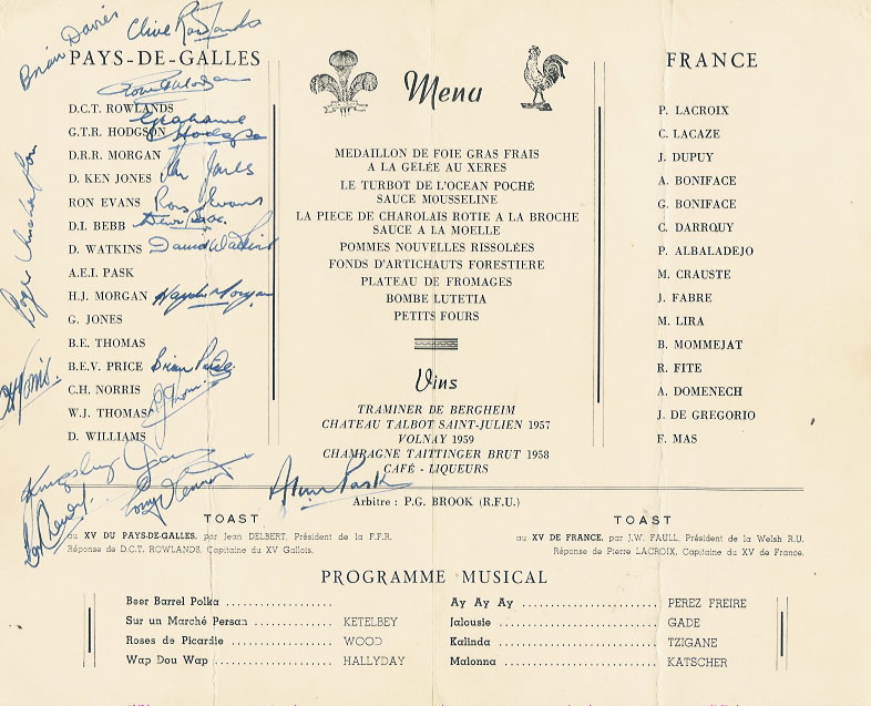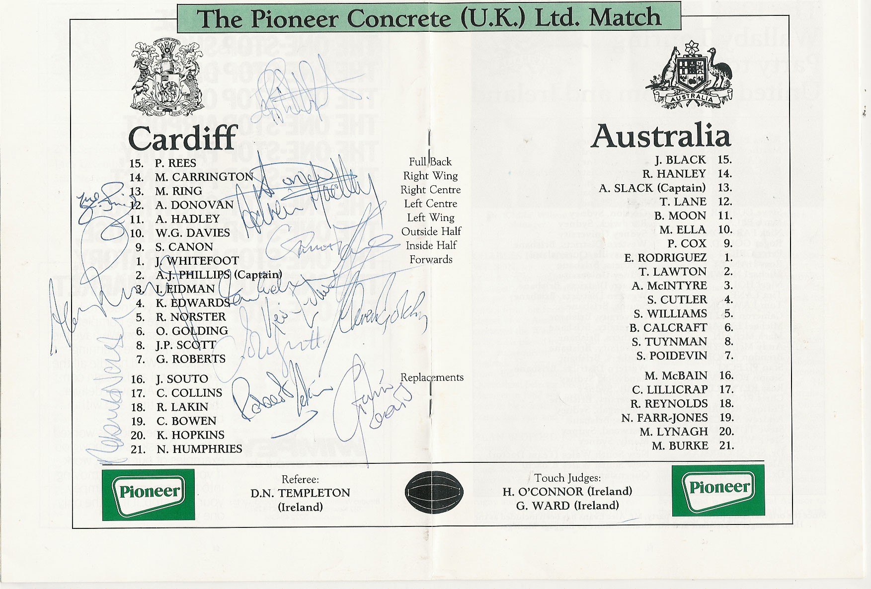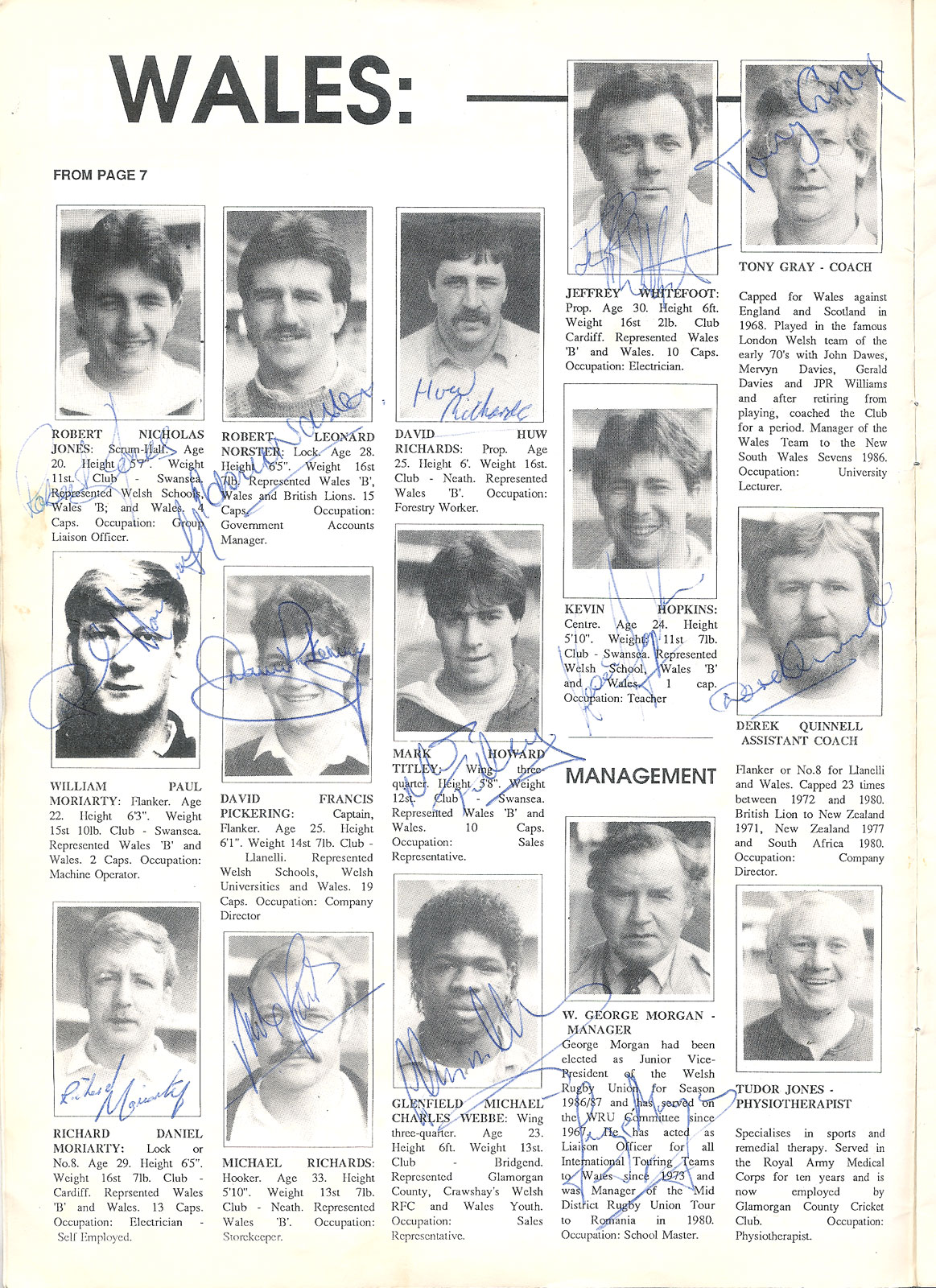 FIJI v WALES 31 May 1986 FULLY SIGNED PROGRAMME, 58 AUTOGRAPHS - A programme from the Fiji v Wales 1986 match played at the National Stadium in Suva during the 1986 Welsh tour of the South Sea Islands. The programme is autographed over individual player profiles and middle pages by 29 members of the Welsh tour party (only the physio is missing) and the complete Fijian squad and management (29). This programme is in good condition and it is accompanied by a COA guaranteeing that the autographs are original and authentic. Ref: PL49-auprinfu.fjwa1986au1958 - £150.00 |