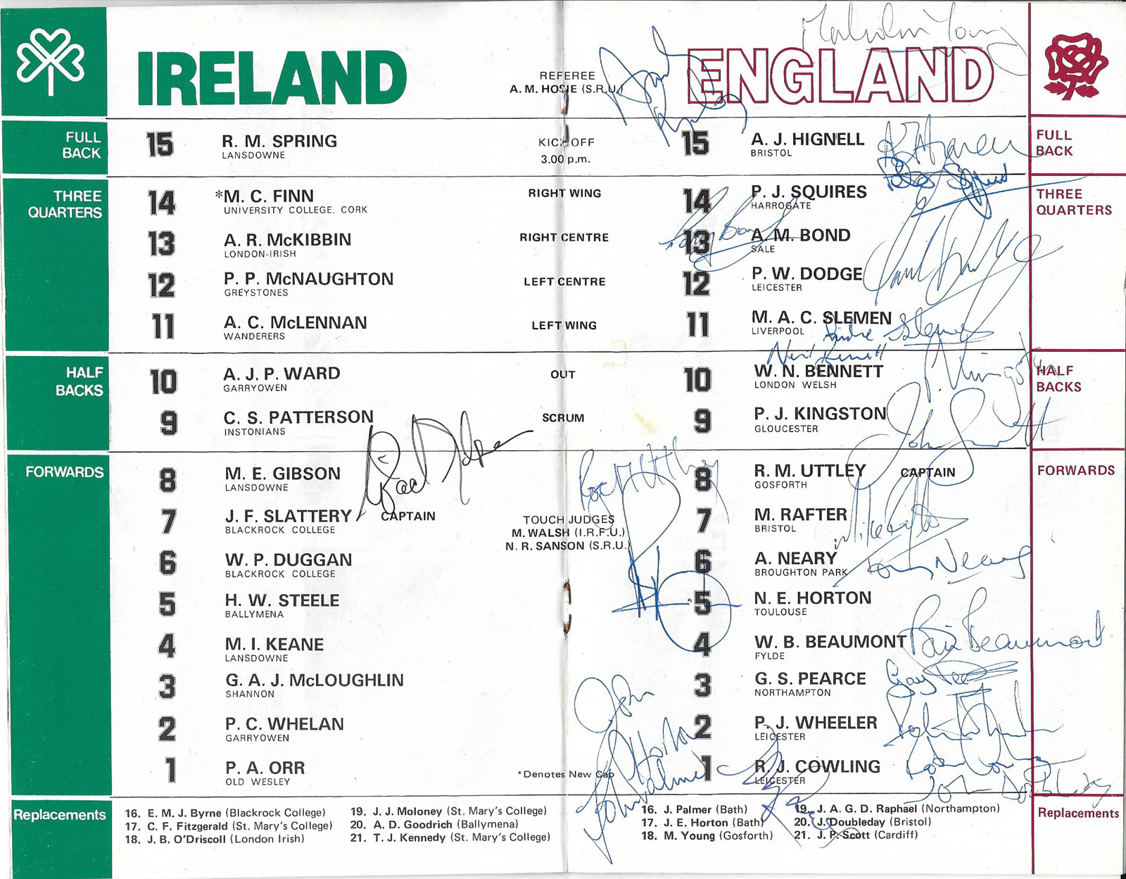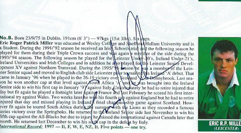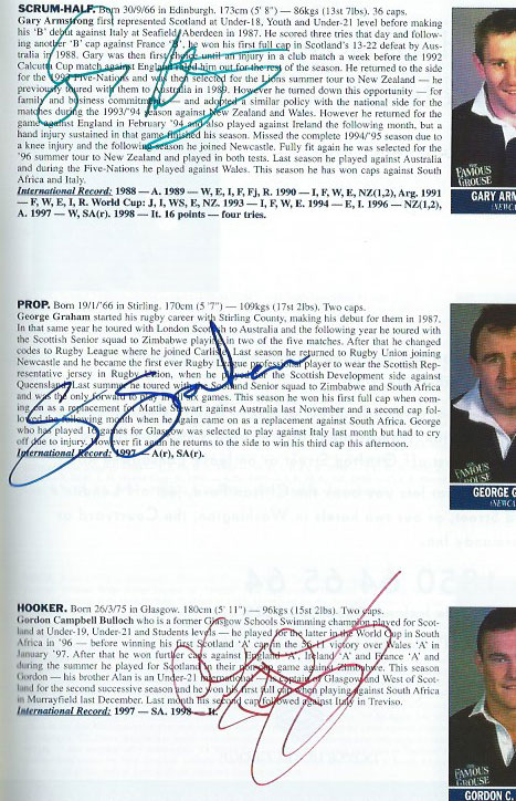 IRELAND v SCOTLAND 7 Feb 1998 SIGNED PROGRAMME, autographed over individual player profiles by 12 of the Irish team of the 11 of the Scottish team. The players who have signed this programme include; Keith Wood, Conor O'Shea, Denis Hickie, Malcolm O'Kelly, Eric Miller, Eric Elwood, Gary Armstrong, Alan Tait, Gregor Townsend, Gordon Bulloch and David Hilton. The programme is in very good condition, it is accompanied by a COA guaranteeing that the autographs are original and authentic. Ref: aupringp.irsc.1998.au23 - £39.00 |