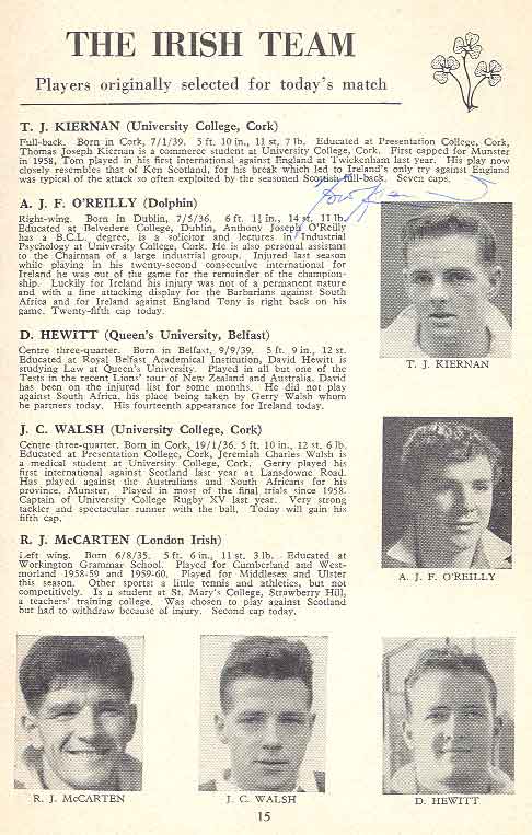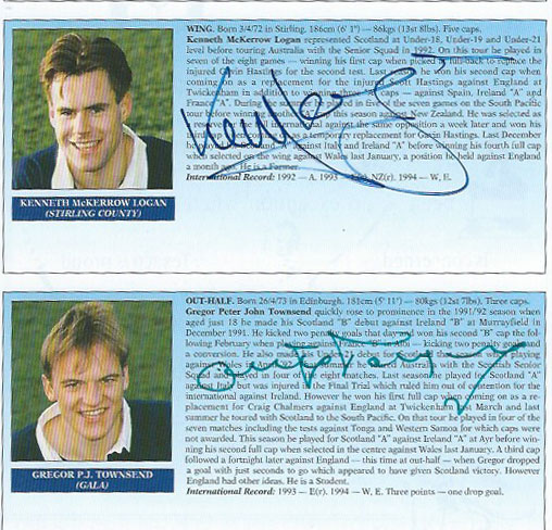 IRELAND v SCOTLAND 5 Mar 1994 SIGNED PROGRAMME, autographed over individual player profiles by 6 of the Irish team of the 7 of the Scottish team. The players who have signed this programme are as follows; M. Bradley (Capt), E. Elwood, T. Kingston, P. Clohessy, M. Galwey, C. O'Shea, T. Stanger, K. Logan, G. Townsend, G Armstrong, S. Munro, B. Redpath and P. Wright. The programme is in very good condition, it is accompanied by a COA guaranteeing that the autographs are original and authentic. Ref: aupringp.irsc.1994.au13 - £19.00 |